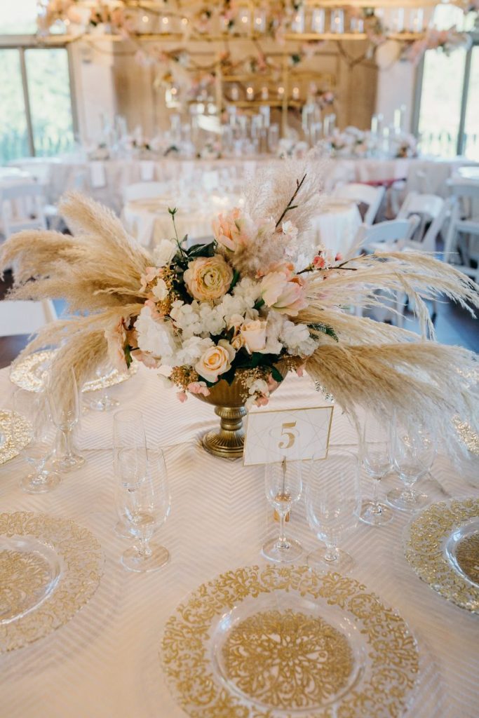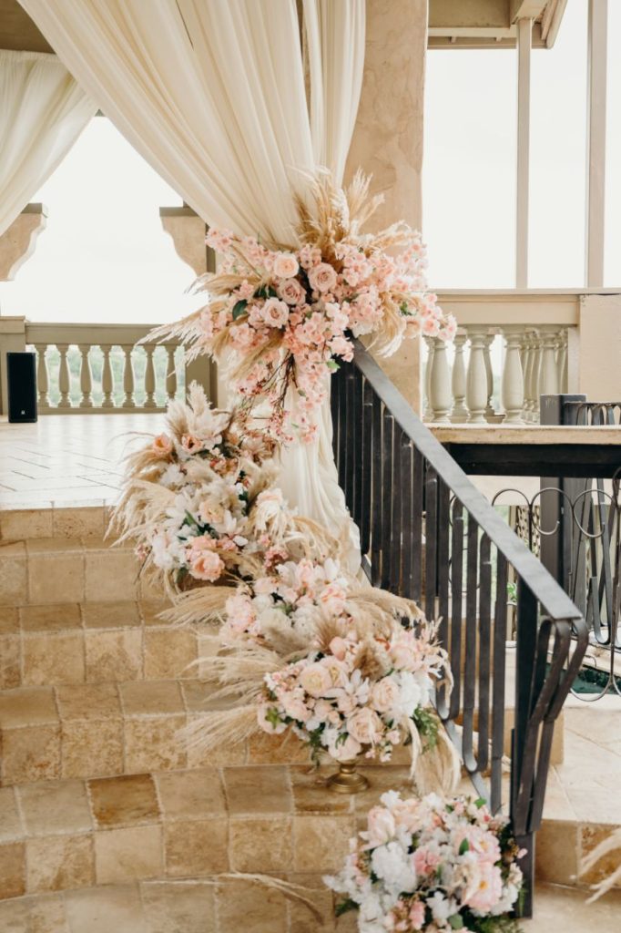 Samara and Mark’s evening ceremony included an outfit change by the bride and groom. Samara slipped into a beautiful sleeved lace gown while her dashing groom changed into a black-tie suit. Their second ceremony took place on the outdoor deck with blooming white and rose florals accented by pampas grass—breathtaking floral arrangements. Samara changed into a fuller gown with floral detailing following the outdoor ceremony. A definite show-stopping dress! Surrounded by family and friends they hadn’t seen due to the pandemic, Samara and Mark enjoyed catching up with their guests while everyone enjoyed a dinner from Austin Catering. Lindsay at In Her Shoes made sure the entire day ran smoothly from start to finish, so it is no surprise that she was the couple’s most helpful wedding vendor. There are so many more charming and romantic images below. Keep scrolling to see more.