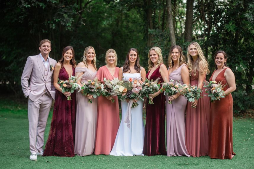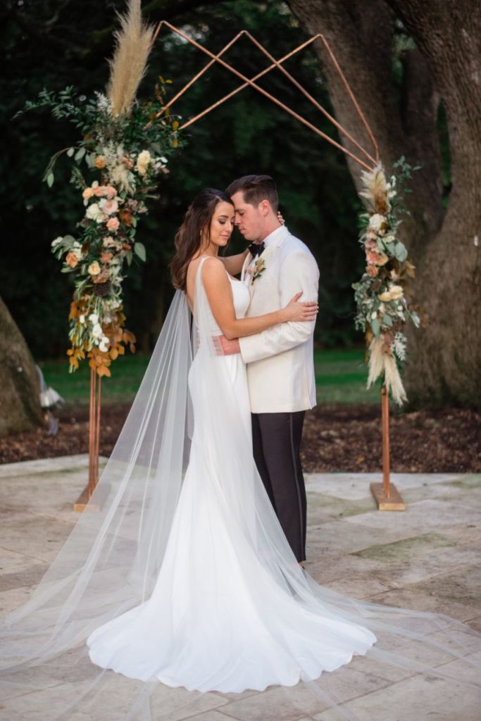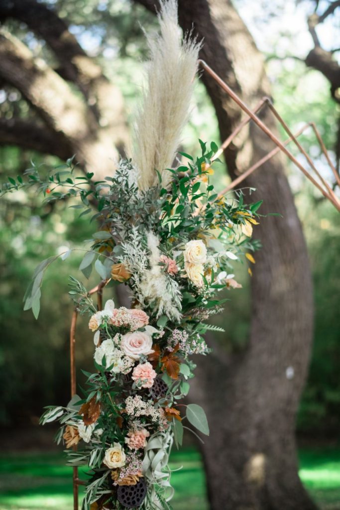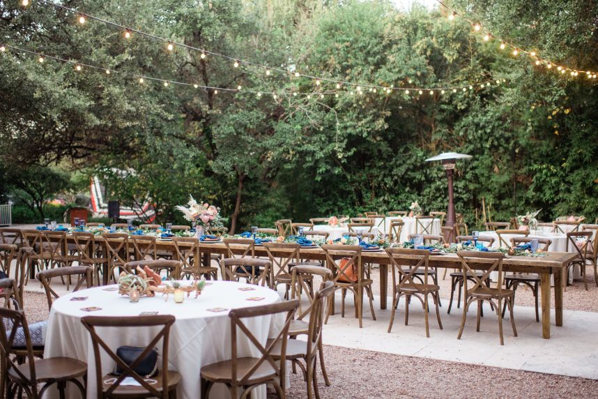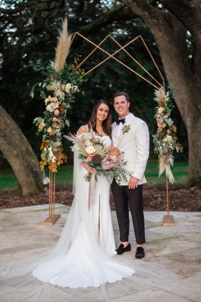Logan and Patrick’s wedding brought stunning shades of a Santa Fe, New Mexico, sunset straight to Austin! Lovely Day Events was the wedding planner who helped bring the bride’s dream of burnt oranges, pinks, blues, yellows and greens to life. With the help of Bella by Sara, a magnificent modern, geometric copper altar with a pampas grass and floral embrace set the scene for this couple’s “I do.” Logan, the beautiful bride, prepped for her big day with Bells and Barbells Wedding Fitness. She was ready to take on the aisle with her bridesmaids, who wore all sorts of different sunset shades, adding to all the stunning Santa Fe highlights. Whim Hospitality took the flower game to a whole new level, from the jaw-dropping altar to the colorful bouquets. Seriously, it’s a proper Santa Fe wedding – there are even cacti! On Sweet Treets Bakery’s cake, the cutest prickly cactus head sat in the center of the simple light and white frosted goodness. The reception was full of wooden chairs, burnt orange plates, blue napkins and Estelle-colored glasses. Over this romantic dining experience, party lights set the scene while Premiere Events’ heaters kept the guests warm. Bartending from Drink Slingers got the party started, and Fairmont Austin’s accommodations awaited guests when the fun came to an end. For more on Mr. and Mrs. Phillip, check out the gorgeous gallery inspired by a Santa Fe sunset below, courtesy of April Mae Creative!