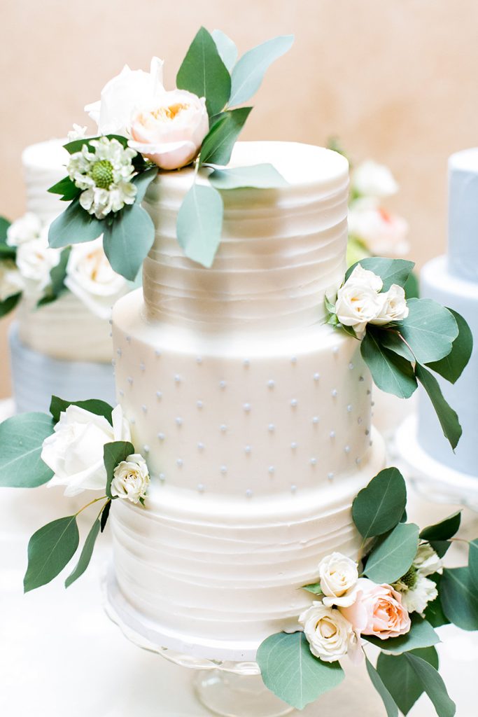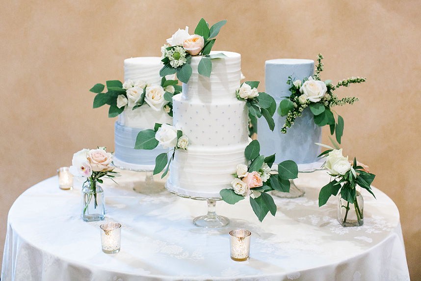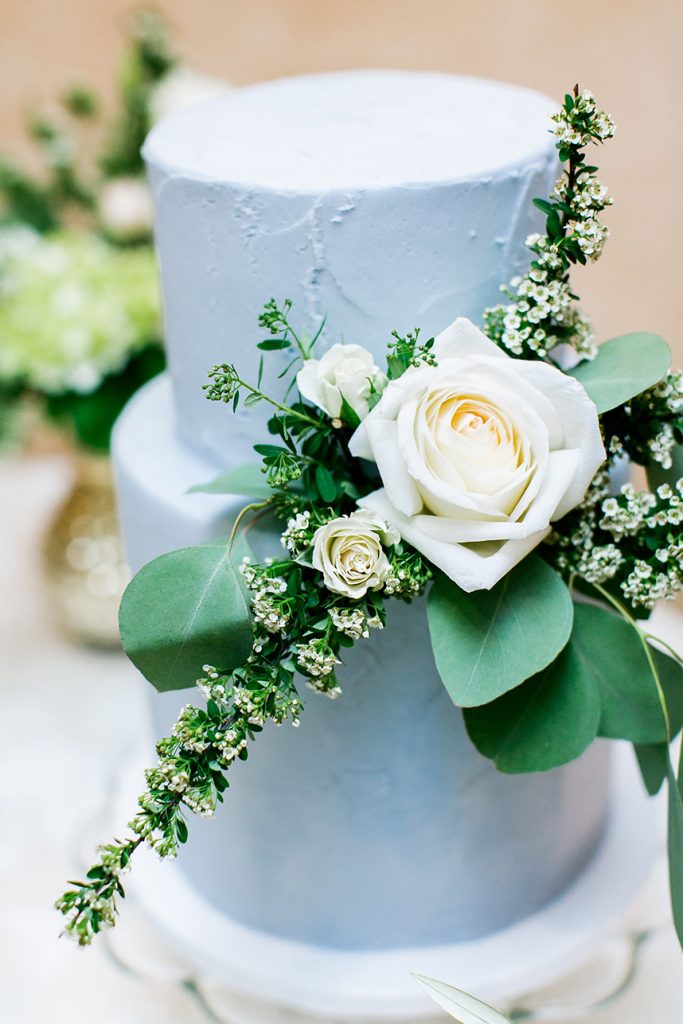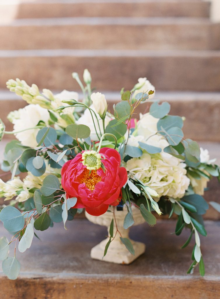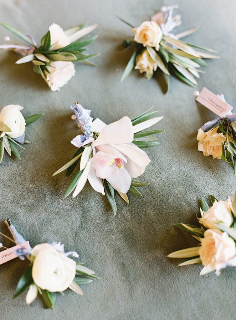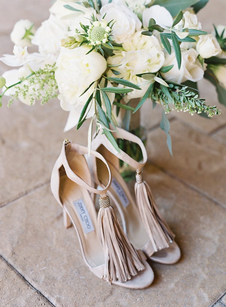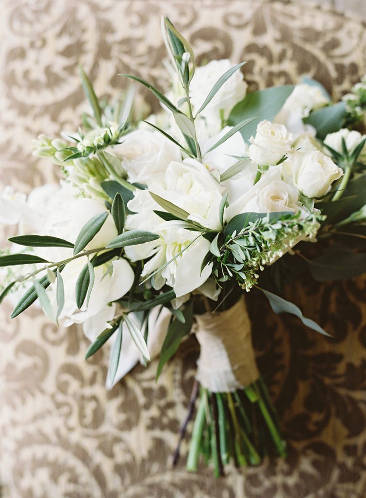 BEAUTIFUL BLOOMS: Sarah’s bouquet was a garden-inspired, hand-tied bouquet with a loose, natural feel in white and natural green tones comprised of peonies, ranunculus, scabiosa, garden roses, phalaenopsis orchids, lisianthus, sweet pea, lilac, bay laurel, eucalyptus and olive. The bouquet was tied in ivory, raw silk ribbon, and beautifully complemented Sarah’s color scheme using creams, light blues, hints of gold and pink, and whites.