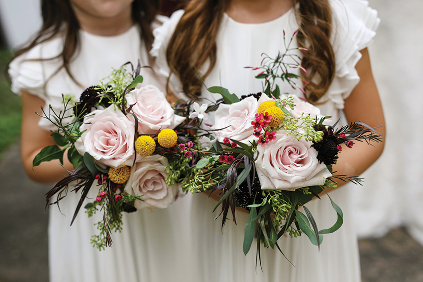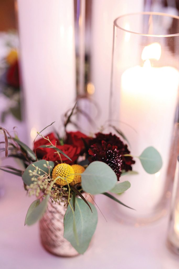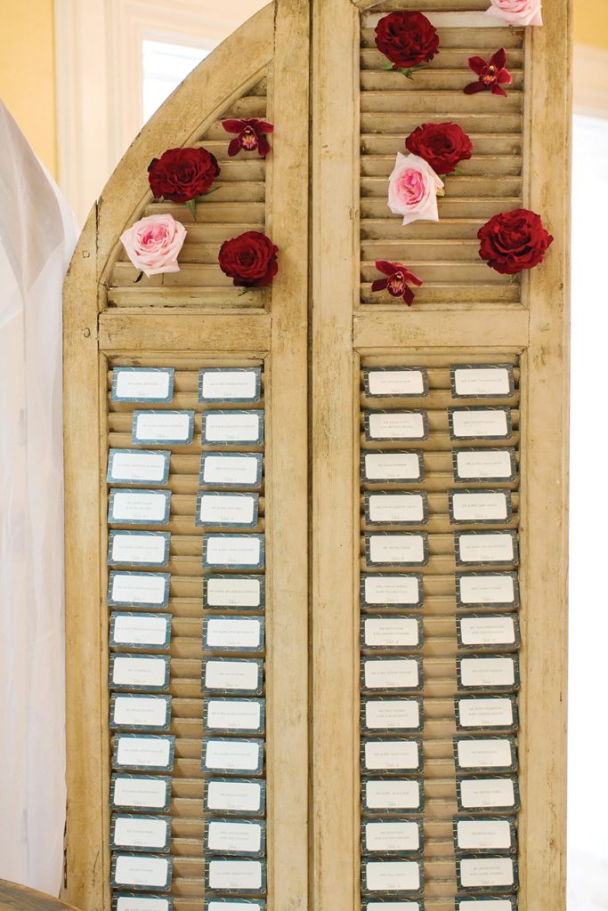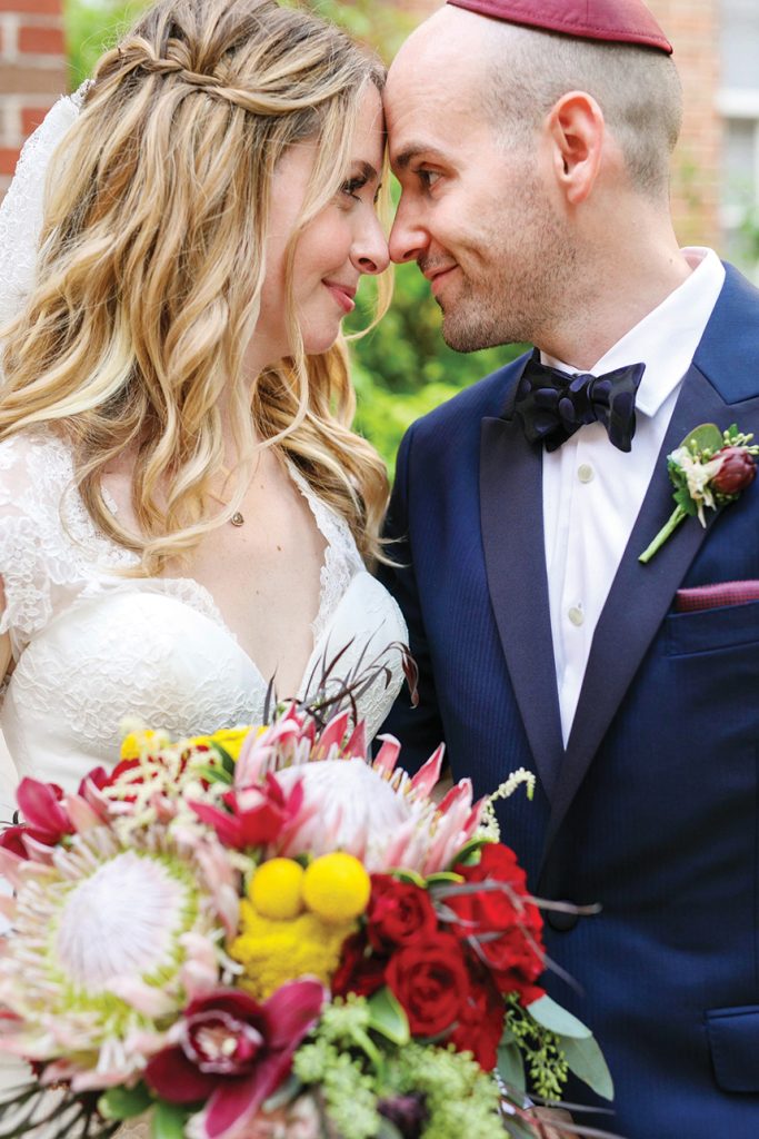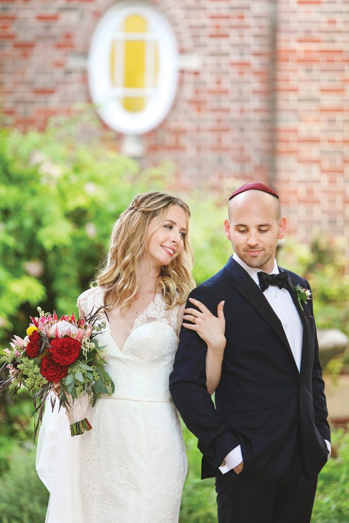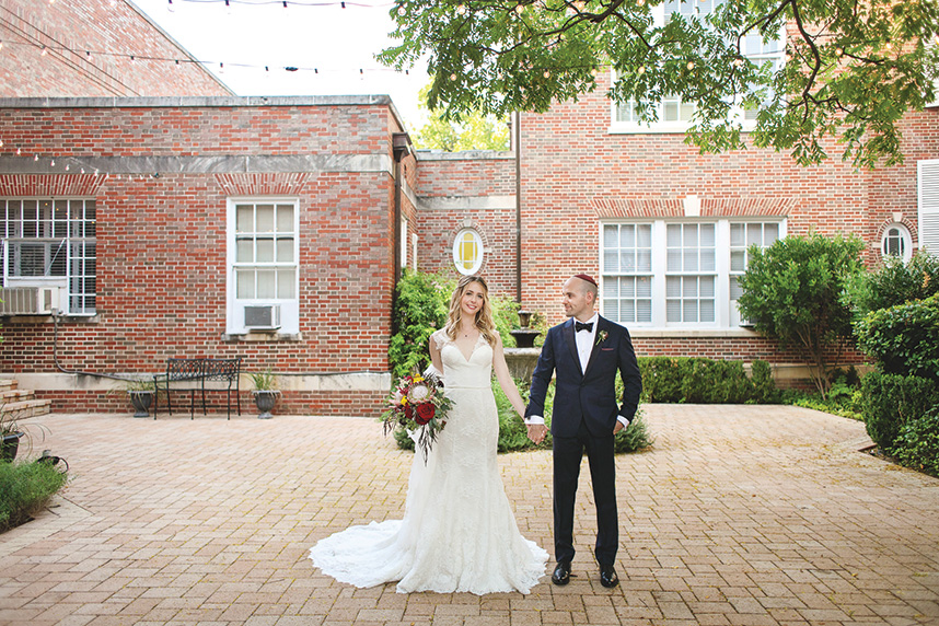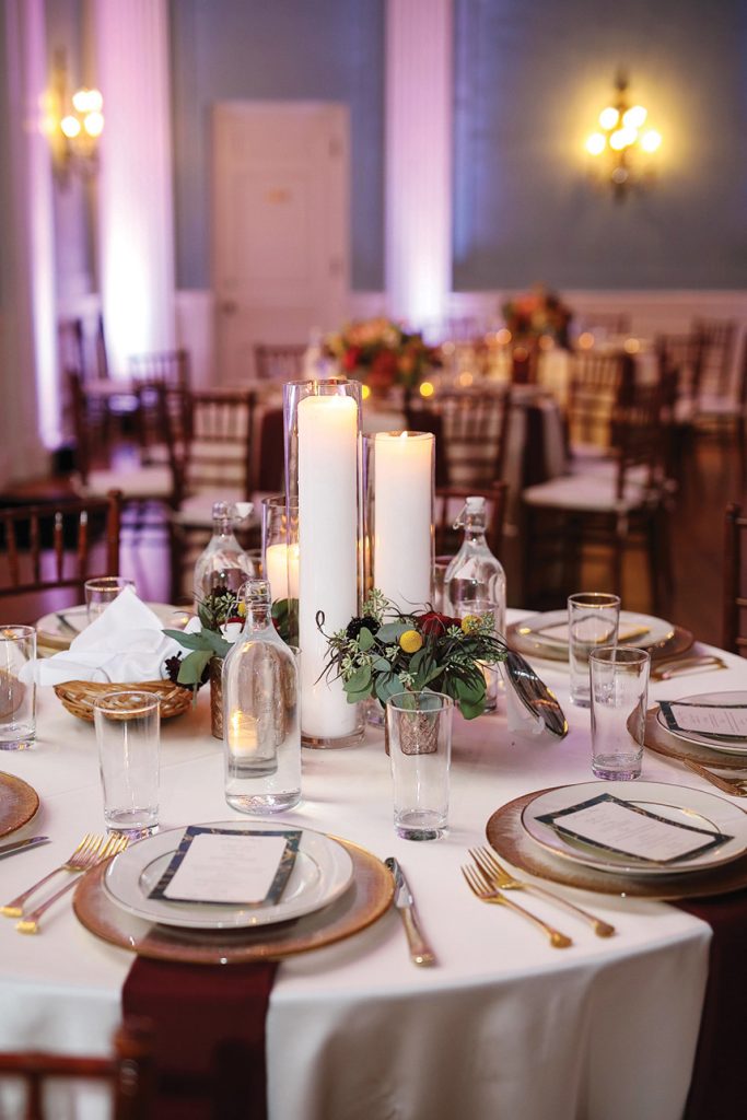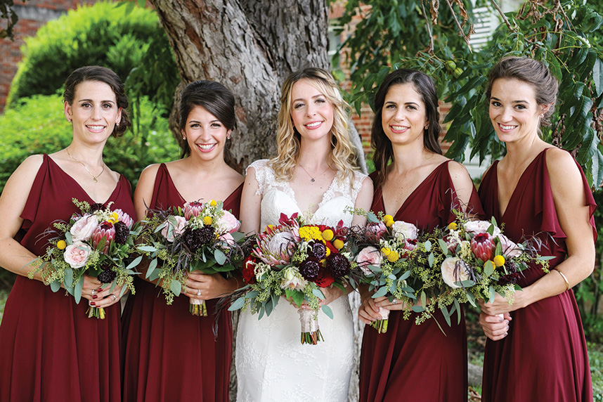 SETTING THE SCENE: The Mansion is a beautiful Jeffersonian-style estate. It has a large ballroom with a bandstand at one end, which Sarah and Gavin’s band put to great use. The couple loved the courtyard and was hoping to have an outdoor ceremony there, but decided last-minute to move the ceremony inside due to rain.