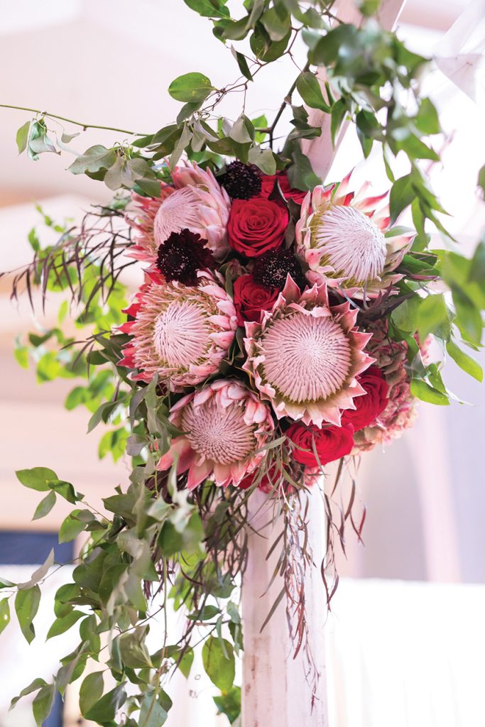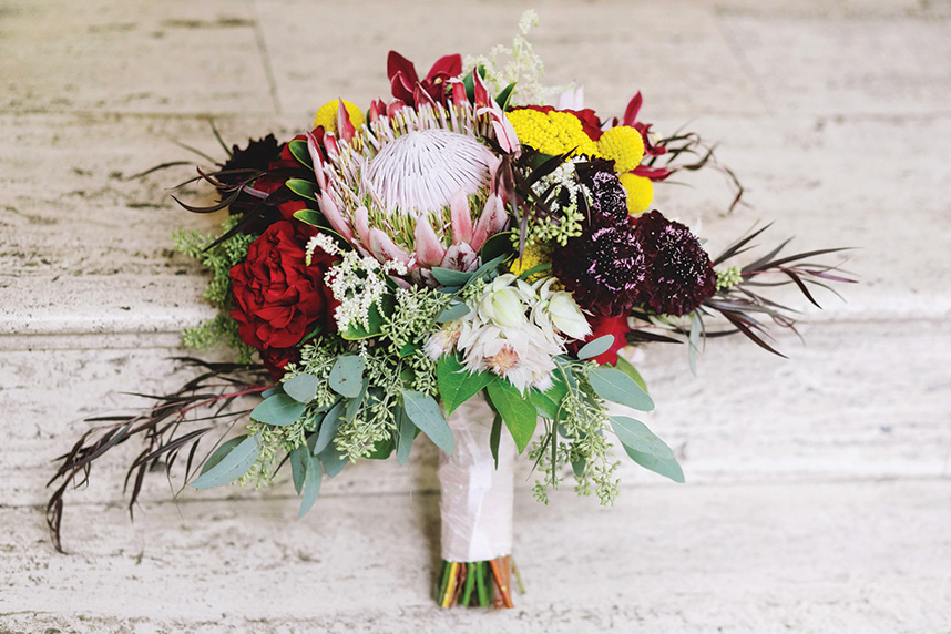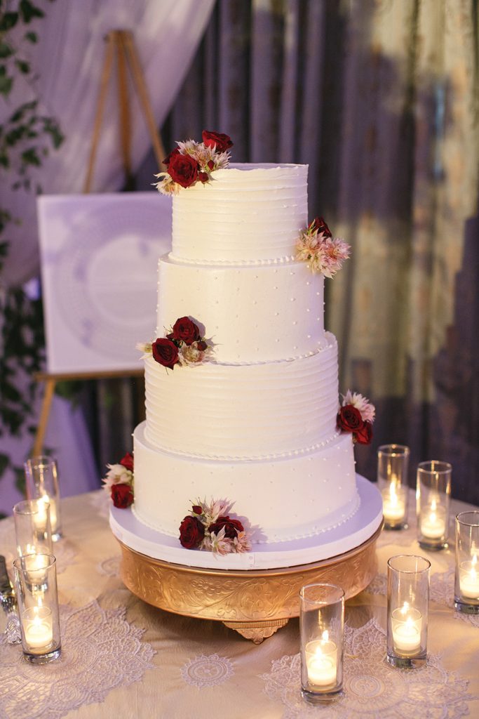 THE CAKE: Their cake was a four-tier cake from Polkadots Cupcake Factory with buttercream icing. The layers from bottom to top were mixed berry chardonnay, triple chocolate, lemon cream and strawberry cream. The icing pattern alternated by layer between Swiss dots and horizontal rustic strokes. Sarah and Gavin’s florist further decorated the cake with scattered natural blooms and a floral topper.