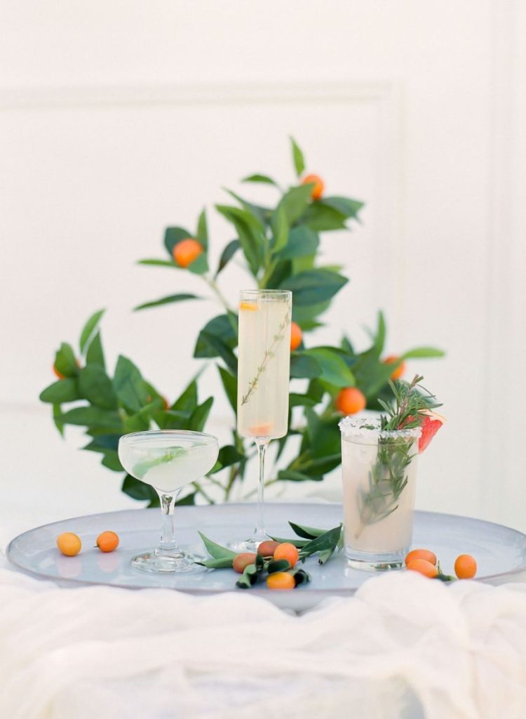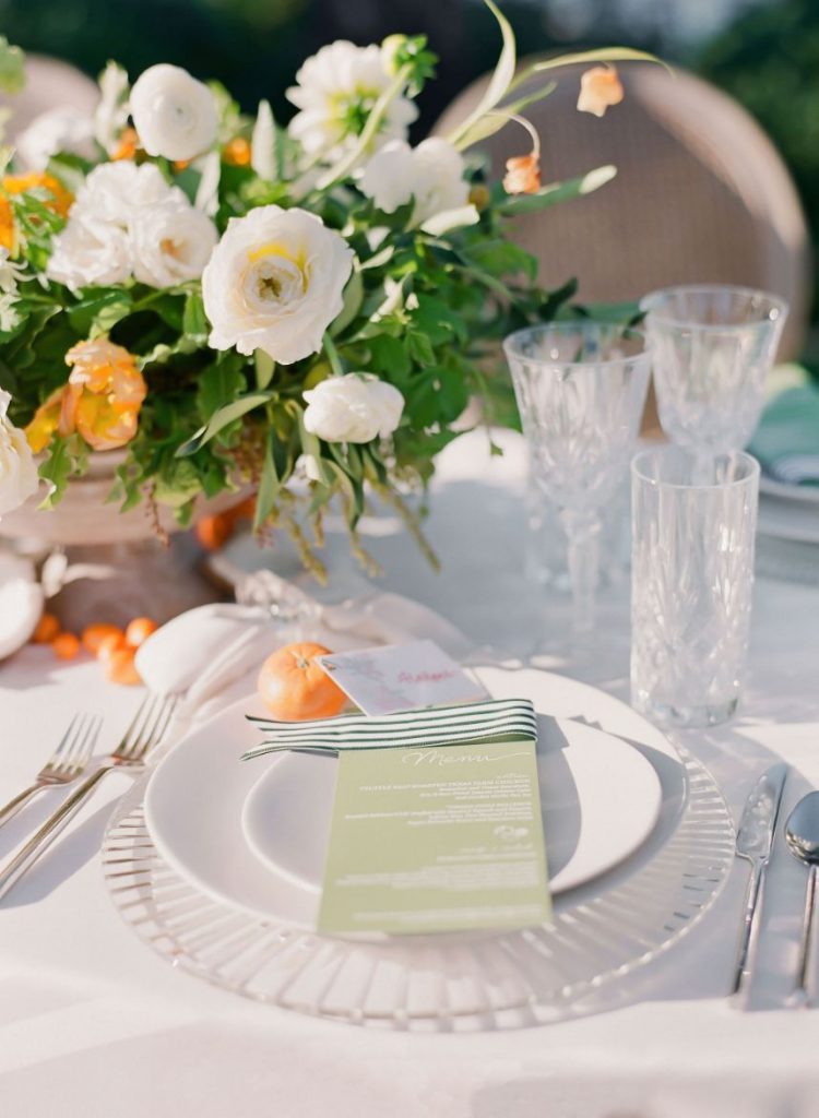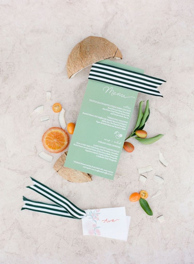 From the calligrapher, Christine of Grey Meets Gold: “I wanted to design an invitation suite and paper goods that were focused on the modern minimalist couple. I kept everything soft and subtle with a heavy-weight cardstock and plush letterpress in a beautiful subtle green color for the invitation card, paired with a fun preppy green striped envelope liner. I knew citrus was a huge focus but still wanted to keep it classic. So I paired a beautiful watercolor citrus print on vellum and affixed it to the wedding invitation as a fun overlay. The response card also pulls together the fun citrus theme with a kumquat-colored cardstock envelope and the cutest dainty kumquat design on the response card itself! The menu I decided to go bold but with a modern feel. The green cardstock paper and white printing with a tiny kumquat design kept the place setting fresh and modern! To tie everything together, I kept with the vellum theme for the escort cards and printed the same kumquat design on cardstock and fixed everything together with a fun grommet! I added a touch of flair with a kumquat orange calligraphy for the names!”