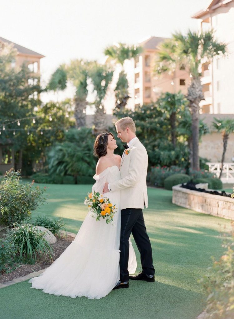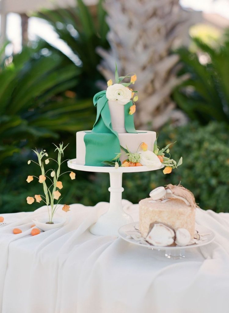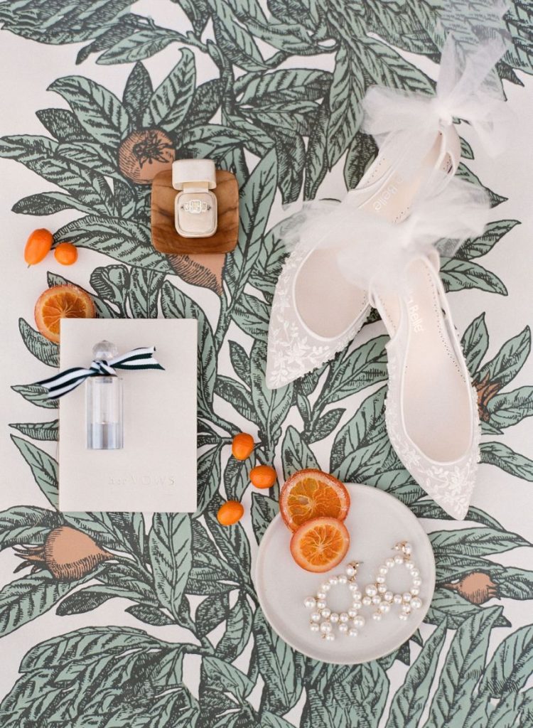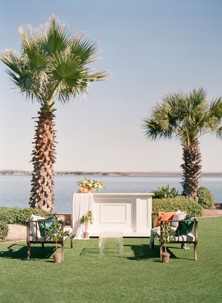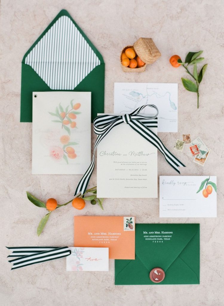 If searching for some ivy league wedding inspiration, we absolutely have you covered. This seaside sophisticate soiree planned and styled by Lauren Field Design combines some of the classiest elements and al fresco dining on the well-manicured lawn of Horseshoe Bay Resort for all the laid back luxe vibes. Sophie Epton Photography expertly captures all the details that amplify a classic East Coast design – citrus elements, herbal craft cocktails and a modern romantic bridal style. Drink Slingers are pros of mixology, creating a refreshing-looking Kumquat and Thyme Spritz made with vodka, kumquat, thyme, honey and ginger beer for this upscale affair! If that doesn’t sound like your speed, reach for their Cucumber Basil Lime Gimlet or a delicious Rosemary Paloma instead. Elegant ivory floral design by Remi + Gold blends with fun, spriggy citrus accents to add a fresh feel to the outdoor wedding scenes while understated timeless and chic design blends these centerpieces in seamlessly with the tablescapes they belong to. Cane-back King Louis chairs, textured linens, and stately place settings from Premiere Events all prepare for an exquisite experience ahead. A simplistic cake design by 2Tarts Bakery accented in fresh florals is draped in emerald fondant that looks almost too good to eat – of course, we are having a slice anyway! The prettiest paperie and custom calligraphy provided by Grey Meets Gold brought sunshine to this shoot, and these suites look so chic in shades of cheery kumquat accented with preppy stripes and pops of kelly green. This bride stuns with a warm, classic bridal eye and natural coral lip created by Think Brink Beauty as well as classic curls with a pearl-studded headband. Her off-the-shoulder Alena Leena Bridal “Armeria” gown from Serendipity Bridal featured a delicate crinoline bustier and corset finished with a modern geometric cut-out décolleté. We adore her finished look, adorned with opulent jewelry from Nicole Mera like the asscher-cut diamond necklace on DBY chain, the 2.00ct radiant fancy yellow diamond ring or the petite shared prong band to name a few. Read on for notes from the planners as well as the calligrapher about the vision behind this seaside sophisticate style and design as well as the beautiful paper goods that made it so personal. Cheers!