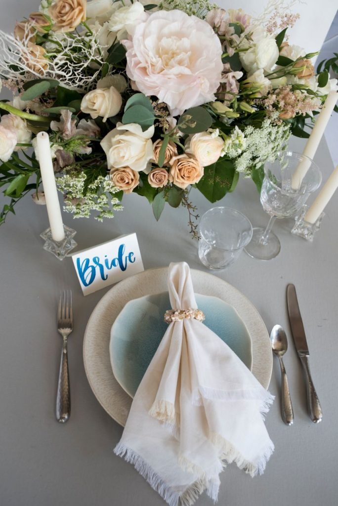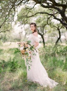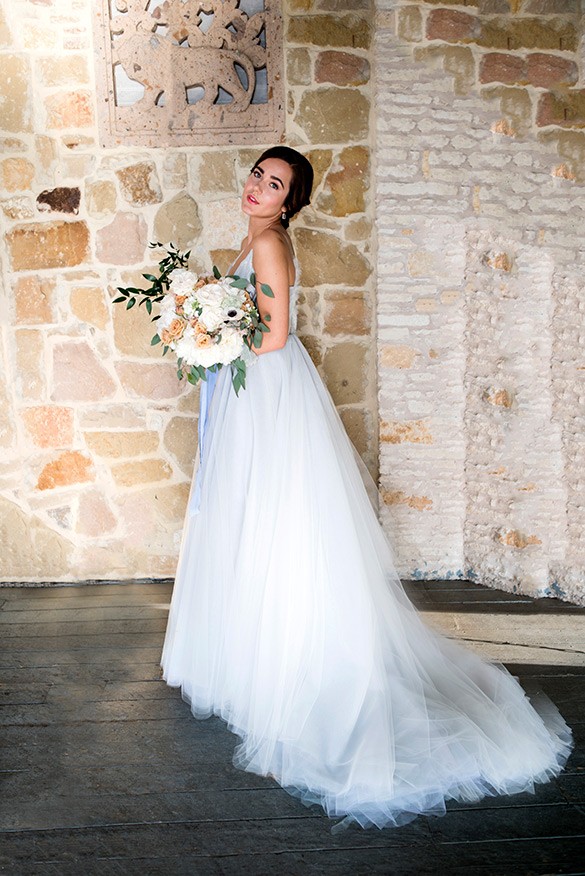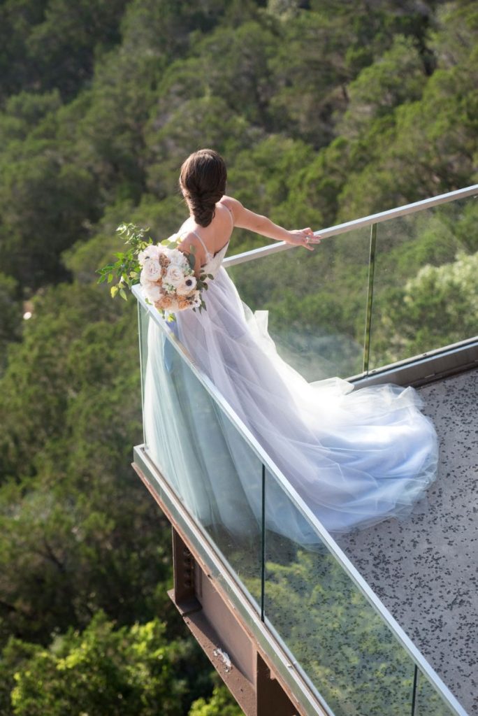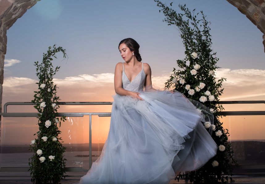 There’s nothing we love more than those watercolor skies that bless us every summer. Combined with an unbelievable view of Lake Travis via The Oasis, and a dreamy, seaside color palette, this styled shoot is giving us ALL the sunset wedding inspiration. Whimsical, bold calligraphy from Bailey Rose Design added some pop to the accompanying soft, beachy place setting. Breed & Co provided the stoneware with a sea glass like glaze – perfect for the occasion! The floral design incorporated warm and cool colors, mimicking the tones of the beach and sand. Malleret Designs artistically combined honey colored roses with pale pink peonies for the look. The bridal style was perfectly curated; a tulle dress in the faintest hue of blue from Unbridaled was understated, yet eye-catching. Eliza Page provided a unique ring with a stone to match the gown – soft blue with a distinct uniqueness. The beauty look from Level 12 Salon was effortlessly feminine, pairing a soft, low bun and natural makeup for an ideal elegance. Sasha Haagensen worked her sunset wedding magic and captured some of the most stunning photos! You don’t want to miss this!