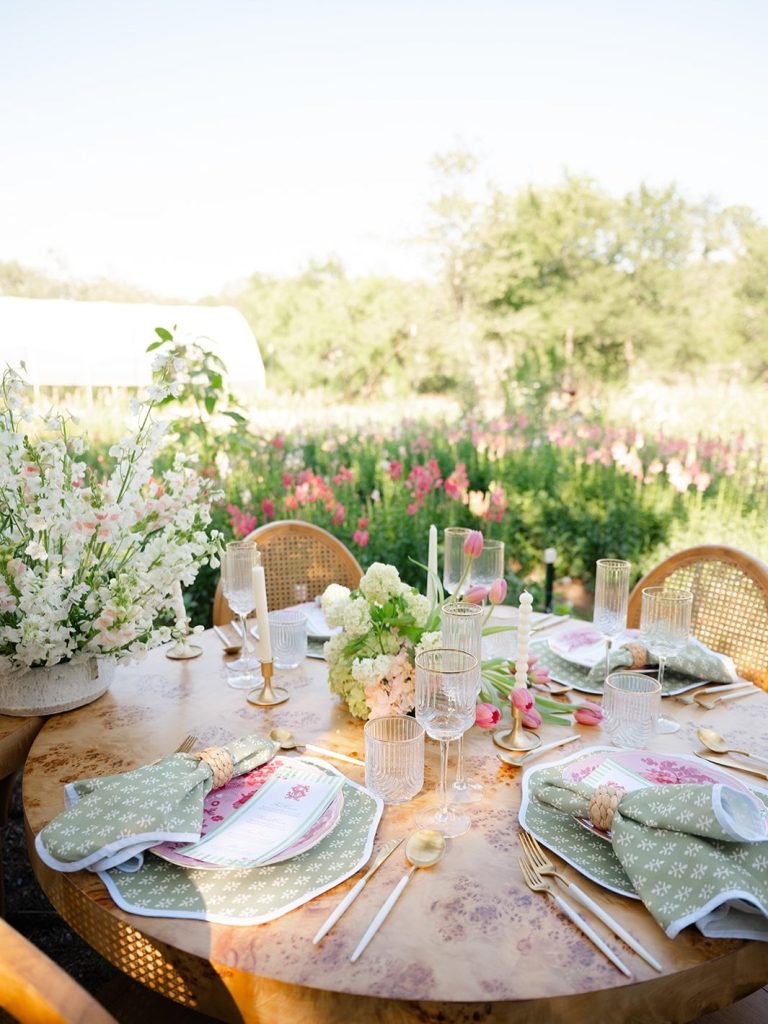 This secret garden–inspired shoot, beautifully planned and designed by Kailee Roberts Design, brought magic outdoors with a gorgeous burl wood table, cane seating, playful green and pink patterns, tulips, and tapered candles. 🌷👒