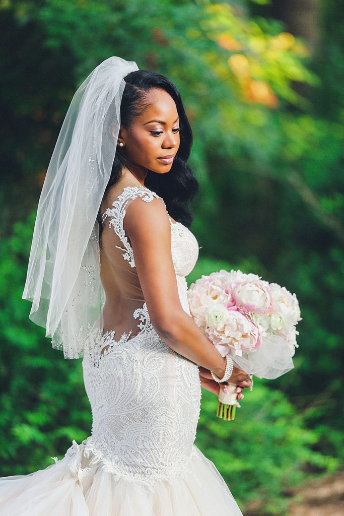 GET HER LOOK: The bride wore a Galia Lahav Loretta gown with a body-exuding bodice and an extravagant tulle skirt with a detachable train. The dress was a combination of blush and ivory made of crochet ivory lace and embellished with pearls and crystals. Shari borrowed her veil from her sister, which was a blush waist-length veil embellished with crystals around the trim. She finished off her look with Tiffany pearl earrings and a dazzling bracelet.