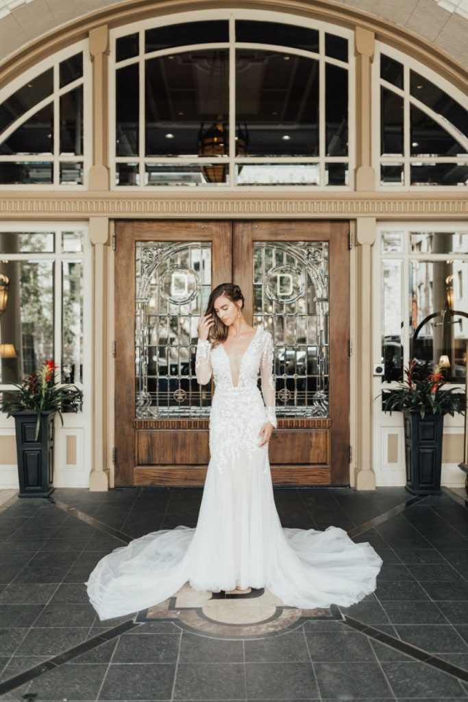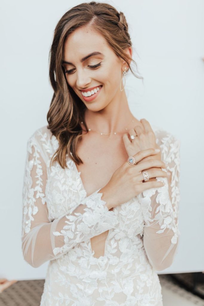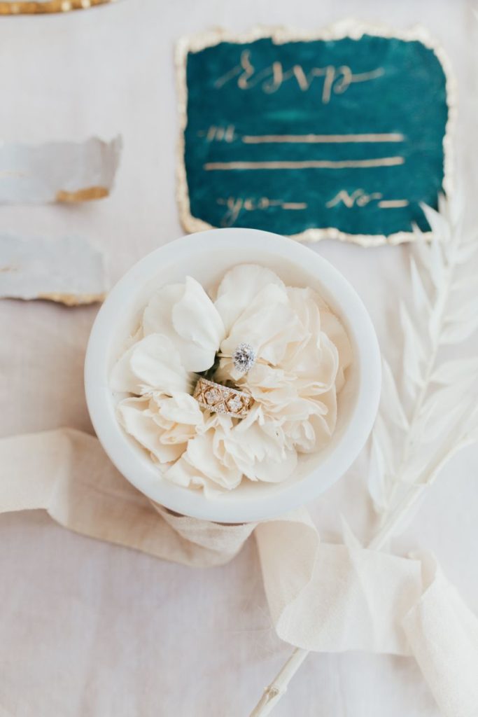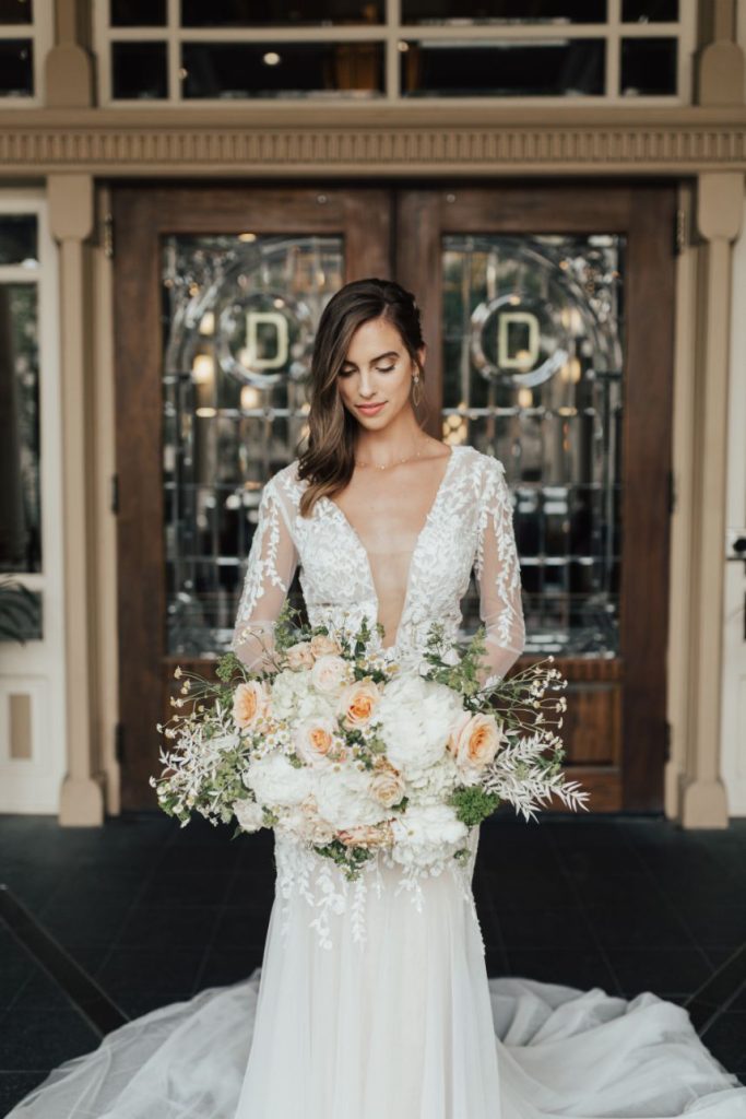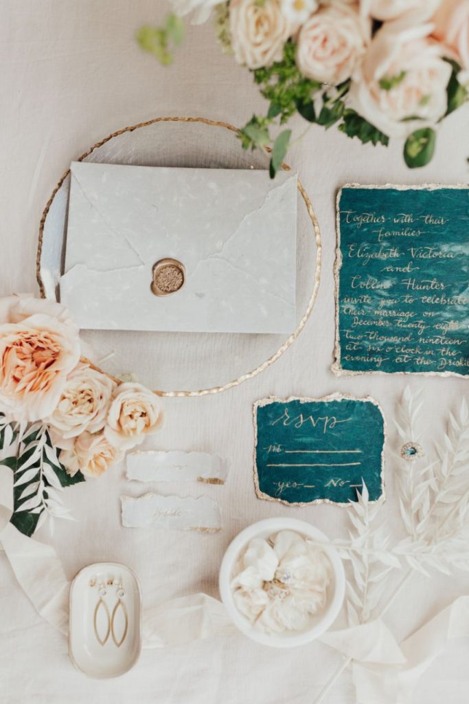 Elegant and romantic, soft and bohemian – all words that came to mind when we saw this “something blue” editorial. The most classic of Austin wedding venues, The Driskill, served as the backdrop for this dreamy photoshoot. It’s traditional architecture and art deco style interior were the perfect accents to every curated detail. The unique bridal gown from Blush Bridal Lounge featured climbing embroidery designs, a flowing train and deep-V neckline. Delicate bridal makeup paired with a unique, free-spirited hairstyle was an impeccable contrast – bravo, flAir Style Lounge! Benold’s Jewelers adorned the bride in beautiful gold jewels that emulated vintage glamour. Teal invitations with a deckle-edged, gold leaf border from Grey Meets Gold took “something blue” to a new level, creating a glamorous boho vibe that was visible throughout the table setting as well. A golden wax-sealed menu added some extra romance atop a teal napkin and gold accented place setting from Breed & Co. For the cherry on top, Flor Amor designed show stopping bouquets featuring peach roses, garden greens and extravagant white peonies! Thanks to Elle Reaux Photography for capturing beautiful images of the day – scroll below to see more!