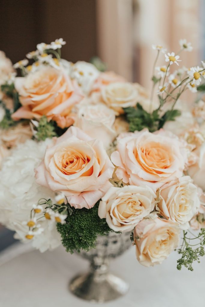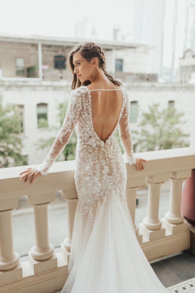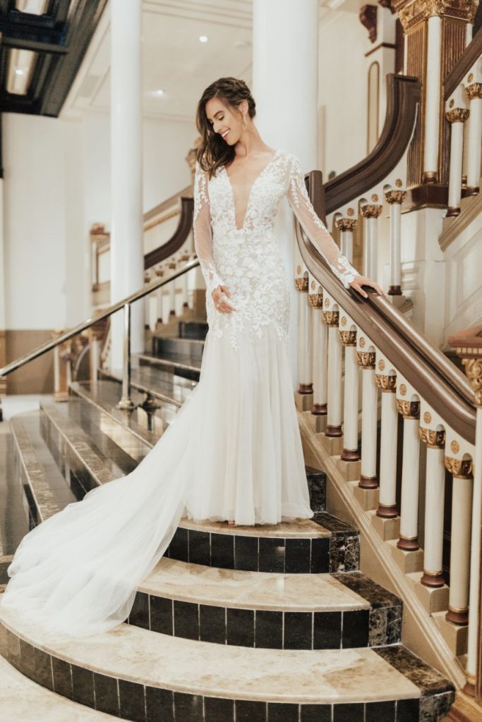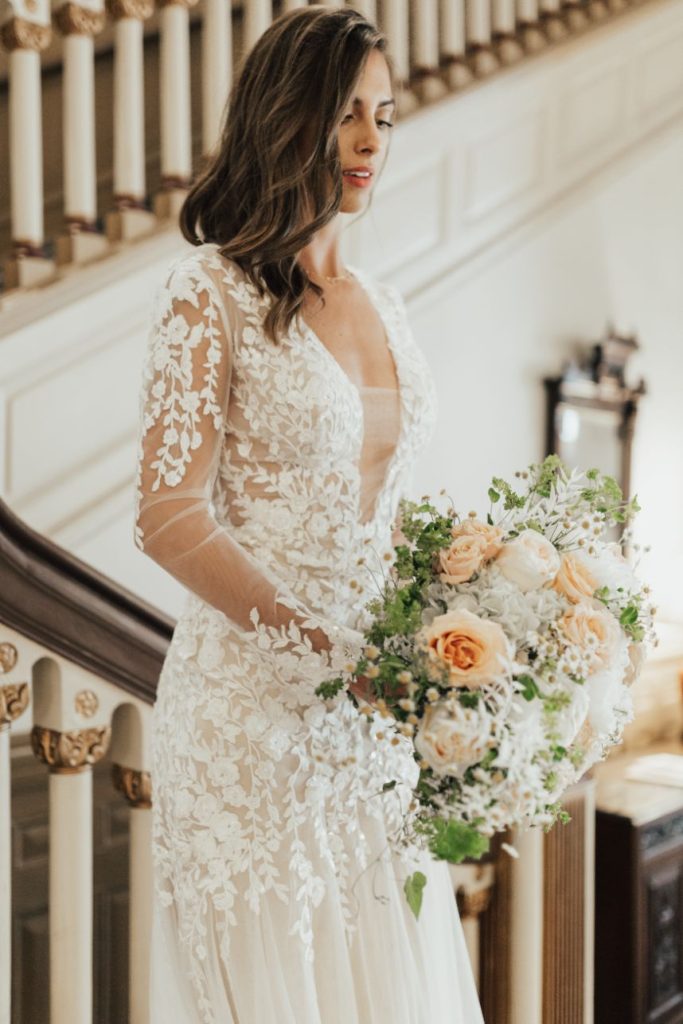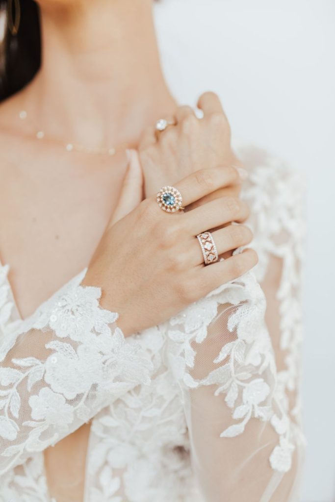 Elegant and romantic, soft and bohemian – all words that came to mind when we saw this “something blue” editorial. The most classic of Austin wedding venues, The Driskill, served as the backdrop for this dreamy photoshoot. It’s traditional architecture and art deco style interior were the perfect accents to every curated detail. The unique bridal gown from Blush Bridal Lounge featured climbing embroidery designs, a flowing train and deep-V neckline. Delicate bridal makeup paired with a unique, free-spirited hairstyle was an impeccable contrast – bravo, flAir Style Lounge! Benold’s Jewelers adorned the bride in beautiful gold jewels that emulated vintage glamour. Teal invitations with a deckle-edged, gold leaf border from Grey Meets Gold took “something blue” to a new level, creating a glamorous boho vibe that was visible throughout the table setting as well. A golden wax-sealed menu added some extra romance atop a teal napkin and gold accented place setting from Breed & Co. For the cherry on top, Flor Amor designed show stopping bouquets featuring peach roses, garden greens and extravagant white peonies! Thanks to Elle Reaux Photography for capturing beautiful images of the day – scroll below to see more!
