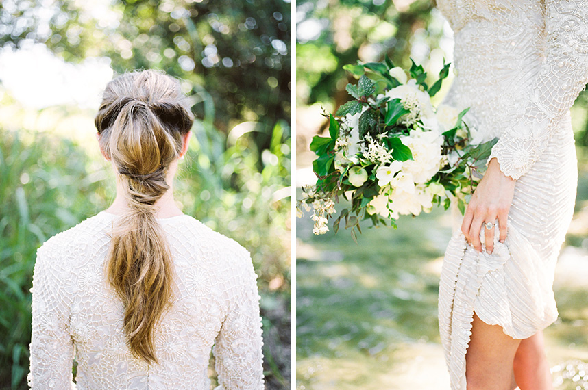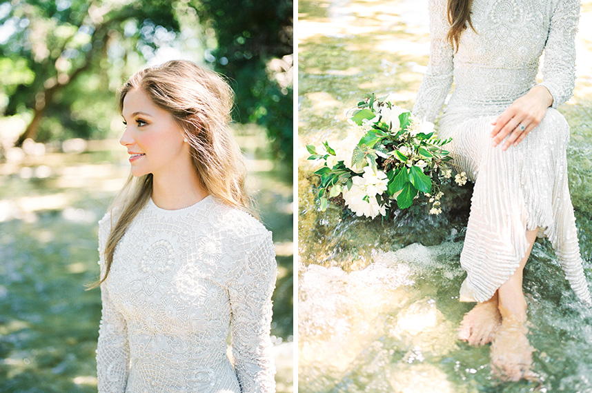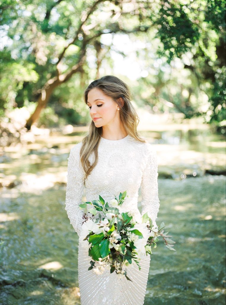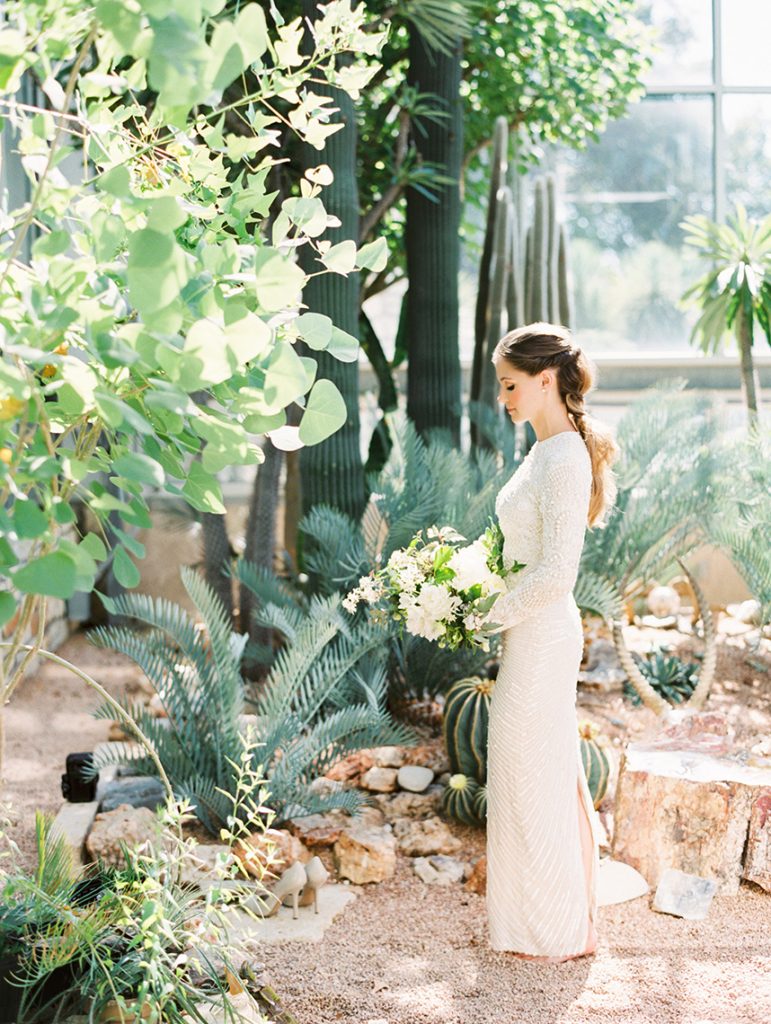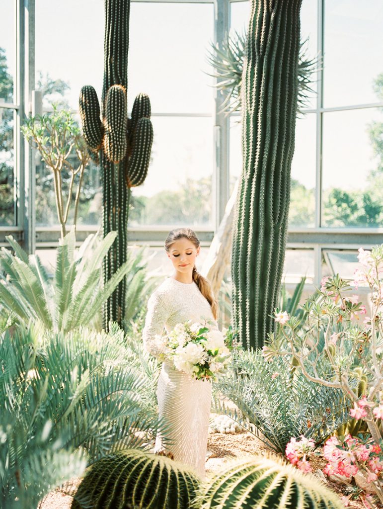 The lush greenery and captivating cacti at The Greenhouse at Driftwood made a powerful statement in this styled greenhouse bridal shoot photographed by Ashley Bosnick Photography. This serene and natural shoot inspired by all the scenery the Hill Country has to offer and styled by 36th Street Events grabbed our attention right away. The intricately-beaded Gossamer gown popped in a background overflowing with greens. The detailing on this vintage wedding dress design paired with the bride’s laid-back hair and makeup left us speechless. We hope you’re as inspired by this breathtaking shoot as we are! Enjoy!