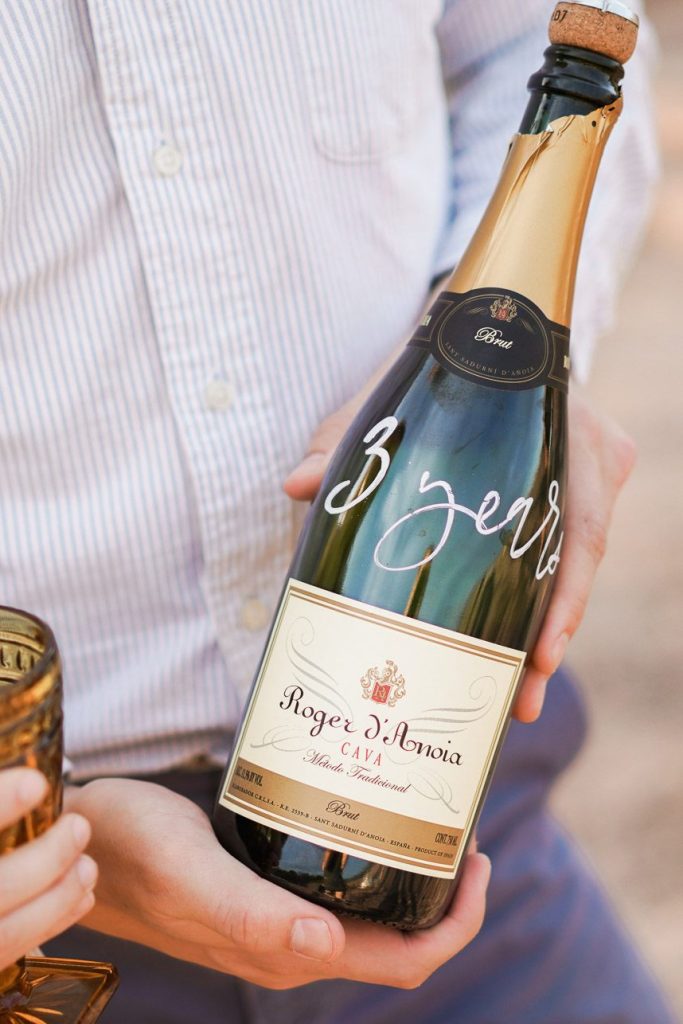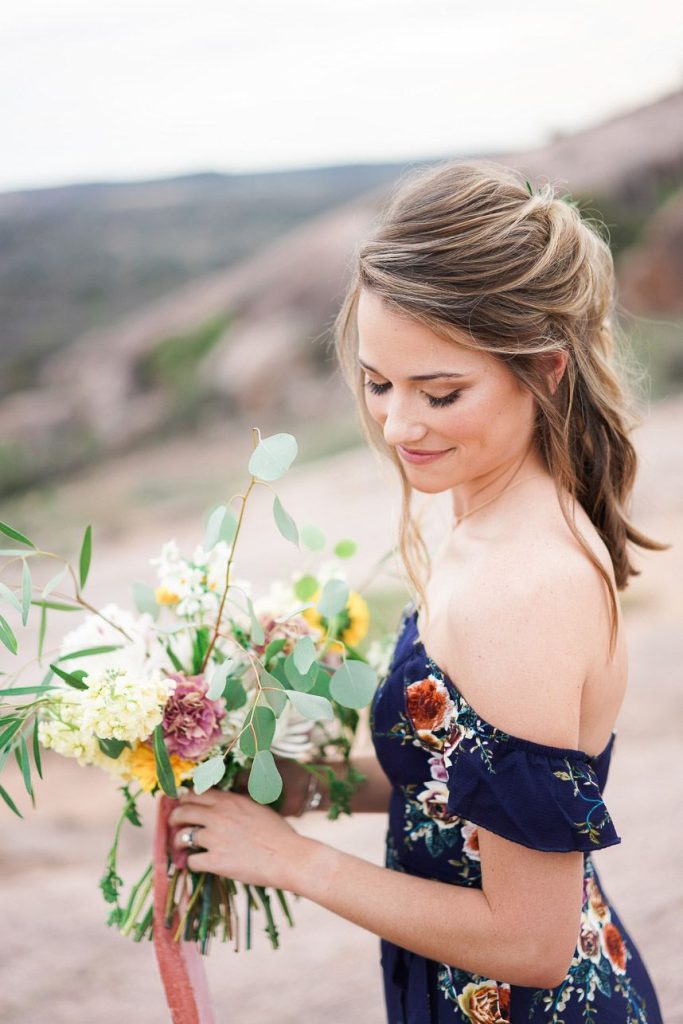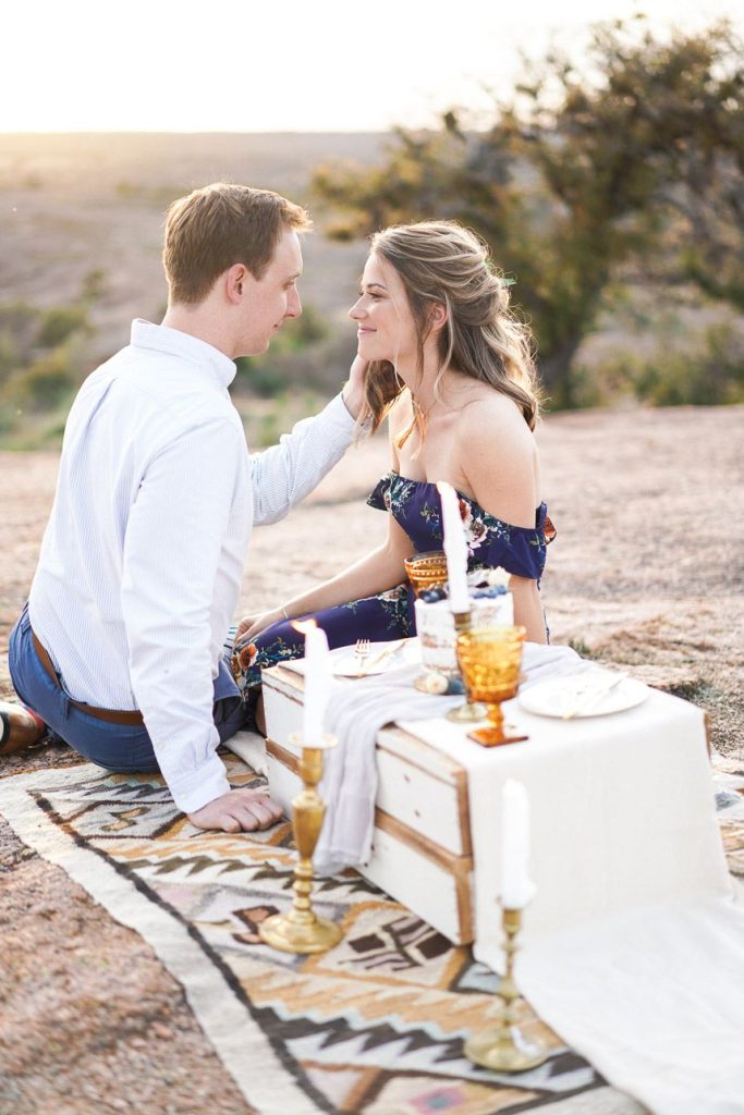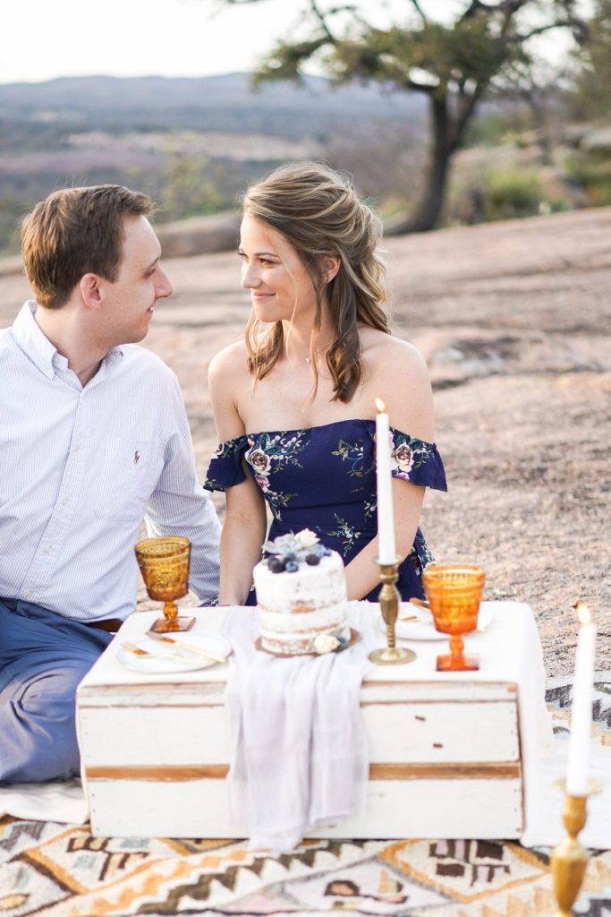 Drawing inspiration from the natural surroundings of Enchanted Rock State Park, this summer picnic styled anniversary shoot from Caitlin Rose Photography features real-life couple Wyatt and Annie celebrating their three-year wedding anniversary with a romantic, vintage boho picnic setup beneath a Texas Hill Country sunset. Shades of blue and pops of yellow in the couple’s wardrobe and in the florals play off the textured neutrals of the picnic setup – we love how even the succulent and blueberry details on the cake help tie everything together. The couple re-read their wedding vows from a swoon-worthy copy in dreamy calligraphy. Annie wore her hair tied back loosely with boho floral details thanks to flAir Style Lounge. As the sun set over Enchanted Rock, the couple popped a personalized champagne bottle, enjoyed a laid-back summer picnic and reflected on their first few years of marriage. What a fun way to celebrate! Cheers!