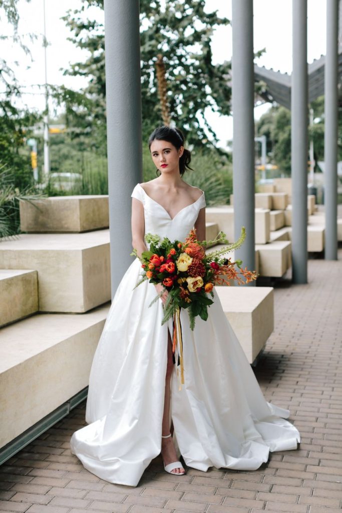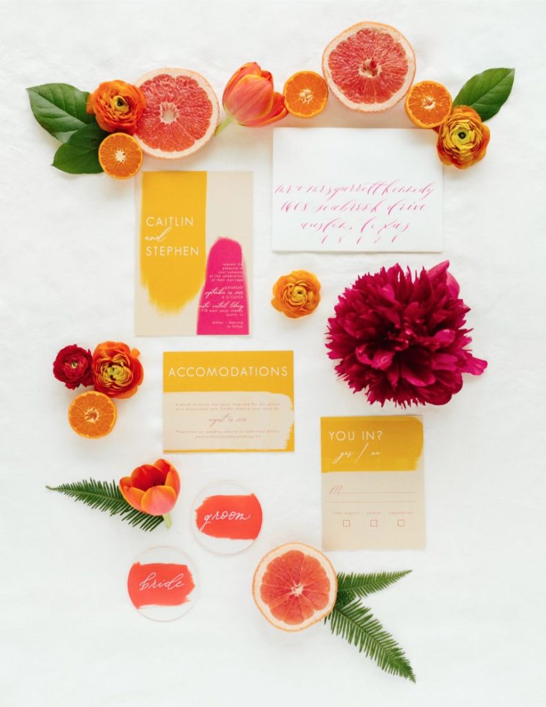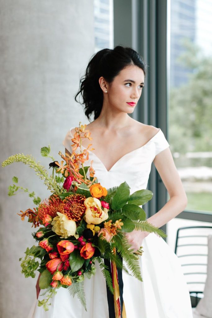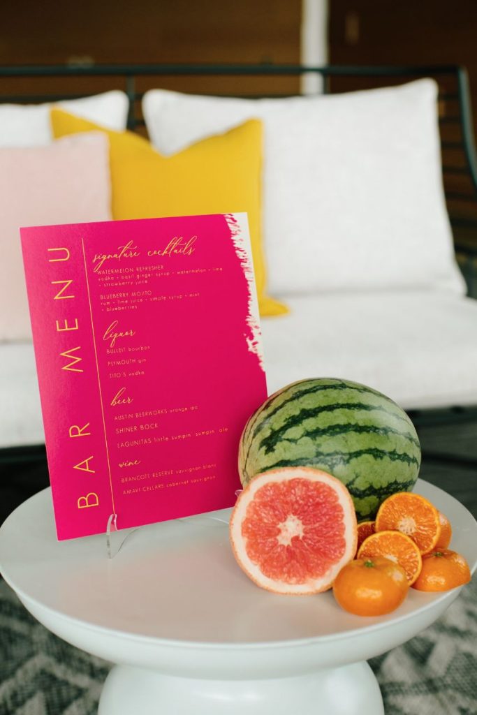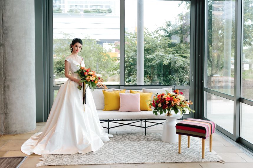 Dreaming of bold colors and refreshing citrus accents for your wedding day? The top-notch vendor collaboration for this shoot came up with one of the most fun, bright, and certainly juiciest palettes we have ever seen! With the industrial edge of Austin Central Library as the background, each modern and feminine detail holds its place – including the ultra-mod lounge setting by Party at the Moontower Rentals. To start, the bride’s enviable look is just polished enough to remind us that this is indeed a wedding editorial. Her tousled pony and pop of lip color from Jose Luis Salon is so fresh. Paired with a classic off-the-shoulder gown from Julian Gold, the entire look is refined for this tropical, urban fusion. The lively invitation suite from Design to Flourish balanced color with each piece of flowery artistry from The Flower Girl. Flowers even made their way to the geometrical cake by 2Tarts Bakery. With the talented Melissa Glynn of Melissa Glynn Photography there to capture it all, no detail went unnoticed. Scroll below to see more refreshing citrus wedding inspiration!