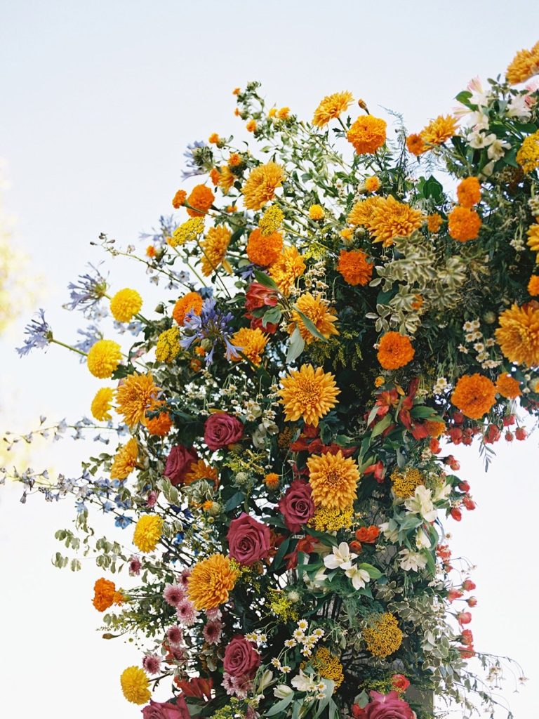 Dreaming of these sunset-hued florals ✨ A vibrant mix of oranges, pinks, and purples washed the venue in warmth and pure magic.