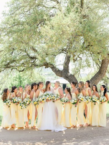 Carly and Noah’s wedding was a beautiful vision of soft yellows and fresh whites, a palette seen everywhere from elegant bridesmaids’ dresses to lush floral arrangements. The bride and her bridal party radiated joy, carrying bouquets that perfectly complemented the bright, inviting tablescapes. At the reception, natural wood tables, crisp white candles, and fresh floral centerpieces created an elevated yet wonderfully welcoming atmosphere.