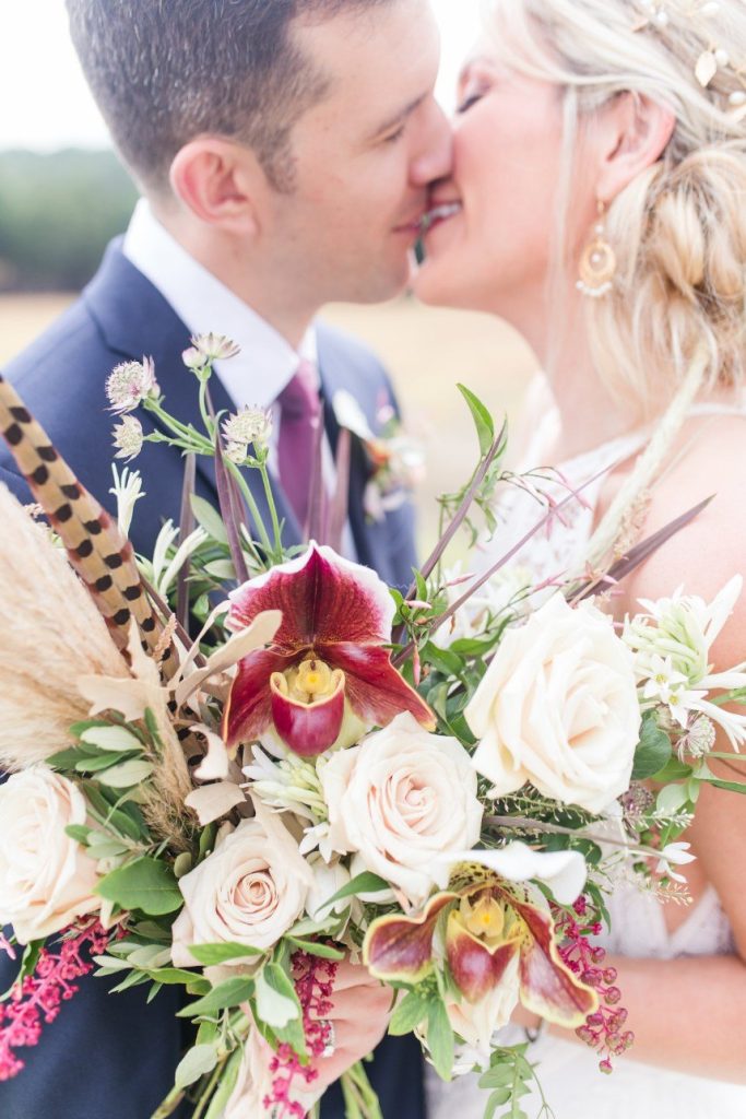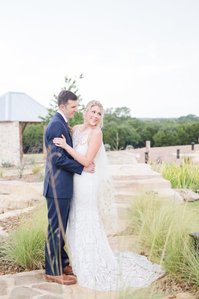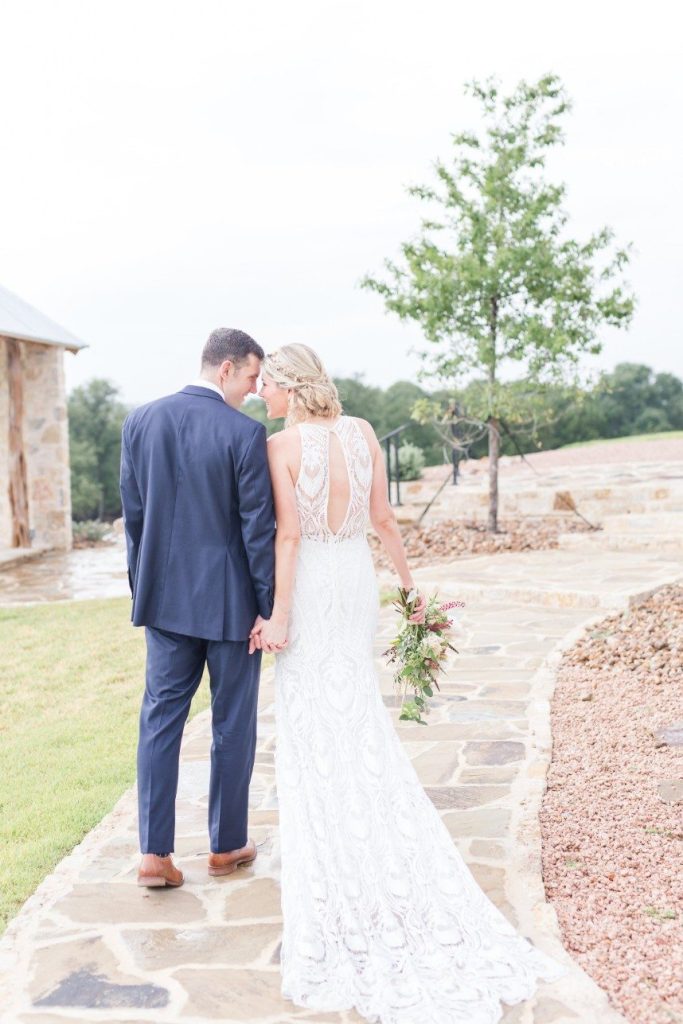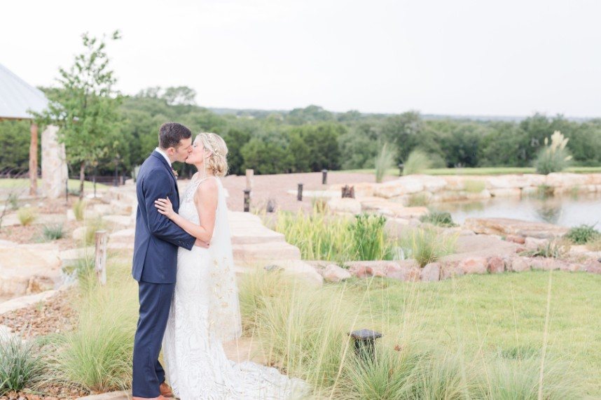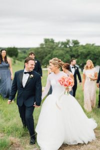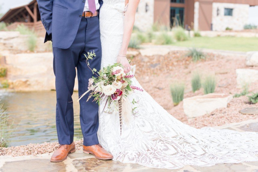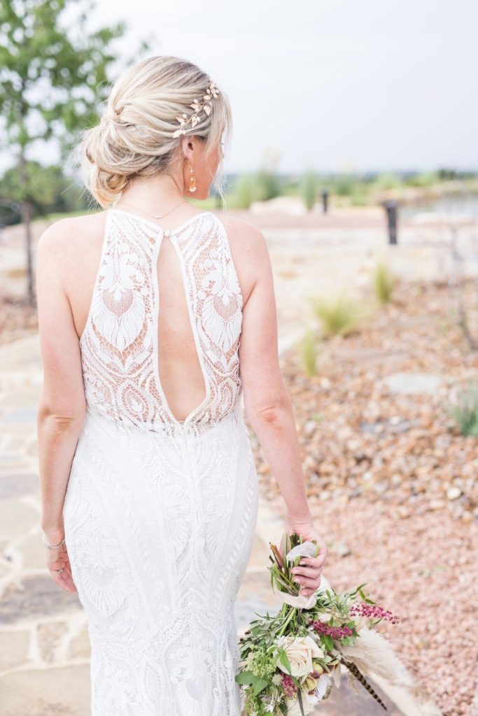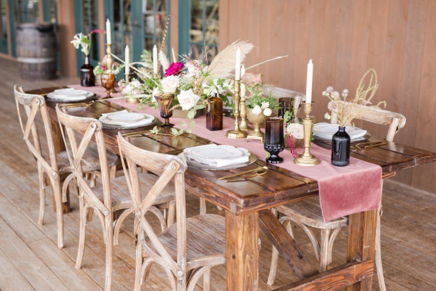 We love this light and airy version of a boho-inspired styled shoot at Hidden River Ranch! Instead of your typical moody hues, this sweetly colored shoot adds a unique twist on the bohemian style with pops of ruby red throughout. Styled by local Austin wedding planner Kristin Catter Events, this shoot featured a variety of texture in soft velvet linens, pheasant feathers and our favorite, pampas grass. Loot Rentals supplied wonderfully rustic furniture, setting the scene for the eclectic tablescape. With a flowing, high-neck lace gown from Unbridaled, the model bride’s look is completed with bohemian gold and pearl jewelry and accessories and a soft side-swept updo. You won’t want to miss this rustic, boho inspo – keep scrolling to see!