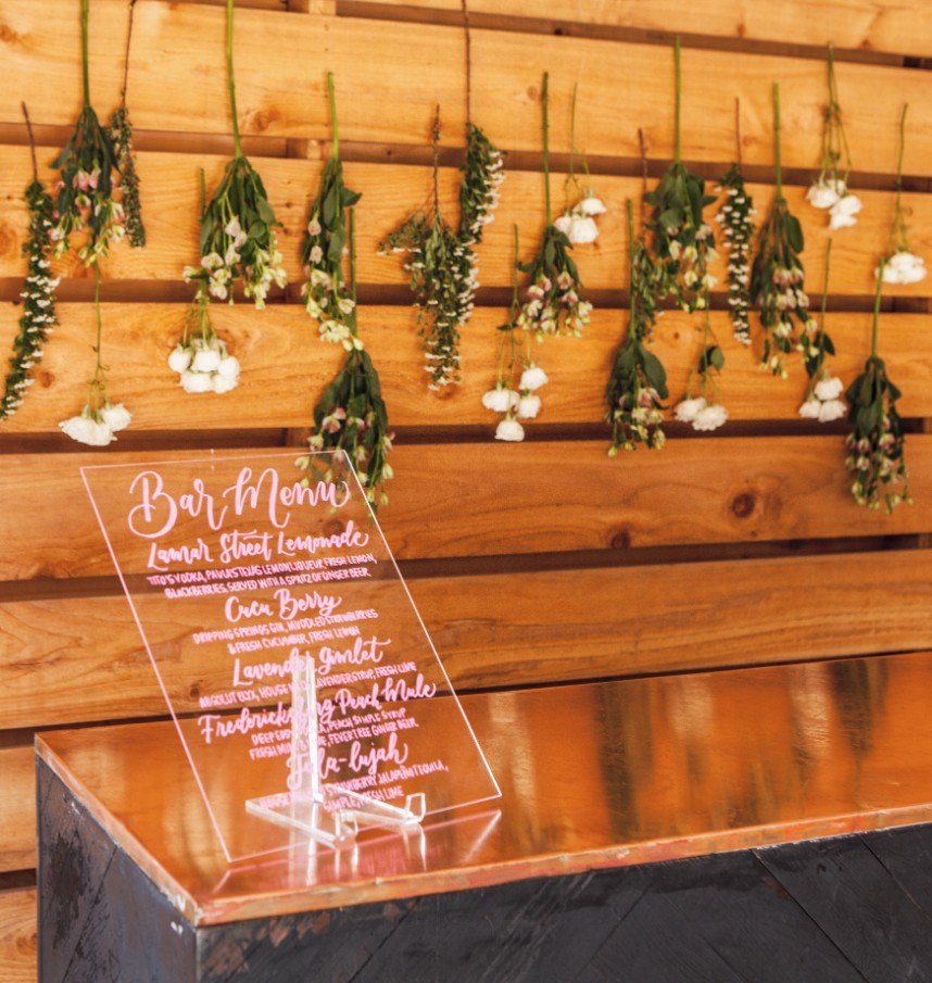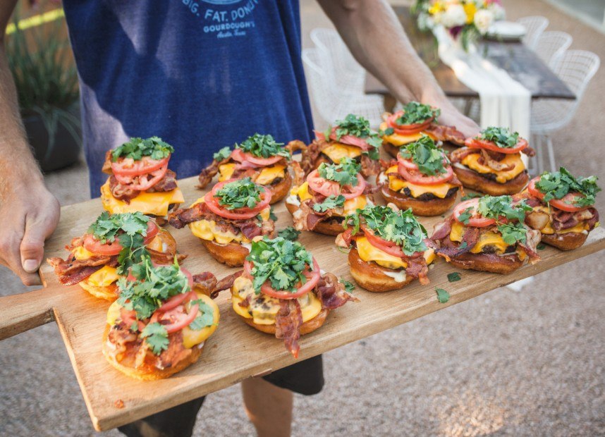 Bright and cheerful boho details and, of course, delectable donuts, steal the show in this sweet summertime styled shoot featuring Gourdough’s Public House! Showcasing one of Austin’s top sweet and savory catering options, this mouthwatering scene features a beautiful lineup of delicious offerings from Gourdough’s, from donuts to burgers and fun drinks! Loot Vintage Rentals created a retro-esque boho scene, perfect for the open-air atmosphere at The Addison Grove and pairing perfectly with Gourdough’s famous airstream food truck! We’re loving the bright white donut wall, fun and flirty fruity drinks and the laid-back, inviting aesthetic. Delightful florals in shades of yellow and peach go hand-in-hand with bright pink stationery and calligraphy courtesy of Averi With an Eye. No matter your tastes, Gourdough’s has your wedding fare covered from dinner to dessert. Cheers to sweet summertime and savory treats!