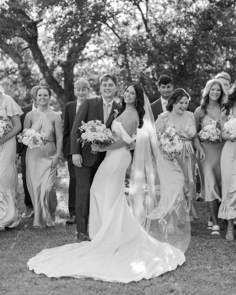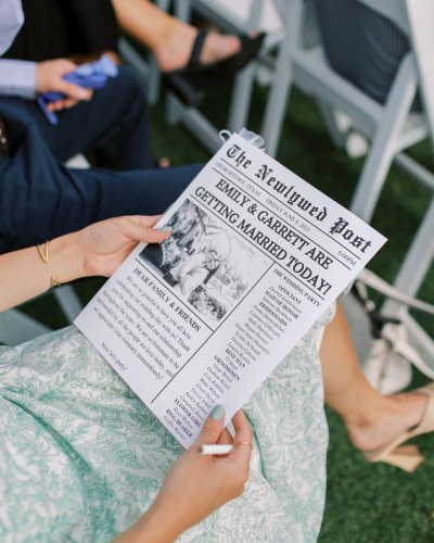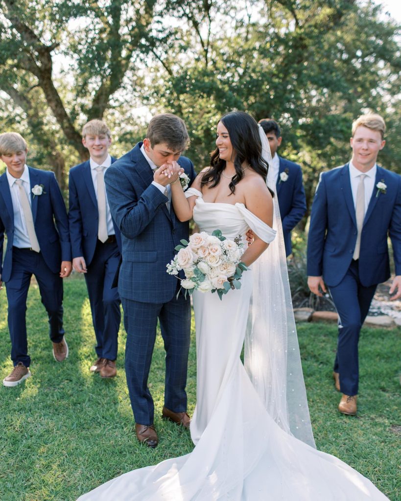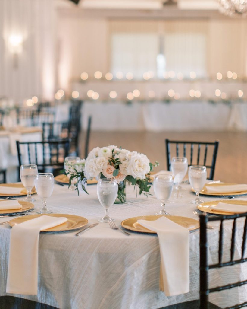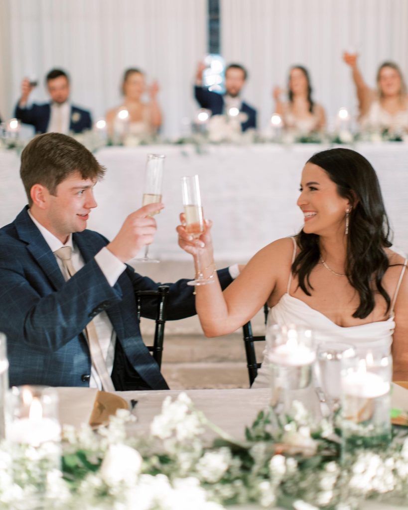 “We wanted our wedding to be timeless and classic. I wanted to be able to look back on our wedding photos years down the line and still love the design elements we chose. So, we decided to stick with a neutral color palette: navy, champagne, and white.” Emily + Garrett