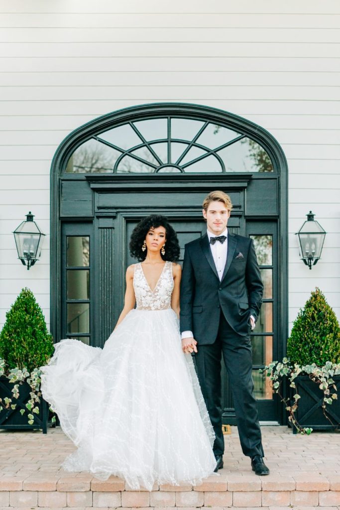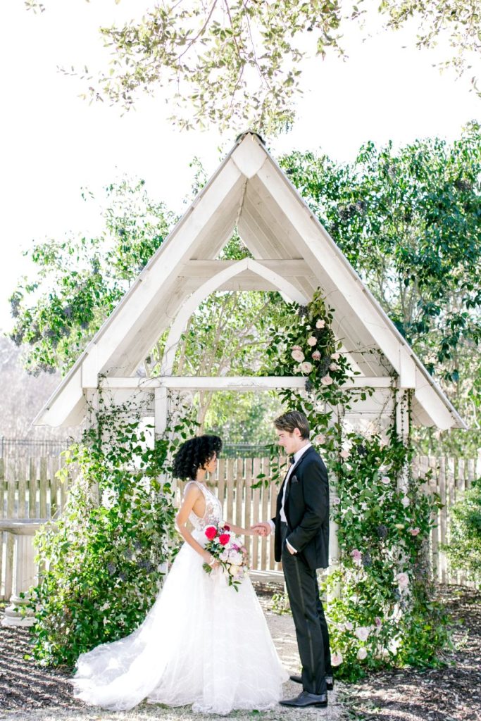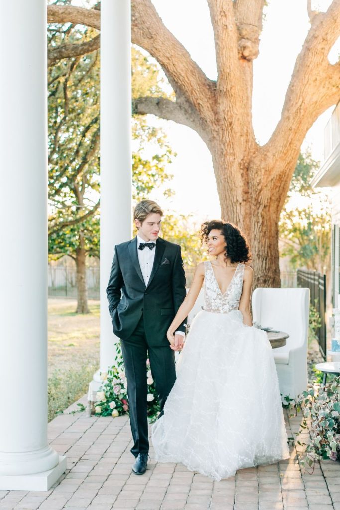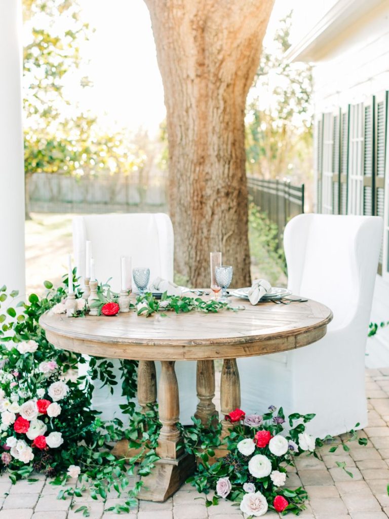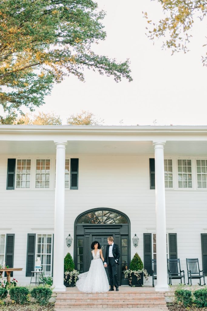 Simplistic and sweet was the name of the game in this traditional wedding inspiration filled with touches of whimsy around a famously flipped venue setting. It was décorated to the nines by planner Blue Sparrow Events for this shoot, but first by Fixer Uppers Chip and Joanna Gaines who turned its gazebo, porch and more into the stuff of elegant wedding dreams. This bride model has all eyes on her with a V-neck ballgown gown that ties in with the exquisite nature of the day where classic and plentiful florals with a pop of romantic red and soft lavender from Remi + Gold inspire minimalist rose details on paperie and more. Natural wood pieces from Premiere Event Rentals tie in with the venue details and if we weren’t hooked already, this traditional wedding inspiration spiced it up with a decadent cake design featuring romantic script and a whimsical, blue bottom tier. Adding just the right amount of twist to traditional wedding inspiration, we’re obsessed with this whimsy-filled affair. Read on for a note from the planner for more about this venue’s Fixer Upper roots. Cheers!