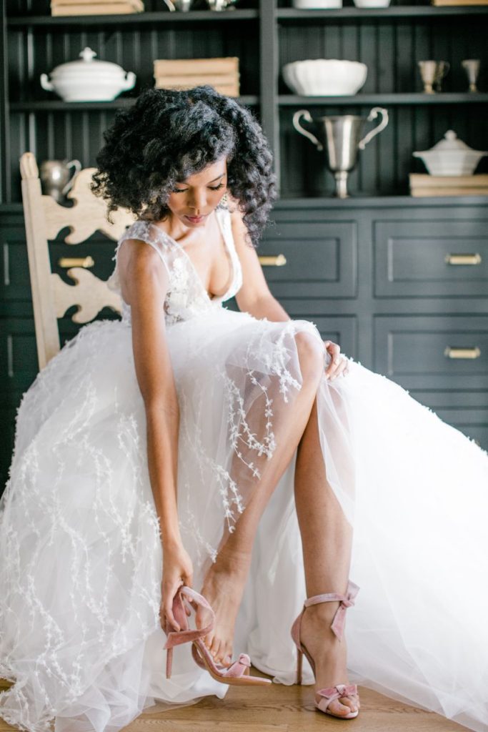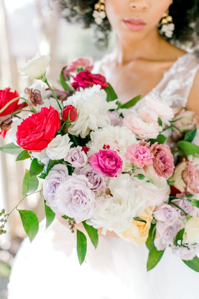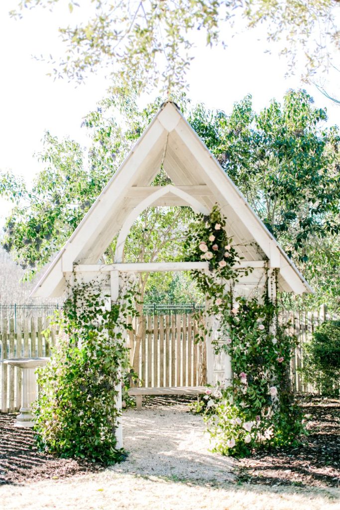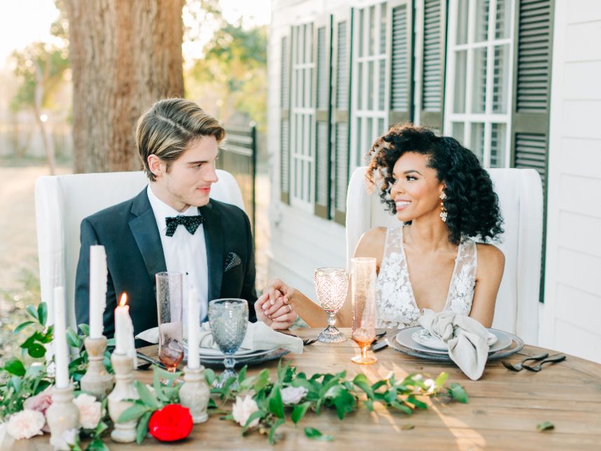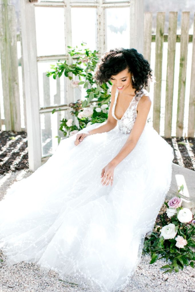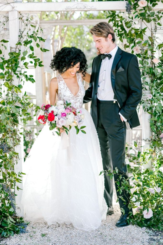 Simplistic and sweet was the name of the game in this traditional wedding inspiration filled with touches of whimsy around a famously flipped venue setting. It was décorated to the nines by planner Blue Sparrow Events for this shoot, but first by Fixer Uppers Chip and Joanna Gaines who turned its gazebo, porch and more into the stuff of elegant wedding dreams. This bride model has all eyes on her with a V-neck ballgown gown that ties in with the exquisite nature of the day where classic and plentiful florals with a pop of romantic red and soft lavender from Remi + Gold inspire minimalist rose details on paperie and more. Natural wood pieces from Premiere Event Rentals tie in with the venue details and if we weren’t hooked already, this traditional wedding inspiration spiced it up with a decadent cake design featuring romantic script and a whimsical, blue bottom tier. Adding just the right amount of twist to traditional wedding inspiration, we’re obsessed with this whimsy-filled affair. Read on for a note from the planner for more about this venue’s Fixer Upper roots. Cheers!