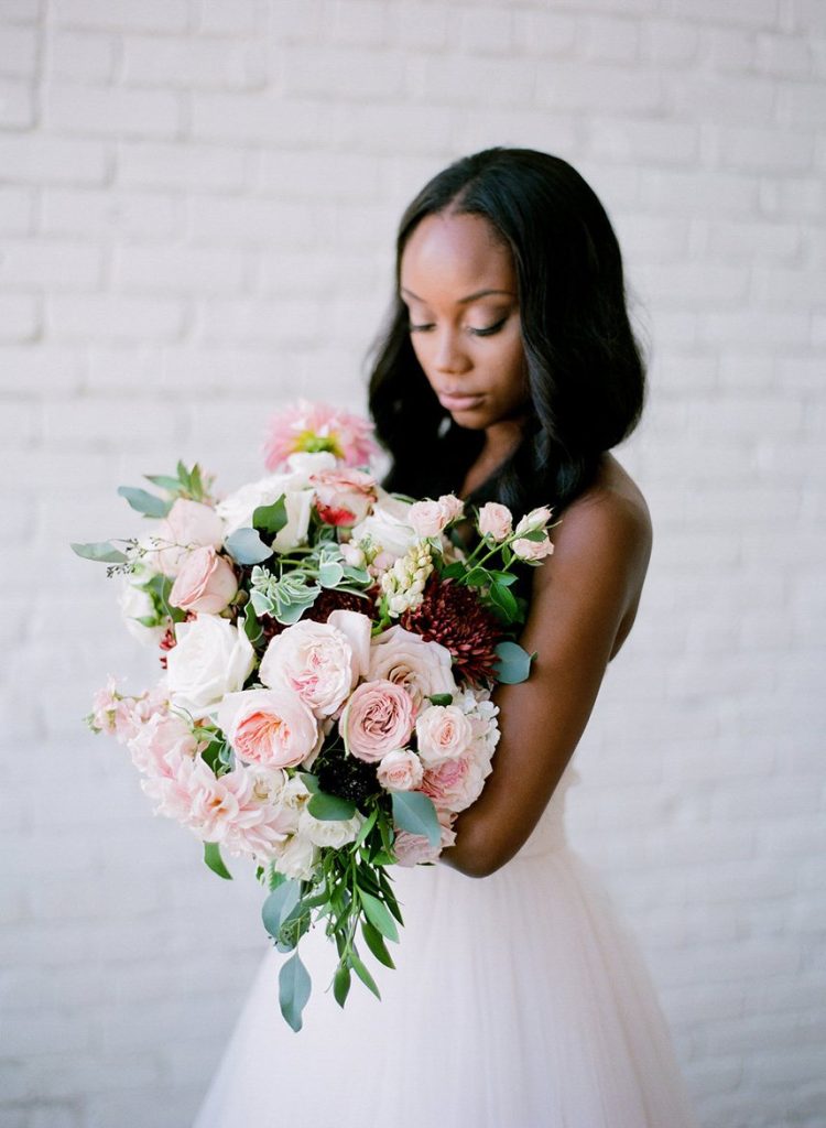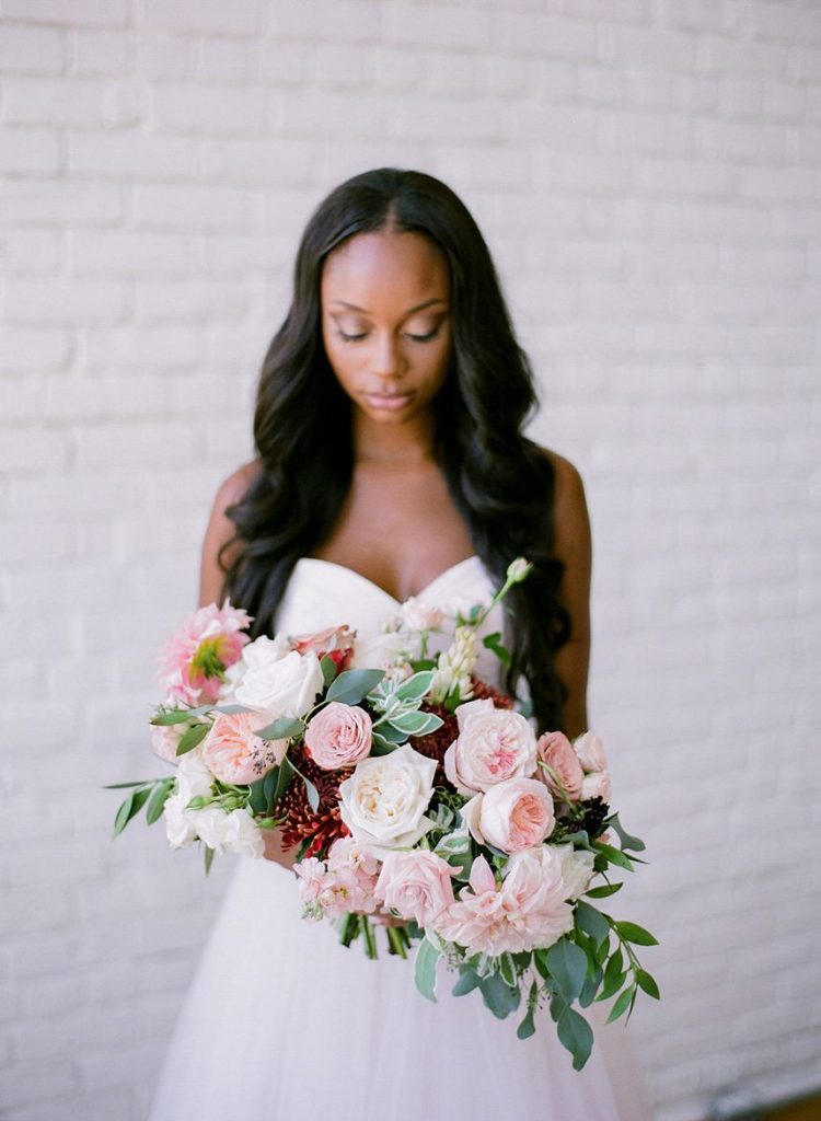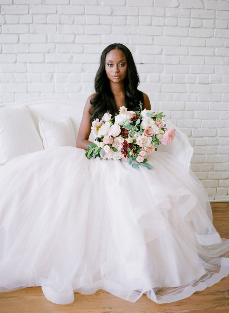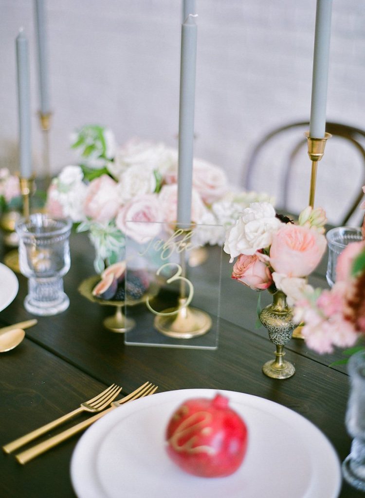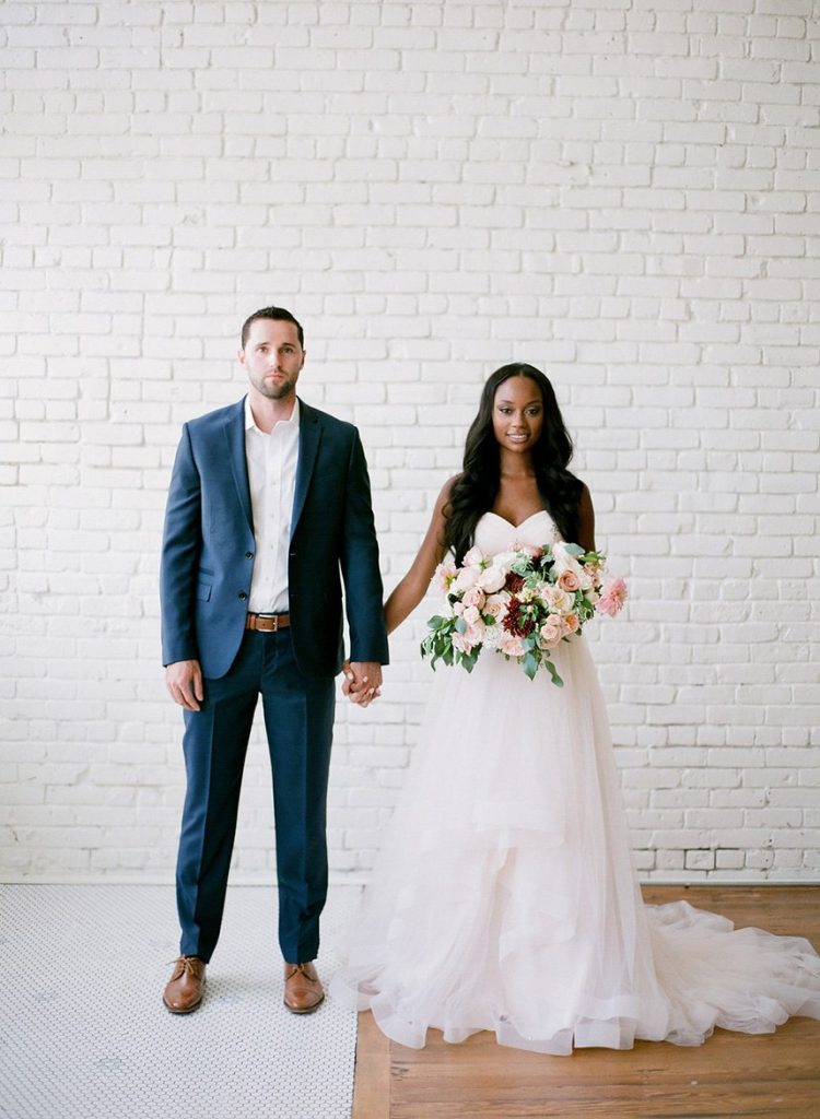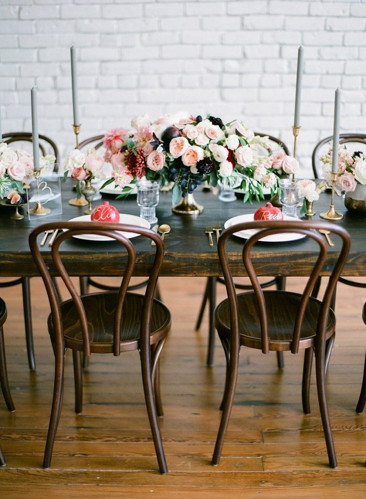 With a touch of whimsy and a fresh, modern backdrop, we can’t get enough of this gorgeously styled shoot filled with trendy romantic wedding inspiration from Bespoke Events. Expertly captured by Krystle Akin Photography, the brightly lit space created the perfect background for the lovely model couple and their pseudo-reception. The unique space featured exposed brick walls painted in a crisp white and wood floors, creating the ideal contrasting backdrop for the grand tablescape incorporating in soft and romantic details. The team at Bespoke Events brought the vision of a modern fairytale to life through the beautiful table setting on the wood table and chairs. Topped with tinges of gold seen in the flatware and candlesticks, the simple white plates at each setting were topped with a unique and nontraditional take on a place card with a beautiful hand-written calligraphy embellished pomegranate. These fresh fruits and other colorful bites filled the table to serve as delicious noshes. Filling the table centerpieces and also serving as a marvelous bouquet were delicate floral arrangements from Remi + Gold made up of soft blush and ivory roses, peonies and a few stalks of cranberry-hued florals for a bold pop of contrast. Individual blooms and an oversized floral-filled garland also lined the stairway for a picturesque entrance! Of course, the scene would not be complete without the stunning model bride and her strapless tulle layered gown. We’ll be swooning over these images forever! Enjoy!