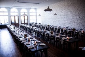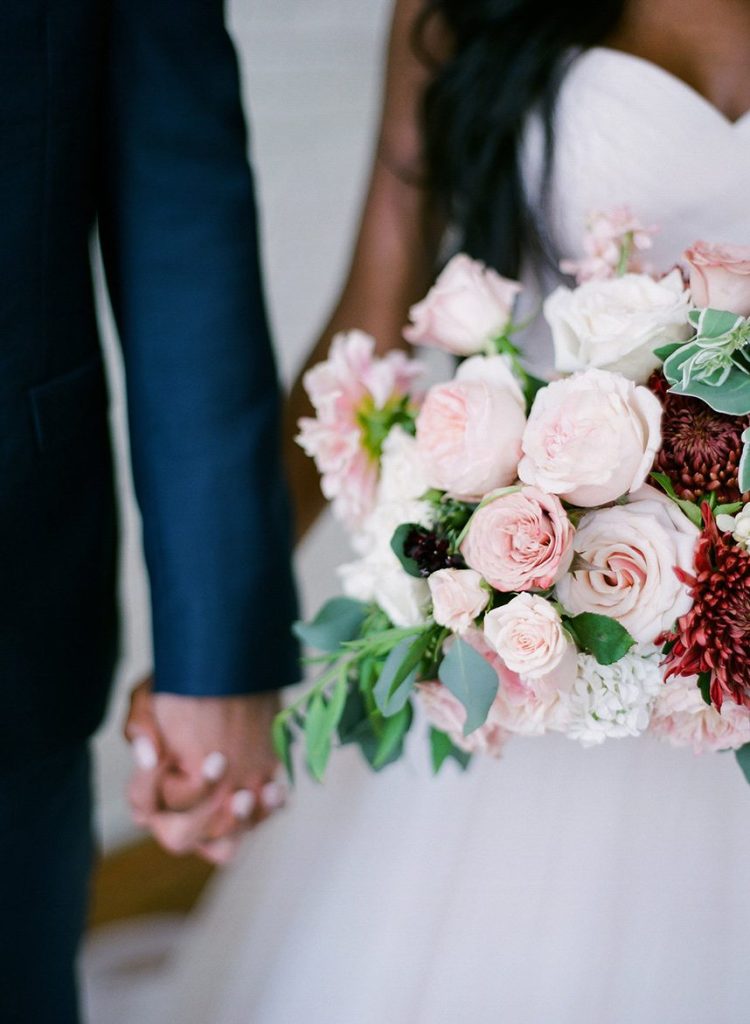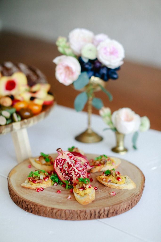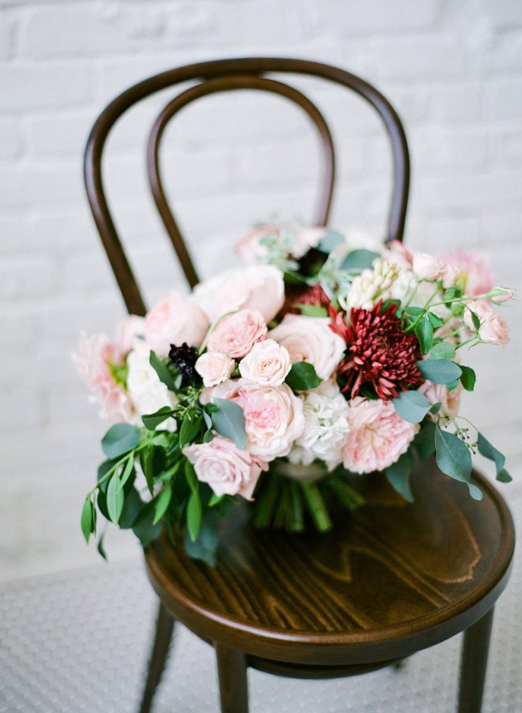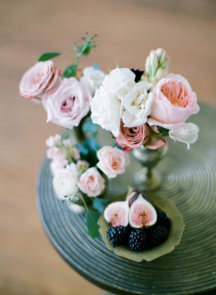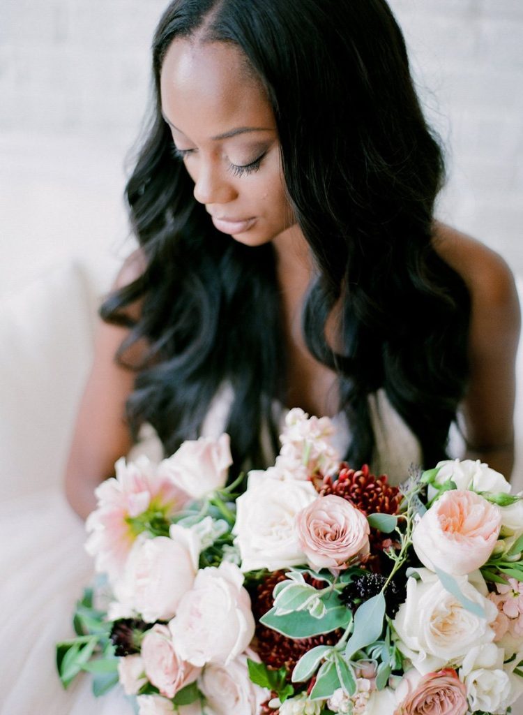 With a touch of whimsy and a fresh, modern backdrop, we can’t get enough of this gorgeously styled shoot filled with trendy romantic wedding inspiration from Bespoke Events. Expertly captured by Krystle Akin Photography, the brightly lit space created the perfect background for the lovely model couple and their pseudo-reception. The unique space featured exposed brick walls painted in a crisp white and wood floors, creating the ideal contrasting backdrop for the grand tablescape incorporating in soft and romantic details. The team at Bespoke Events brought the vision of a modern fairytale to life through the beautiful table setting on the wood table and chairs. Topped with tinges of gold seen in the flatware and candlesticks, the simple white plates at each setting were topped with a unique and nontraditional take on a place card with a beautiful hand-written calligraphy embellished pomegranate. These fresh fruits and other colorful bites filled the table to serve as delicious noshes. Filling the table centerpieces and also serving as a marvelous bouquet were delicate floral arrangements from Remi + Gold made up of soft blush and ivory roses, peonies and a few stalks of cranberry-hued florals for a bold pop of contrast. Individual blooms and an oversized floral-filled garland also lined the stairway for a picturesque entrance! Of course, the scene would not be complete without the stunning model bride and her strapless tulle layered gown. We’ll be swooning over these images forever! Enjoy!