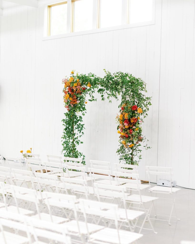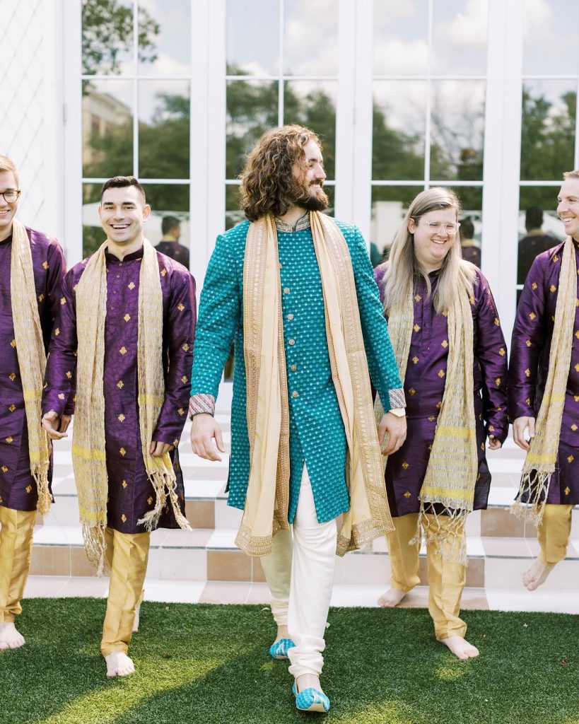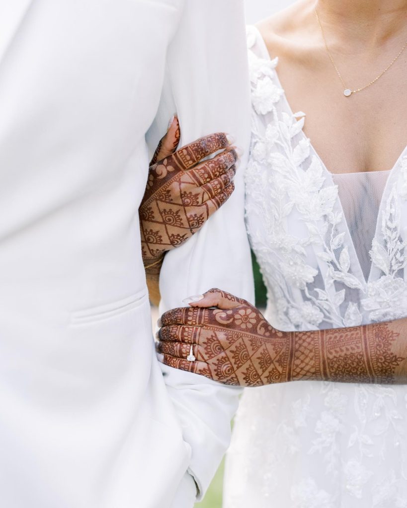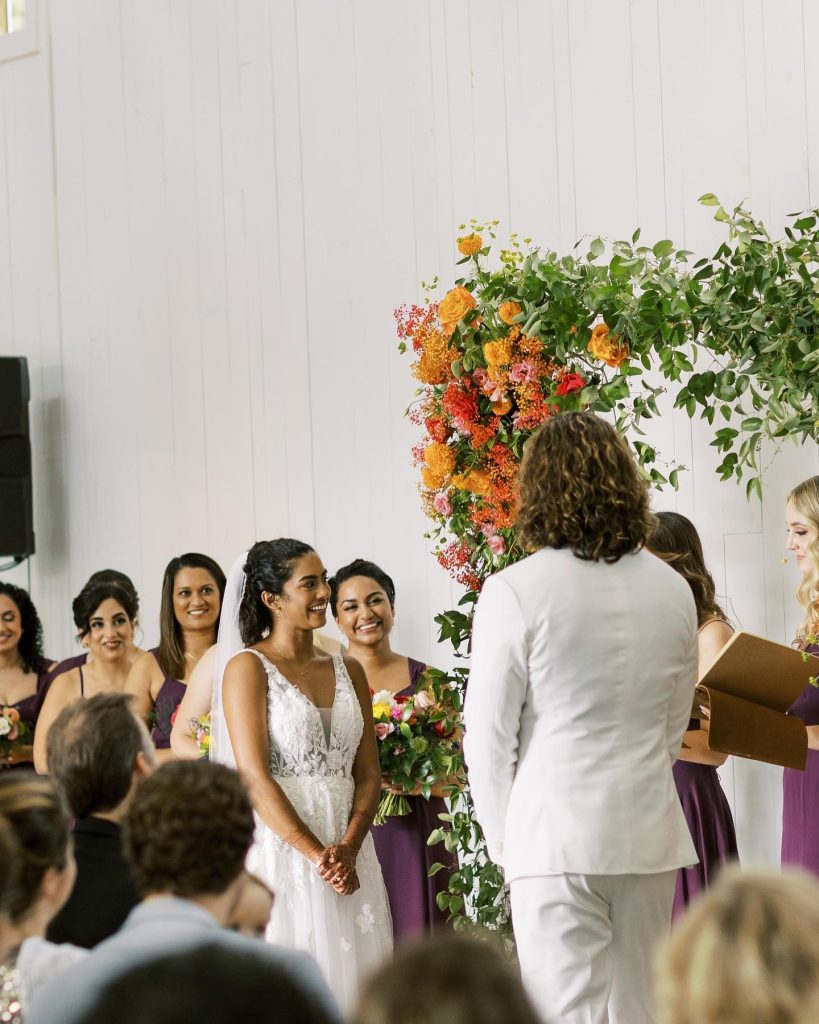 “The purpose of our wedding was to showcase who we are as individuals and as a couple. We started the day with a Hindu ceremony, followed it up with a western ceremony with Kyle’s sisters as officiants, and ended with a huge dance party. We were intentional about creating a space that encouraged everyone to celebrate – from programs explaining each ritual in the Indian ceremony, to a champagne toast during the western ceremony, to a 10-minute sing-along during the reception.” – Pooja + Kyle