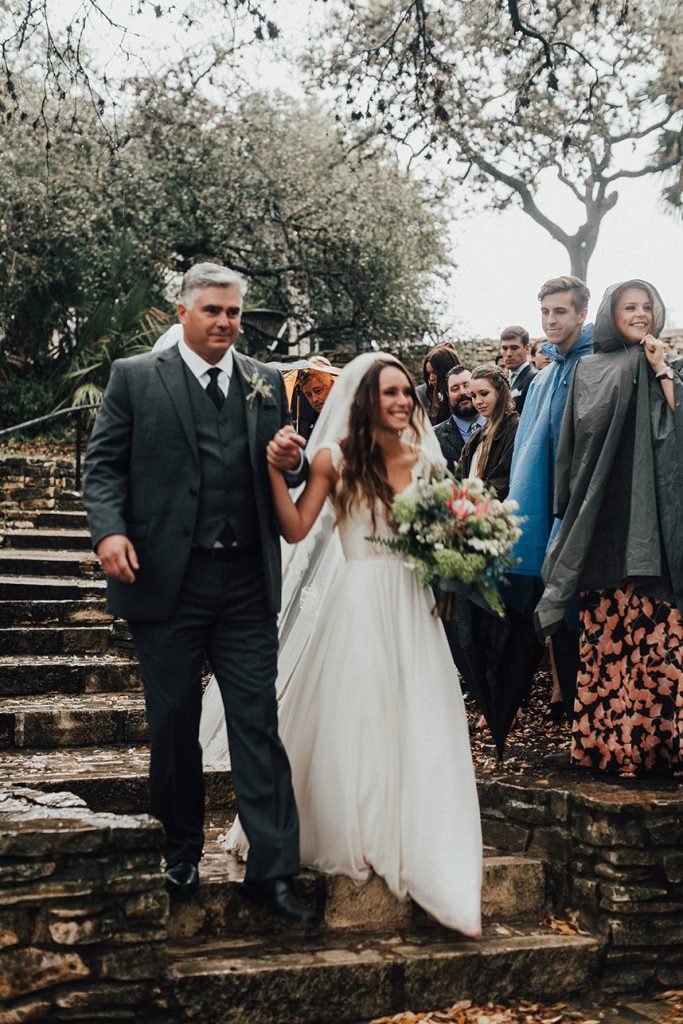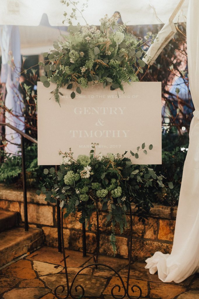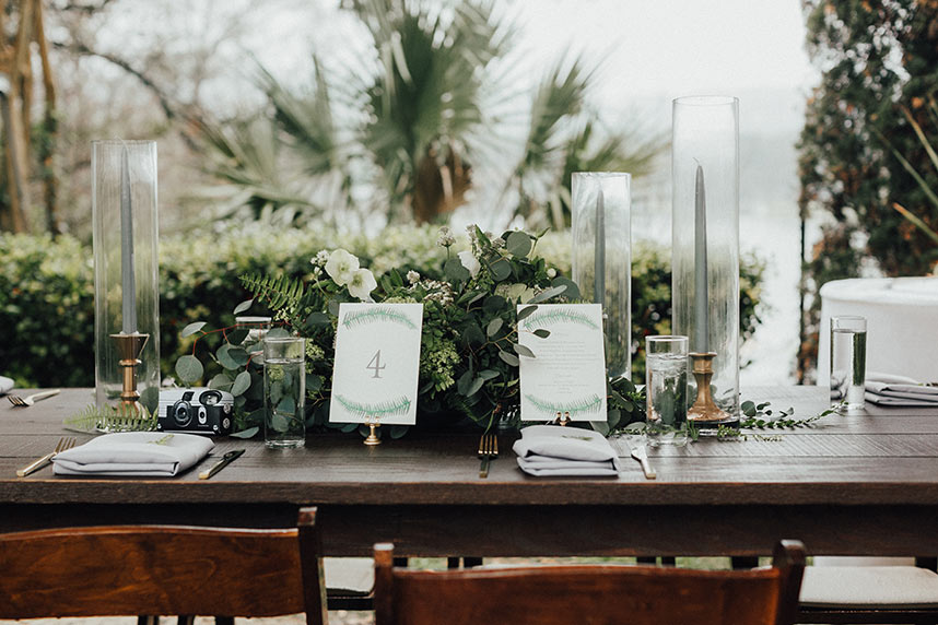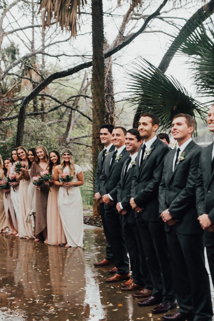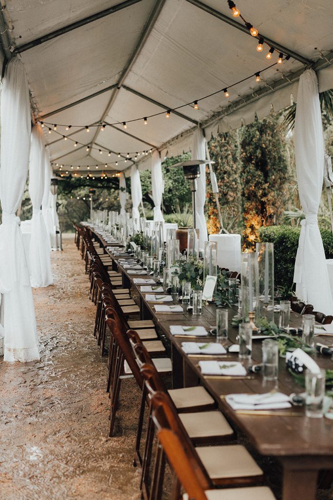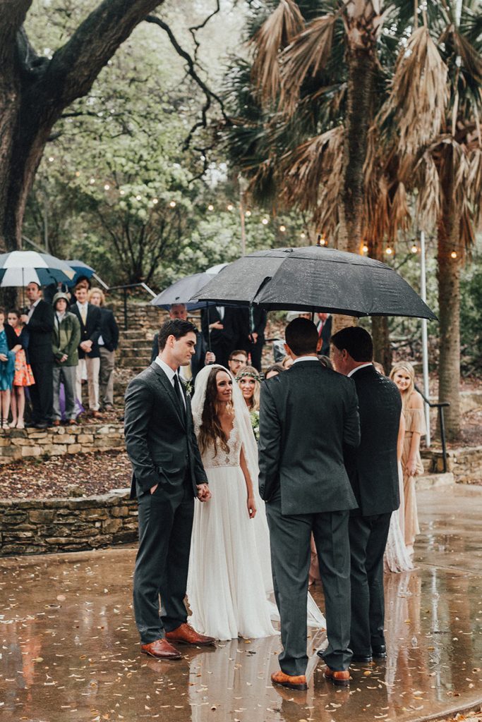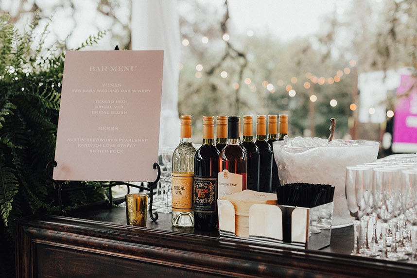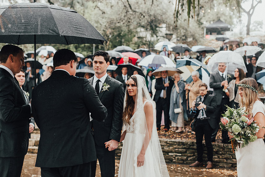 Right in step with the old folklore, newlyweds Gentry and Timothy’s elegant outdoor wedding was kept simple and sweet to allow the beautiful, natural elements of their lush venue to truly shine, including the unexpected evening of rain showers! Accompanied by family and friends, the couple embraced mother nature with an open-air seated dinner at a long dark wood table topped with neutral place settings and glass candle holders and votives from Whim Hospitality. In true Austin style, guests enjoyed pre-dinner appetizer bites of tacos and a guacamole bar from Pink Avocado Catering. In commemoration of their matrimony, the couple cut a four-tier greenery embellished cake from Simon Lee Bakery, who perfectly embodied the setting of their evening into the decadent dessert! Cheers to this sweet shower of love!
