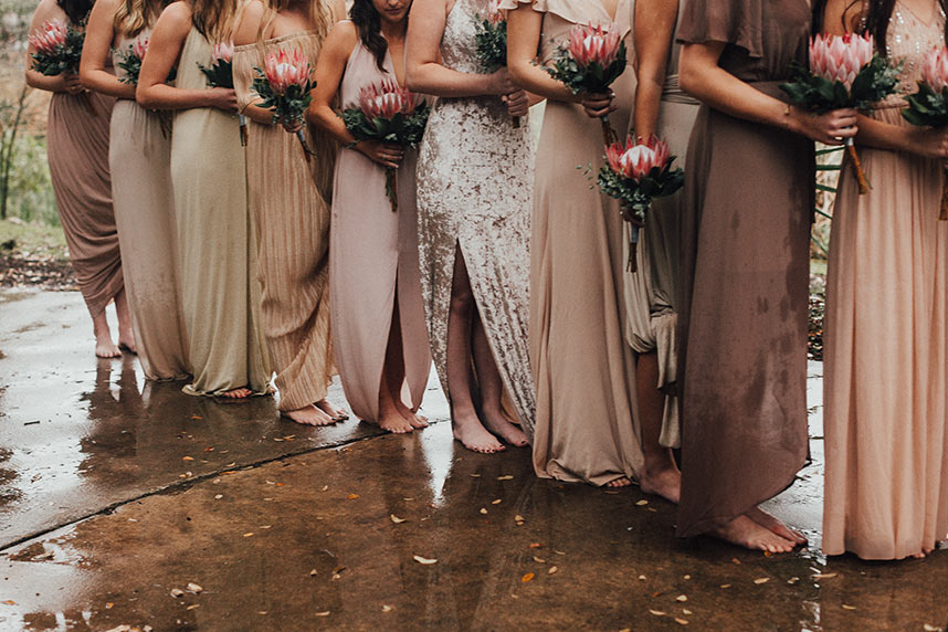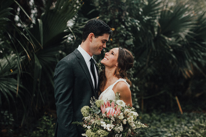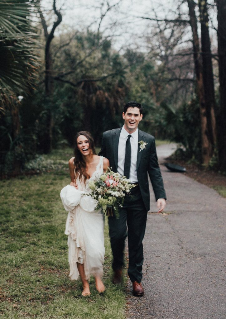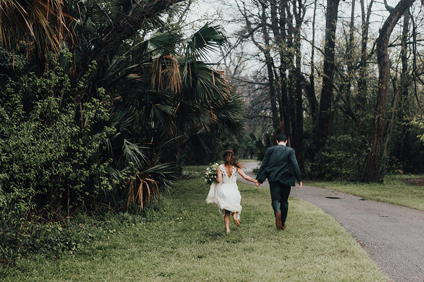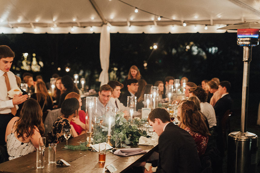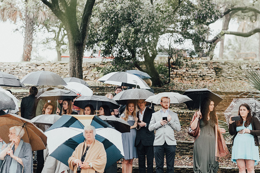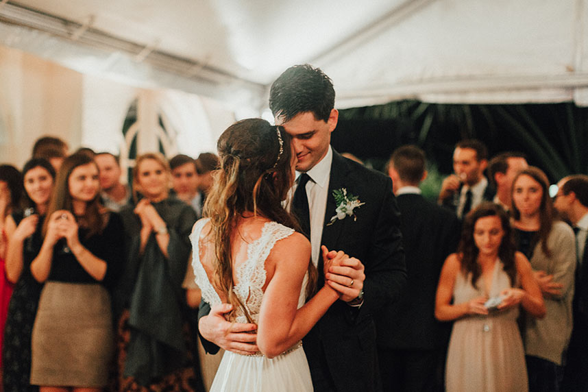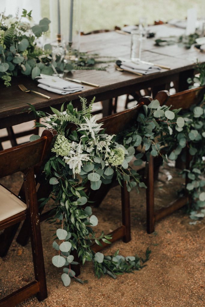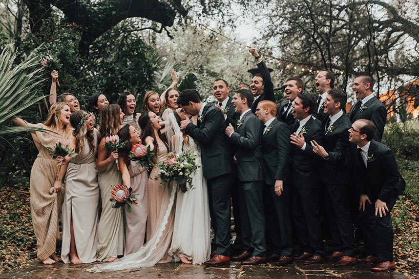 Right in step with the old folklore, newlyweds Gentry and Timothy’s elegant outdoor wedding was kept simple and sweet to allow the beautiful, natural elements of their lush venue to truly shine, including the unexpected evening of rain showers! Accompanied by family and friends, the couple embraced mother nature with an open-air seated dinner at a long dark wood table topped with neutral place settings and glass candle holders and votives from Whim Hospitality. In true Austin style, guests enjoyed pre-dinner appetizer bites of tacos and a guacamole bar from Pink Avocado Catering. In commemoration of their matrimony, the couple cut a four-tier greenery embellished cake from Simon Lee Bakery, who perfectly embodied the setting of their evening into the decadent dessert! Cheers to this sweet shower of love!