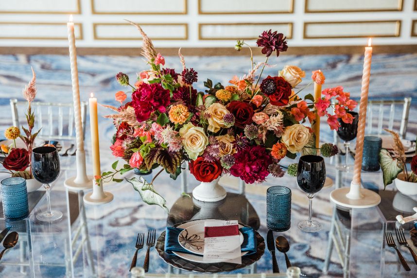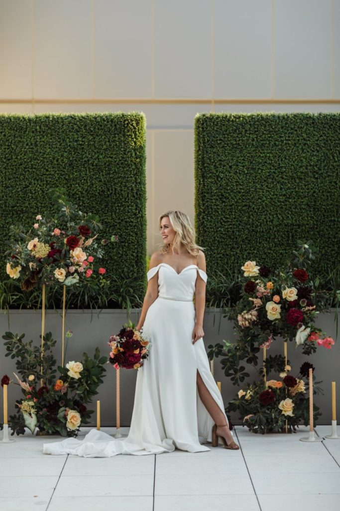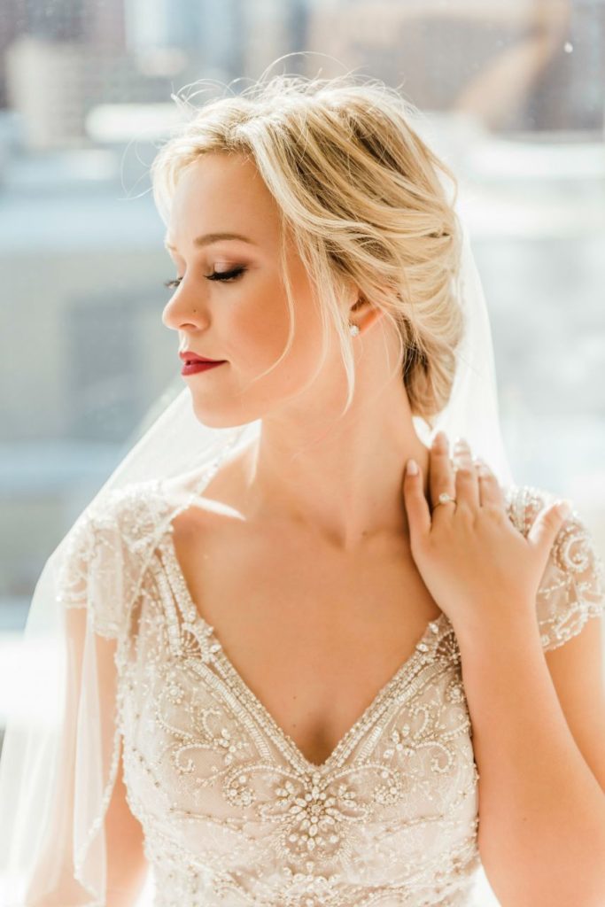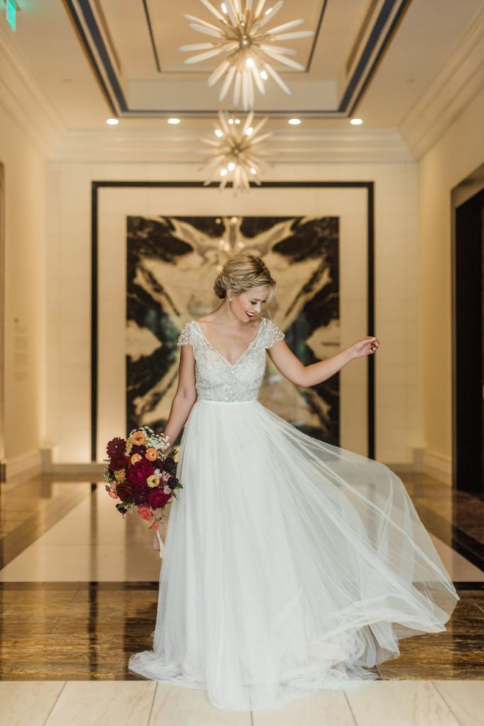 If you’re looking for ways to add a little urban romance to your big day, look no further because this wedding inspiration from Kristin Catter Events is all that and then some. Held at the Fairmont Austin, this styled shoot showcases all the venue’s wonderful and industrial features as well as some unique spots to shoot your bridal portraits on the big day. The sweetest decor and rentals from Premiere Events create an eye-catching tablescape of blue hues and lush blooms, and the towering tiered cake from Sweet Treets Bakery takes our breath away. This model stuns in two separate gowns from Blush Bridal Lounge – one featuring a cap sleeve and intricate beading covering the bodice and the other showcasing an off-the-shoulder gown that is both simple and chic in design. Beautymark Agency did an amazing job with accenting all her best features without overpowering her natural beauty, and we love her hair in its prim updo and when let down in loose waves. Mix all these picturesque aspects together and they make for a stunning urban romance styled shoot. Cheers!