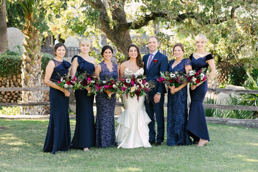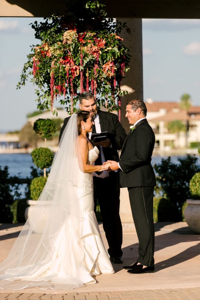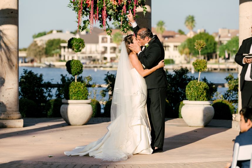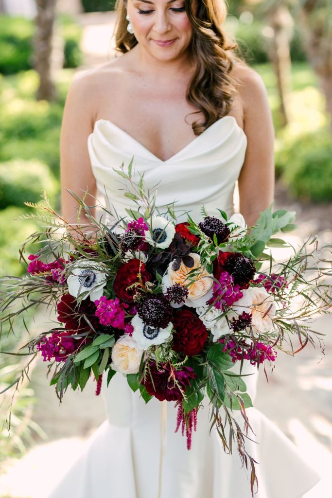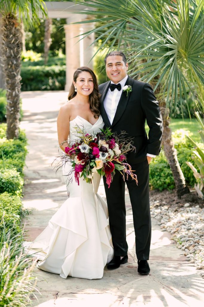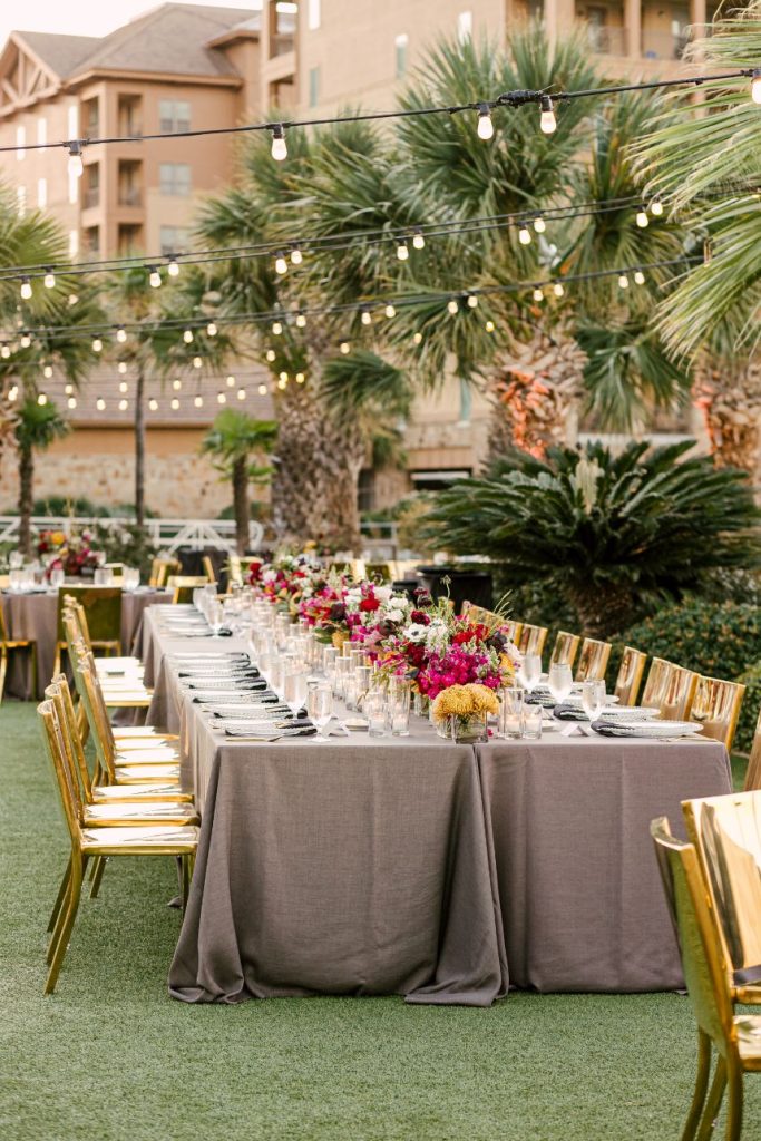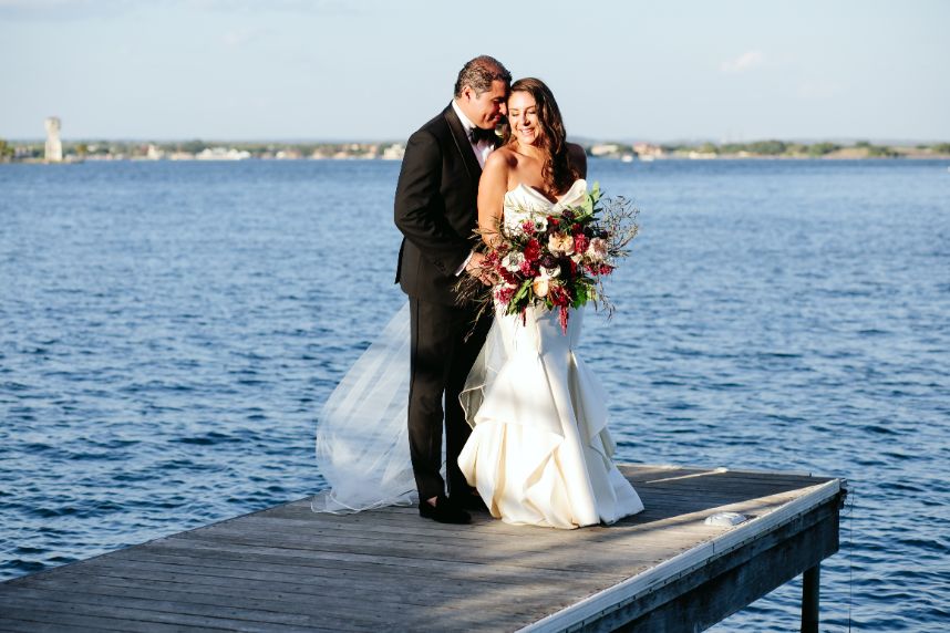 Sparks truly fly in more ways than one throughout Liz and Johnny’s vibrant Austin wedding, and what better place for it to take place than the scenic and tropical Horseshoe Bay Resort? Planned by Kristin Catter Events, this al fresco affair has a strong, stately palette of neutrals like black and gold while its vivid pops of fuchsia and moody maroon accents add some sweet and spice! This wedding venue was a superstar vendor, taking care of guest accommodations, the bridesmaids’ luncheon, rehearsal dinner, and wedding catering all in addition to hosting the ceremony and reception. Horseshoe Bay Resort truly does it all and there isn’t a detail out of place in this elegant outdoor wedding. Decor from Marquee Event Rentals makes these outdoor wedding scenes so stylish and their simplistic pieces allow gold flatware and bright petals really pop. Big blooming mums and cascading amaranthus galore add drama to floral arrangements by Bouquets of Austin and a few peachy blooms add an irresistible tropic touch. Liz and Johnny’s vibrant Austin wedding truly went out with a bang, ending in a surprise fireworks show organized by a friend of the bride’s! Talk about a fairytale evening! Read on for a note from the bride about sentimental details that made her wedding day extra special. Cheers to Liz and Johnny!
