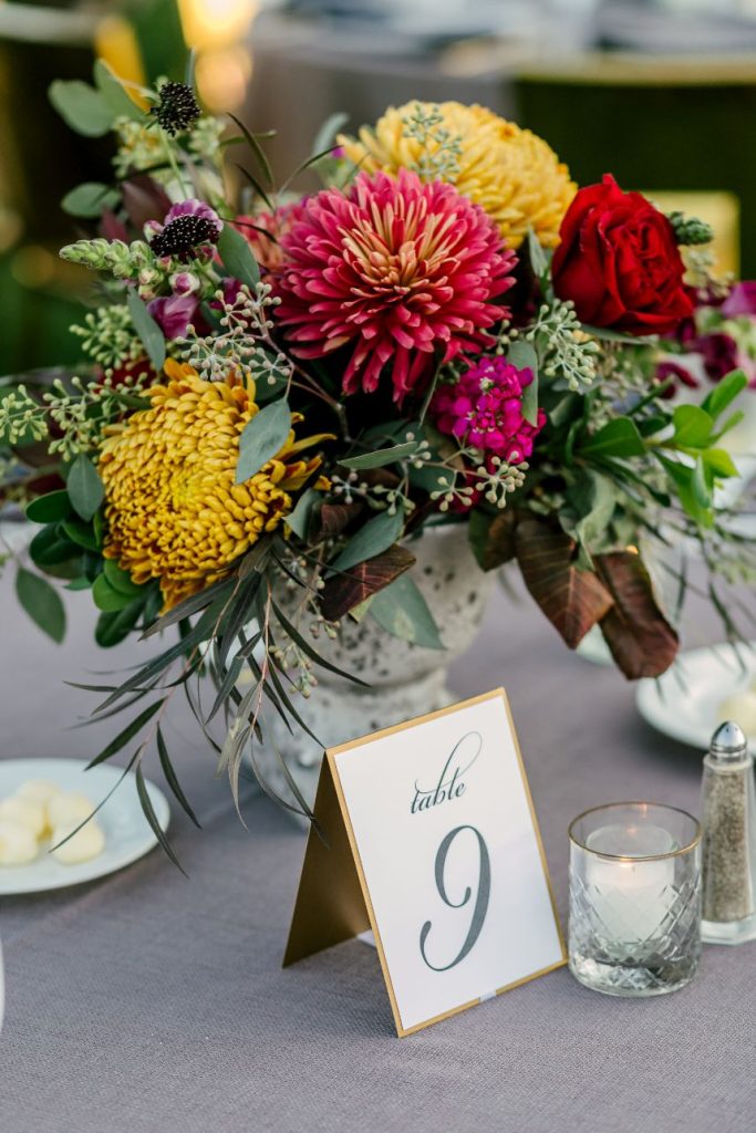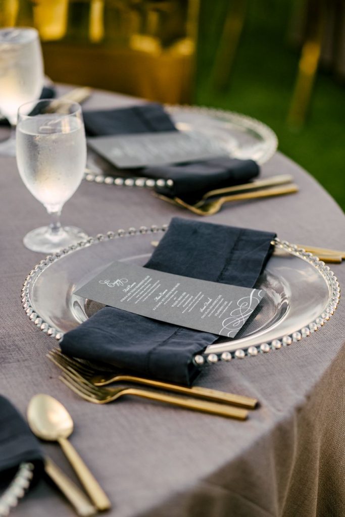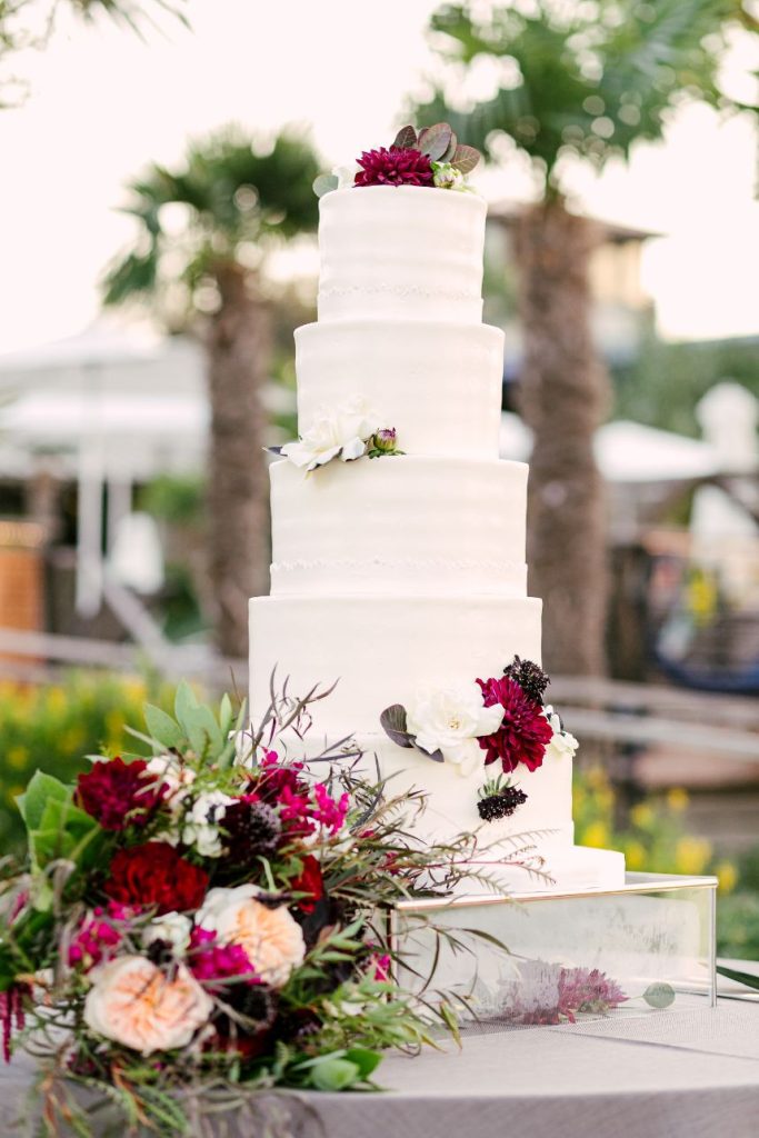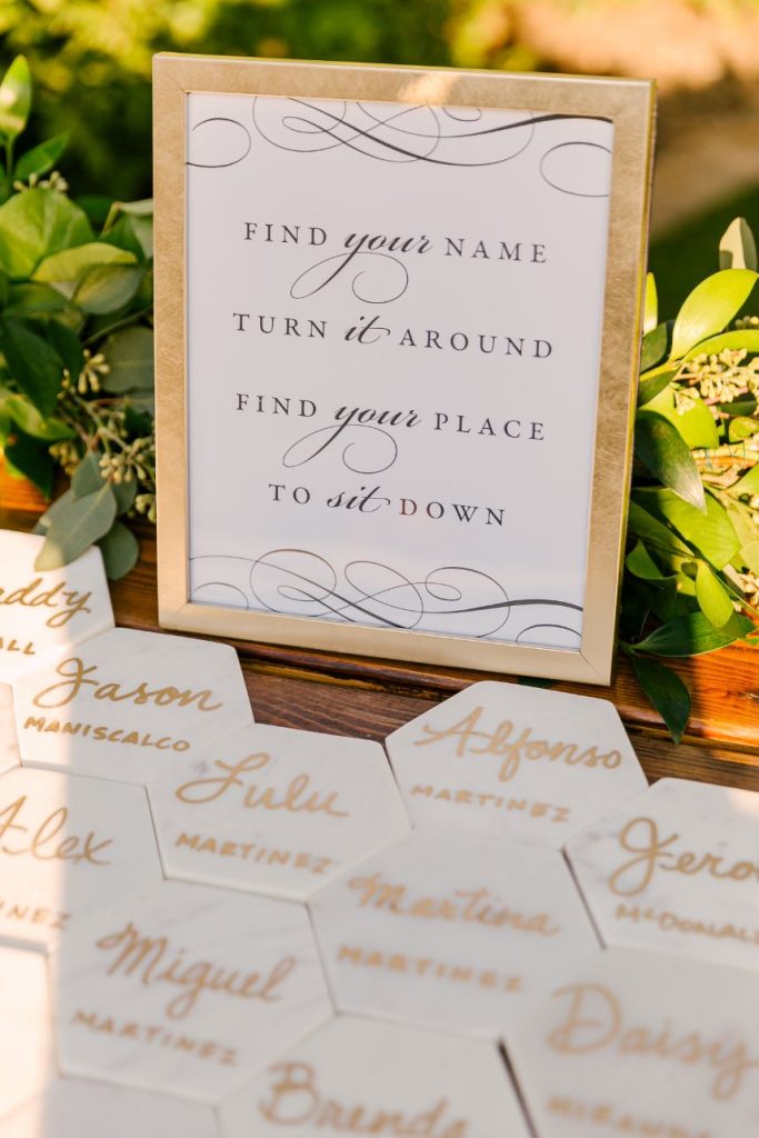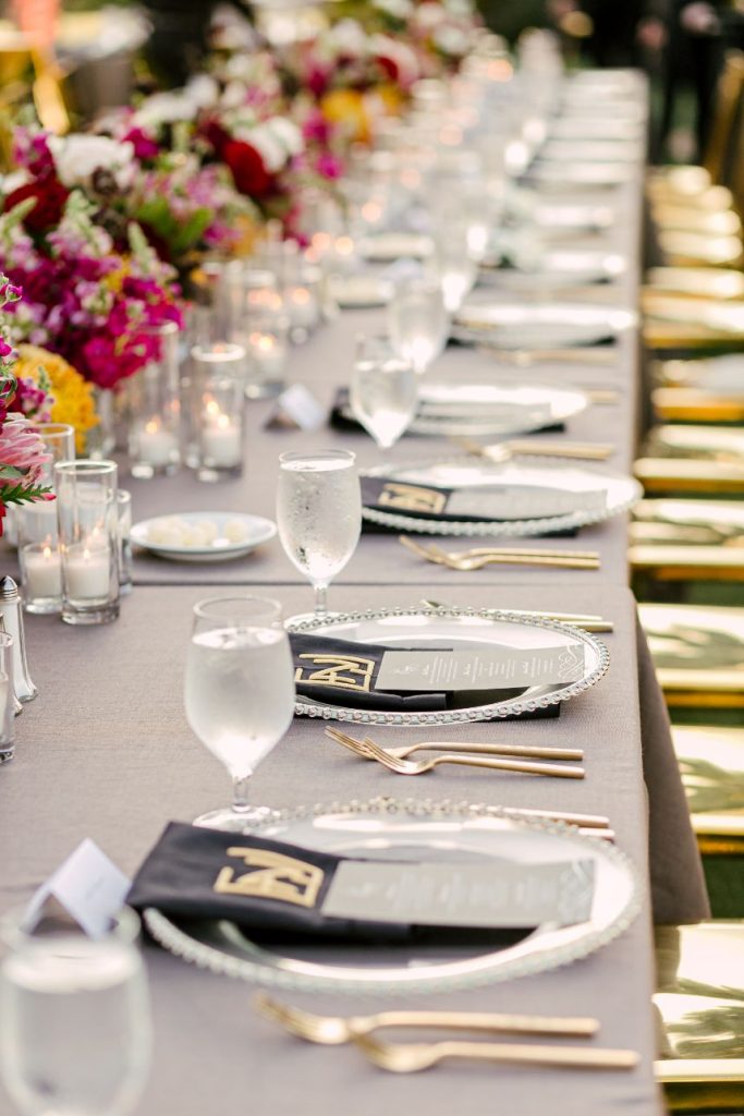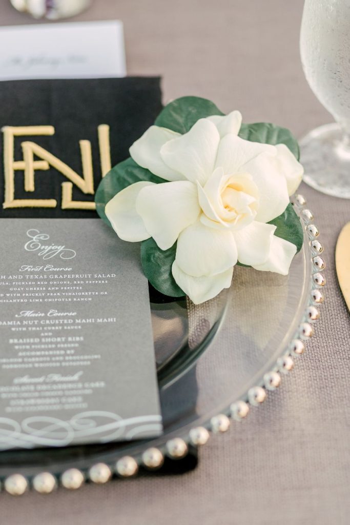 Sparks truly fly in more ways than one throughout Liz and Johnny’s vibrant Austin wedding, and what better place for it to take place than the scenic and tropical Horseshoe Bay Resort? Planned by Kristin Catter Events, this al fresco affair has a strong, stately palette of neutrals like black and gold while its vivid pops of fuchsia and moody maroon accents add some sweet and spice! This wedding venue was a superstar vendor, taking care of guest accommodations, the bridesmaids’ luncheon, rehearsal dinner, and wedding catering all in addition to hosting the ceremony and reception. Horseshoe Bay Resort truly does it all and there isn’t a detail out of place in this elegant outdoor wedding. Decor from Marquee Event Rentals makes these outdoor wedding scenes so stylish and their simplistic pieces allow gold flatware and bright petals really pop. Big blooming mums and cascading amaranthus galore add drama to floral arrangements by Bouquets of Austin and a few peachy blooms add an irresistible tropic touch. Liz and Johnny’s vibrant Austin wedding truly went out with a bang, ending in a surprise fireworks show organized by a friend of the bride’s! Talk about a fairytale evening! Read on for a note from the bride about sentimental details that made her wedding day extra special. Cheers to Liz and Johnny!