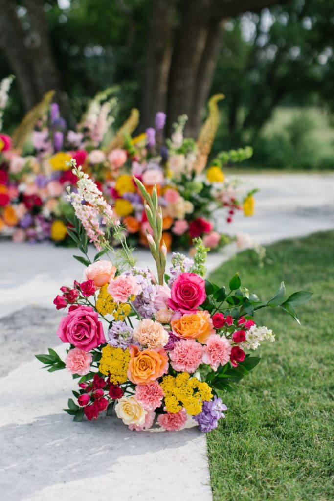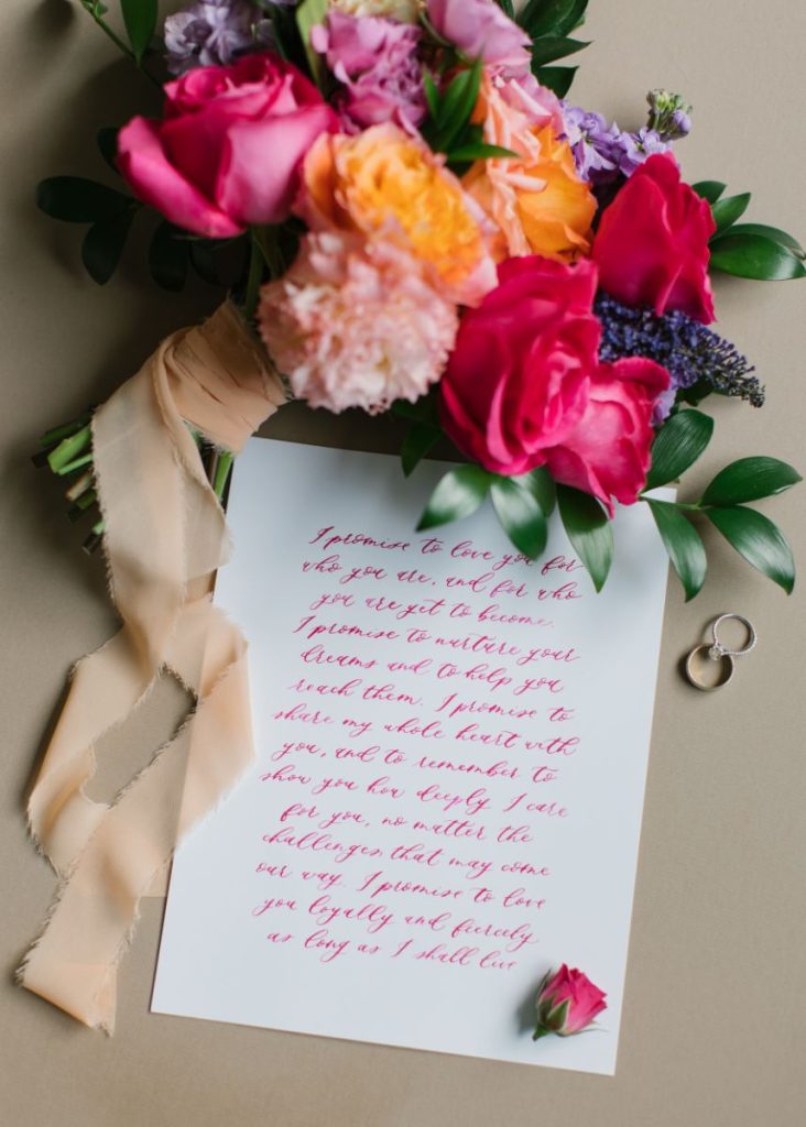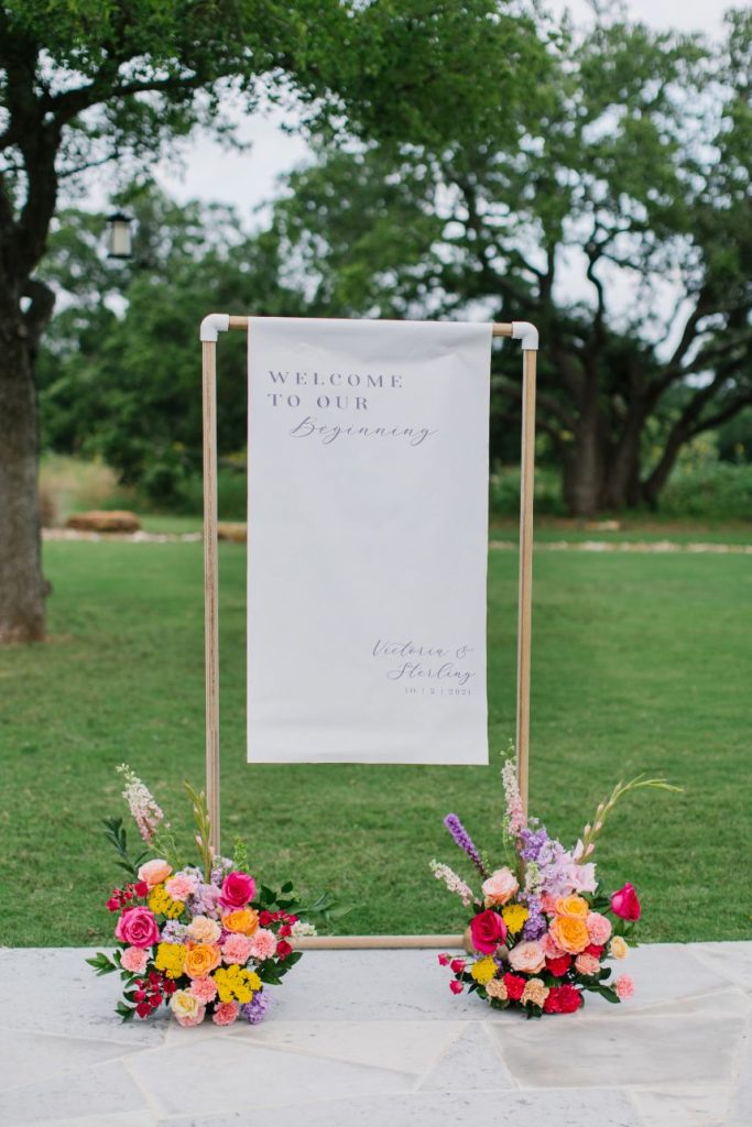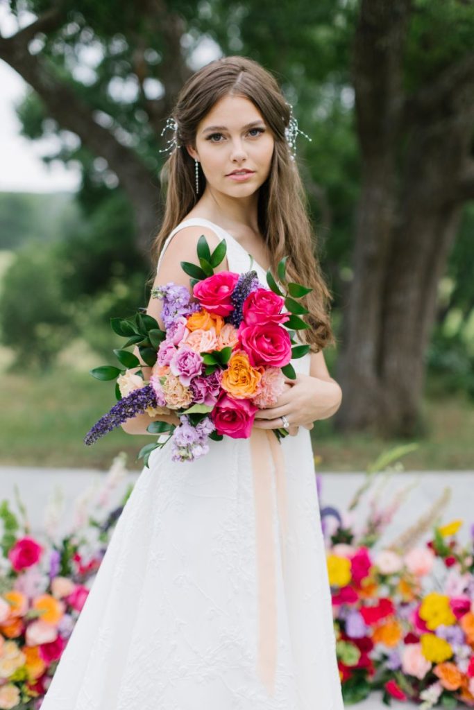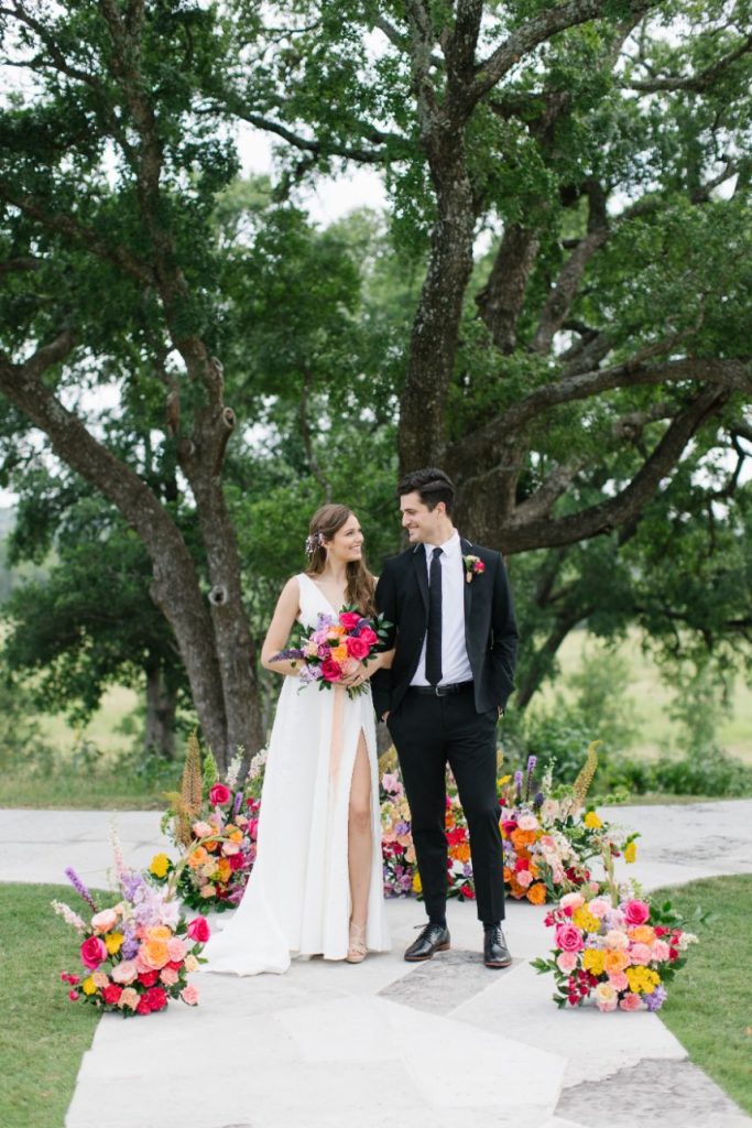 Make your way through the day with stunning inspiration for each part of your wedding celebration. A vivid summertime ceremony makes for a fun, vibrant way to say “I do” in inspiration captured by Janeane Marie Photography in the cutest colorful shots. There are plenty of wide-open spaces at Highpointe Estate where the creatives at Lavender & Lily Floral put their bright blooms to work, but namely in a jaw-dropping crescent-shaped altar installation and corresponding stems that lined the aisle and made up this beautiful bridal bouquet. Lush florals in punch, jewel tones make the perfect backdrop for a summer bride, and this model wows in a simplistic white V-neck gown from a&bé bridal shop Austin with a dreamy, flowing skirt. Her look was paired with a half-up hairstyle along with barely-there makeup and a full, brushed-up brow for chic, high-fashion wedding day glam – all styled by the professional hair and makeup artists at Jose Luis Salon. A pearl drop-necklace and other fine jewelry from Form to Feeling completes her look with a touch of classic, timeless elegance that you simply can’t buy. Beautifully scripted vows by Design to Flourish are ready to be exchanged with the love of your life on the best day ever, and we’re still swooning over the invitation suite and signage they created to give this ceremony inspiration a more modern, romantic vibe. Whether yours will be short and sweet or heartfelt and lengthy, try this brilliant summertime ceremony editorial on for size. Cheers!