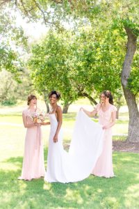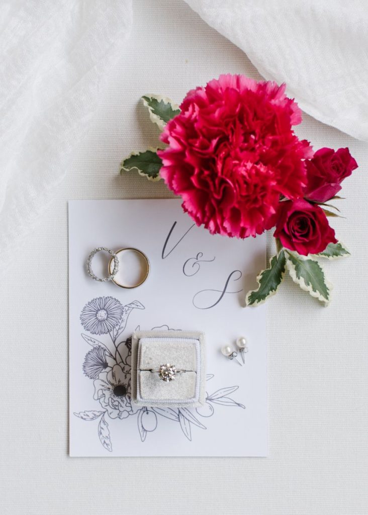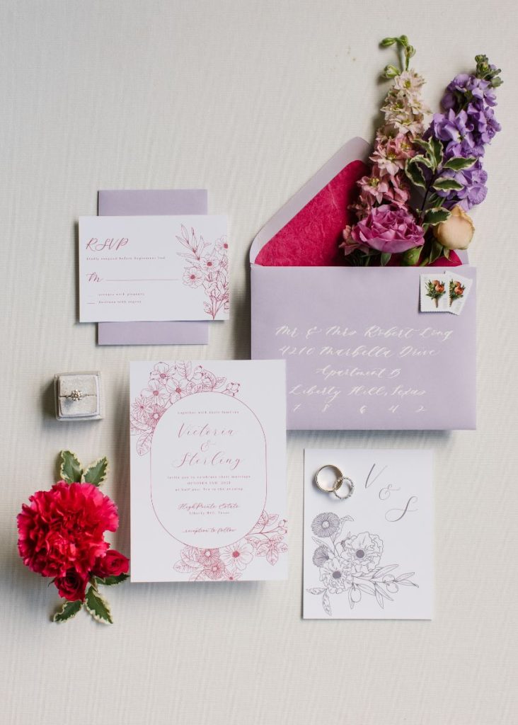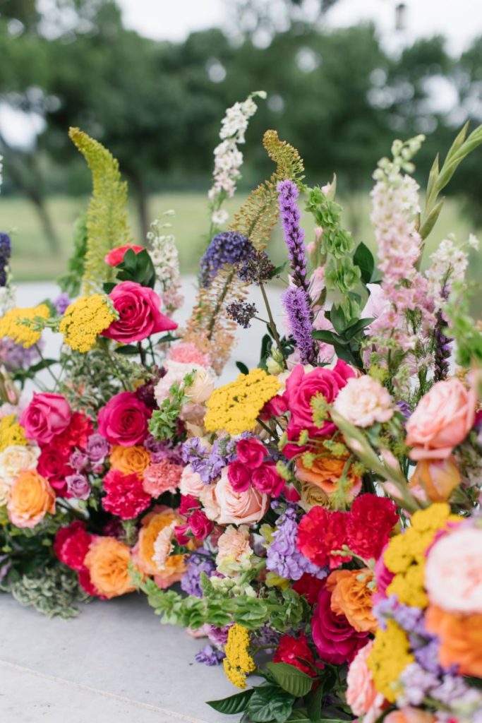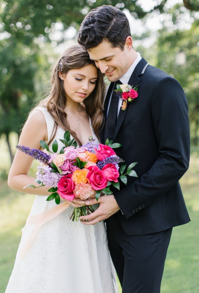 Make your way through the day with stunning inspiration for each part of your wedding celebration. A vivid summertime ceremony makes for a fun, vibrant way to say “I do” in inspiration captured by Janeane Marie Photography in the cutest colorful shots. There are plenty of wide-open spaces at Highpointe Estate where the creatives at Lavender & Lily Floral put their bright blooms to work, but namely in a jaw-dropping crescent-shaped altar installation and corresponding stems that lined the aisle and made up this beautiful bridal bouquet. Lush florals in punch, jewel tones make the perfect backdrop for a summer bride, and this model wows in a simplistic white V-neck gown from a&bé bridal shop Austin with a dreamy, flowing skirt. Her look was paired with a half-up hairstyle along with barely-there makeup and a full, brushed-up brow for chic, high-fashion wedding day glam – all styled by the professional hair and makeup artists at Jose Luis Salon. A pearl drop-necklace and other fine jewelry from Form to Feeling completes her look with a touch of classic, timeless elegance that you simply can’t buy. Beautifully scripted vows by Design to Flourish are ready to be exchanged with the love of your life on the best day ever, and we’re still swooning over the invitation suite and signage they created to give this ceremony inspiration a more modern, romantic vibe. Whether yours will be short and sweet or heartfelt and lengthy, try this brilliant summertime ceremony editorial on for size. Cheers!
