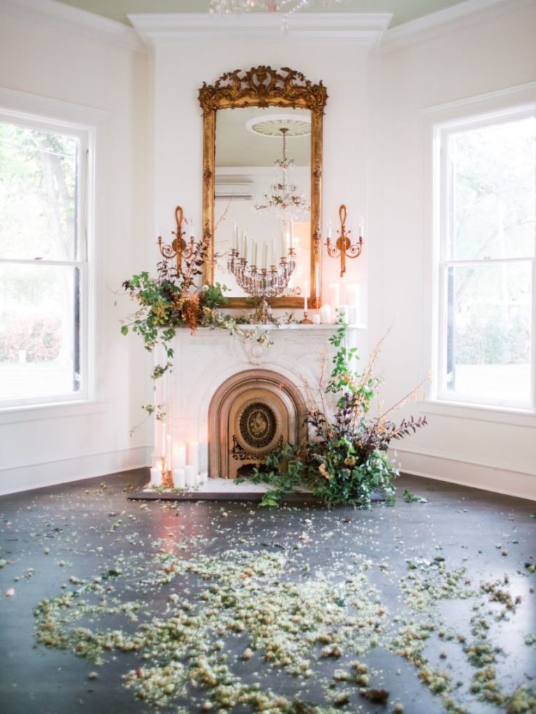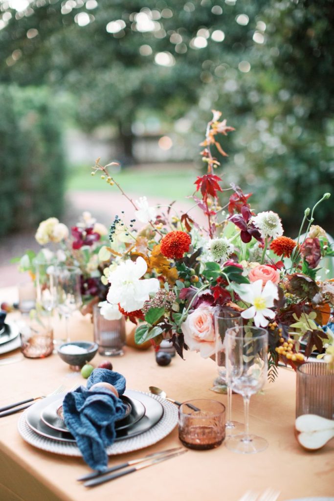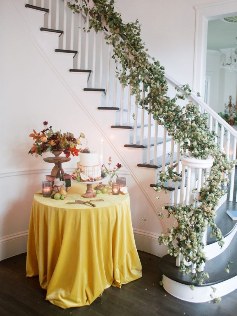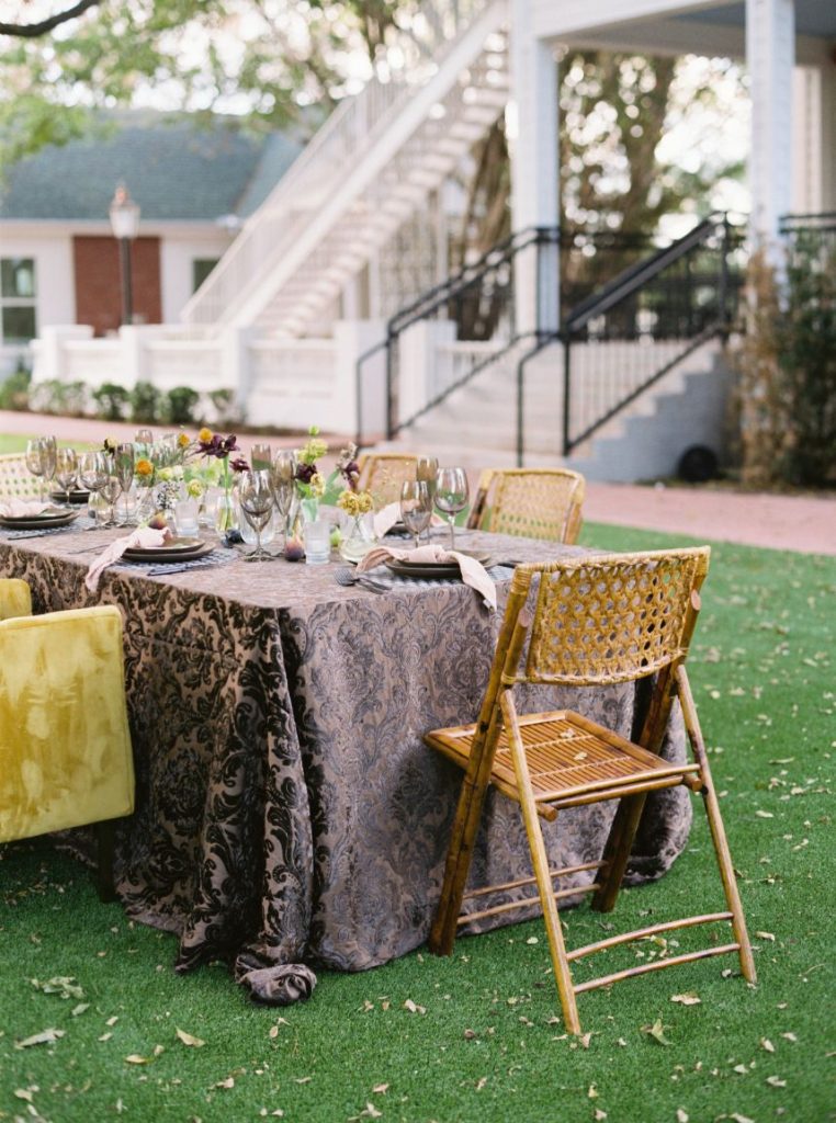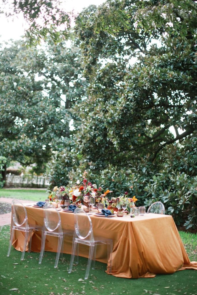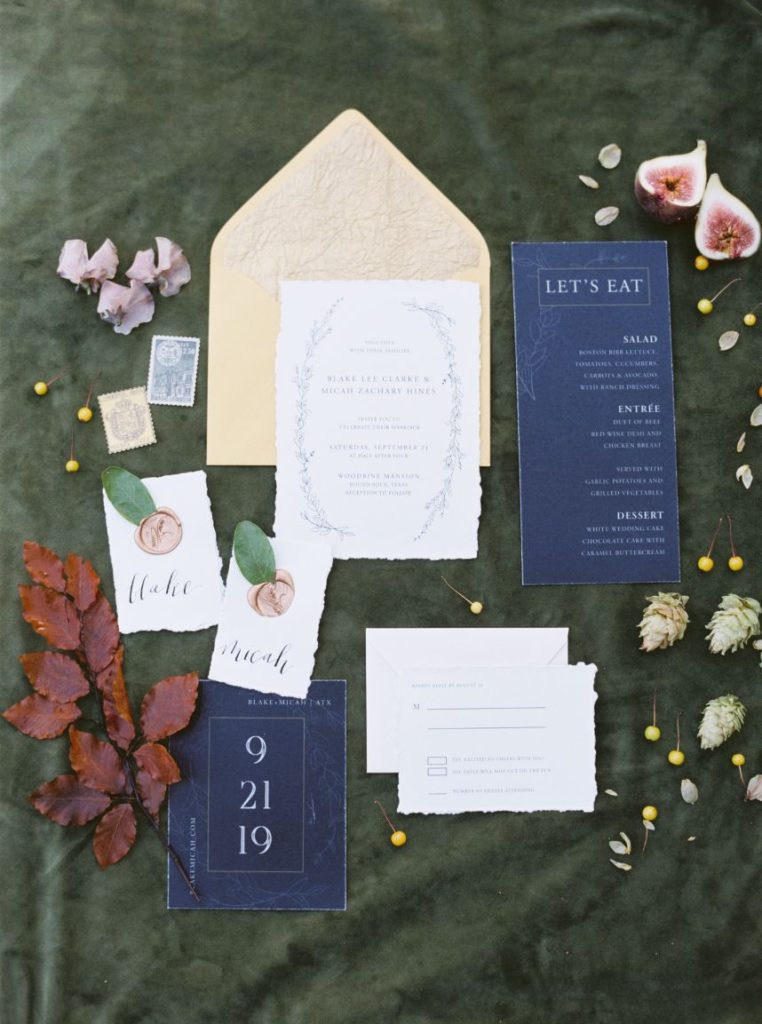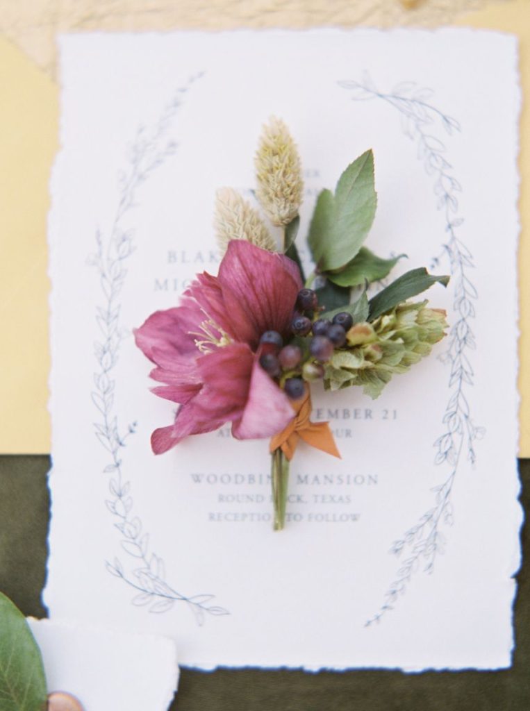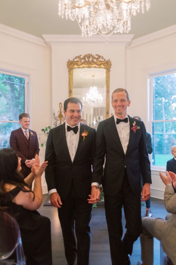 Benjamin and James renewed their vows in one of the most tasteful celebrations we’ve ever seen, set in the timeless luxury of The Woodbine Mansion. They began the celebration with extravagant accommodations at W Austin so stress is at a minimum and relaxation is at an all-time high. Indoor and outdoor weddingscapes alike designed and styled by Pearl Events Austin combine a stunning, spiced palette accented with moody hues of deep teal and burgundy. Setting the scene, modern and vintage décor from Premiere Events create a stylish and inviting tone that is carried out through every aspect down to the cake! Rattan rentals and mustard velvet armchairs add a little retro flair to al fresco reception dining while a luxe beige and black damask tablescape makes flatware and floral centerpieces pop. In another scene, an ochre tablescape adorned by lush fall-toned florals is seated with acrylic ghost chairs for a trendy, modern touch. Benjamin and James couldn’t have had a classier vow renewal which they say is largely in part to their planner, Pearl Events Austin. Read on for a note from the grooms about their favorite memory from the day of, and keep scrolling to see their lovely ceremony for yourself. Cheers to Benjamin and James!