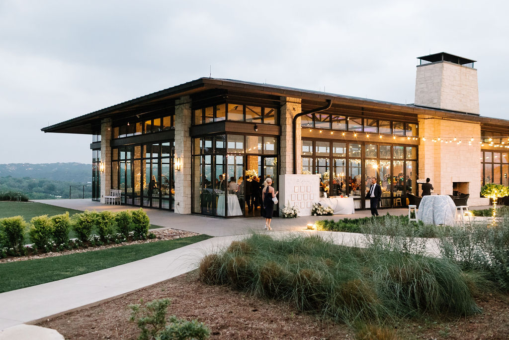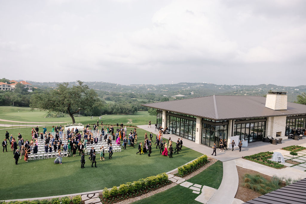 The ceremony, planned to perfection by Pearl Events, took place outdoors at Omni Barton Creek Resort + Spa. White florals lined the aisle, and Blair waited at the base of a glossy white platform overlooking the rolling hills of Austin—a breathtaking scene for their heartfelt vows.