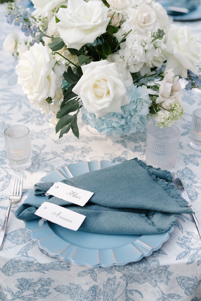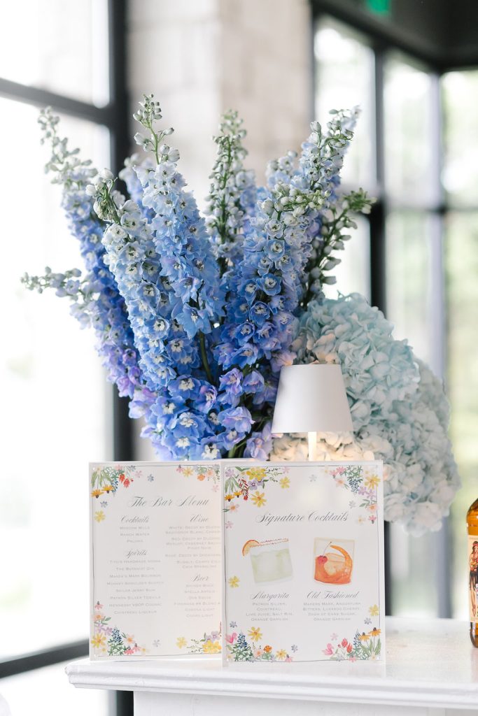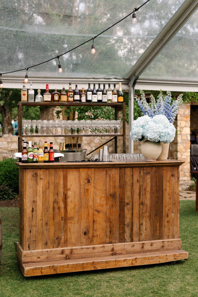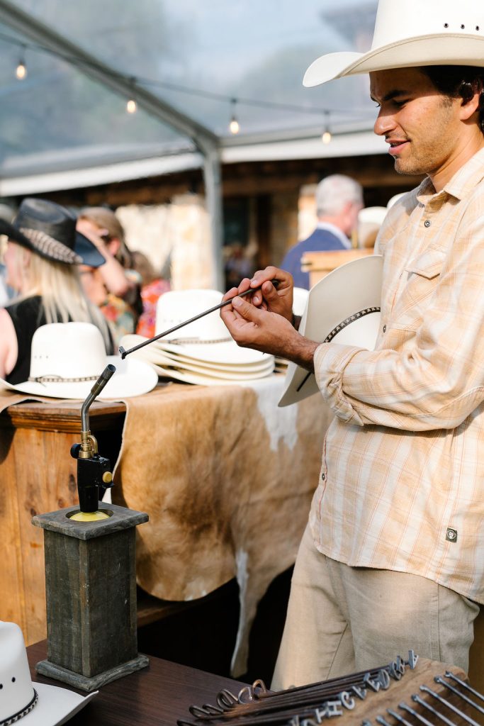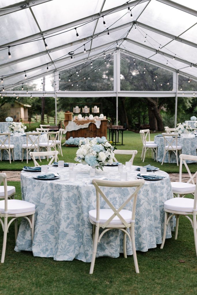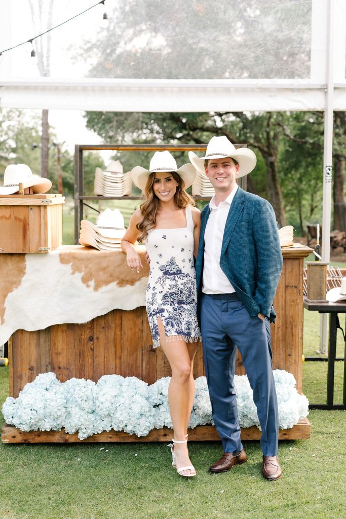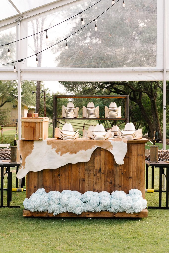 The festivities kicked off with a jaw-dropping, Texas-themed welcome party that set the tone for the celebration ahead. Guests were greeted under a tent adorned with patterned blue floral linens from BBJ La Tavola, creating a vibrant and inviting atmosphere. A custom cowboy hat stand allowed guests to choose and brand their own hats, adding a fun, interactive touch. A rustic wooden bar fit perfectly with the western vibe and kept drinks flowing all evening long.
