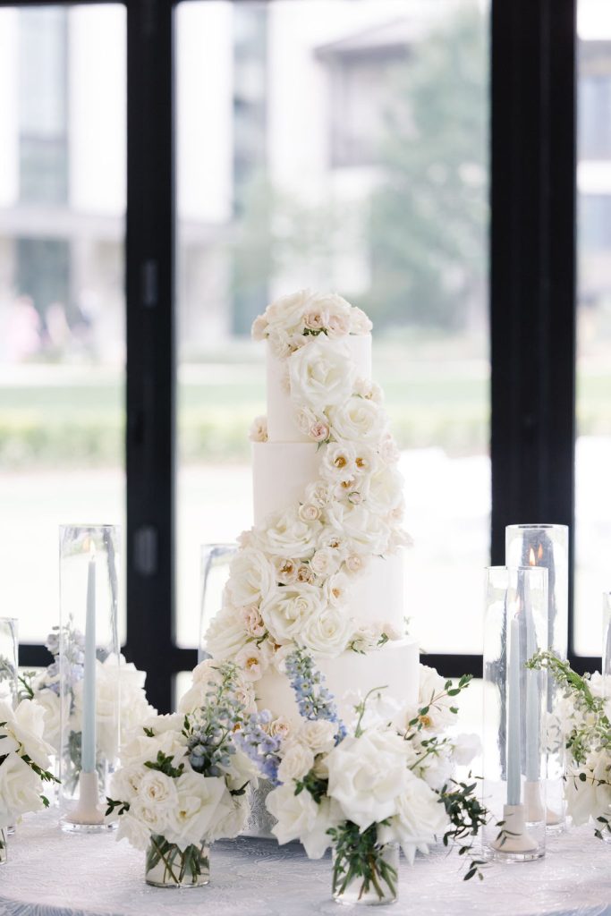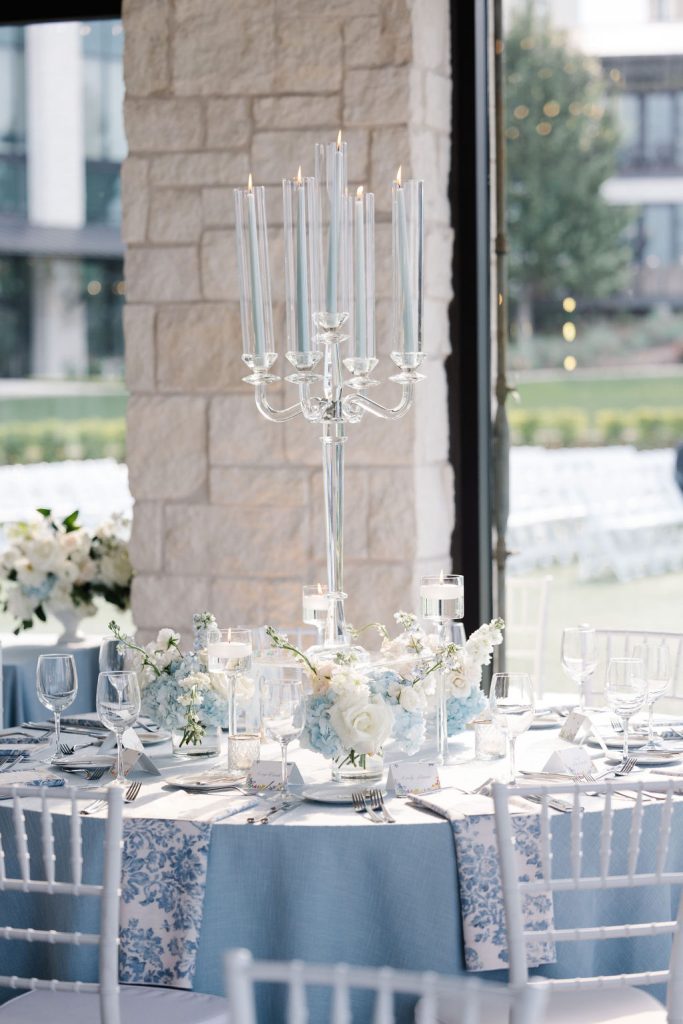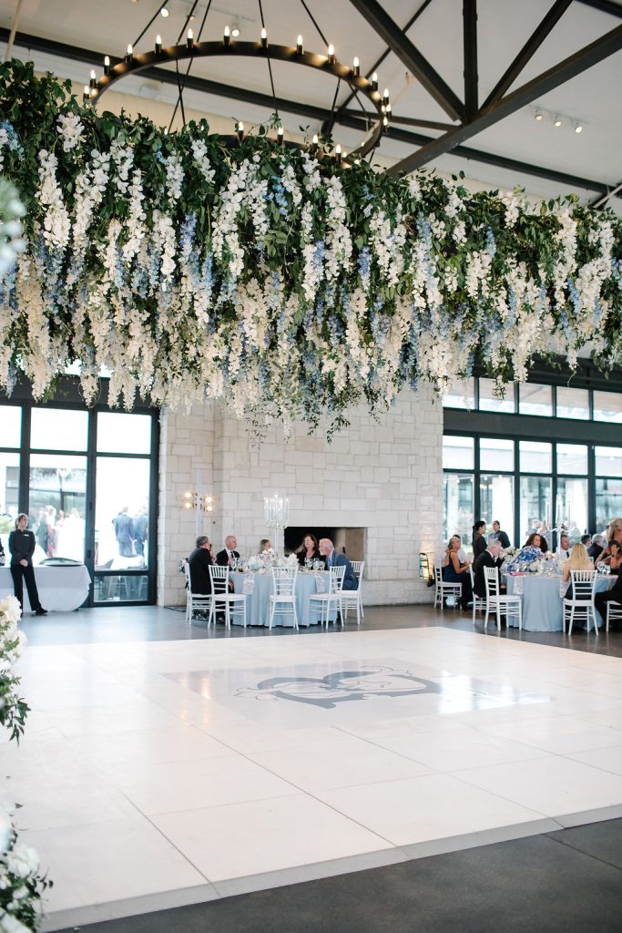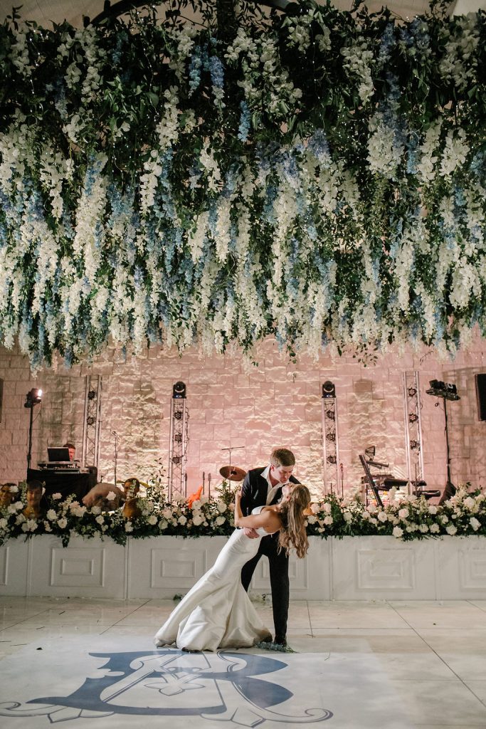 After the ceremony, guests enjoyed cocktails before stepping into a reception space that was nothing short of magical. A jaw-dropping floral installation hung above the dance floor, while the tables were styled with blue tapered candles in crystal candelabras, tall floral arrangements, and woven chargers from Premiere Event Rentals. Personalized matchboxes gave a subtle nod to the couple’s Texas Longhorn pride.