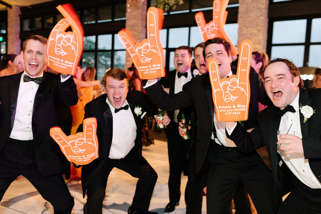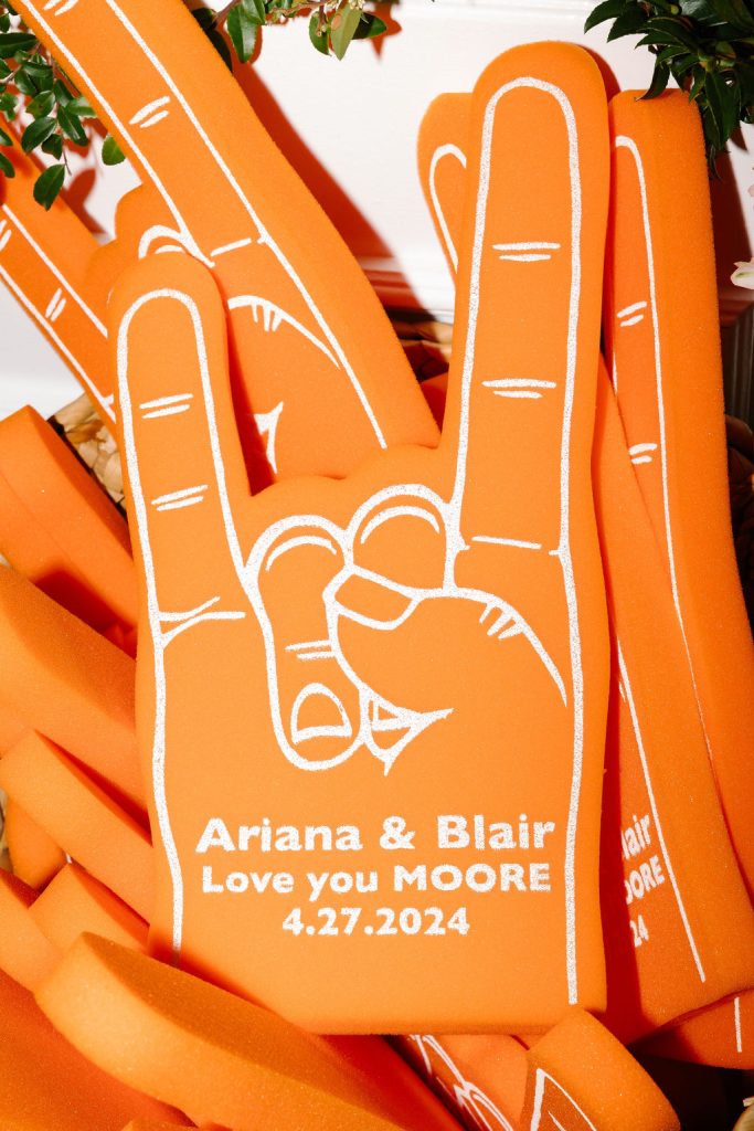 As the night unfolded, guests celebrated with custom foam “Hook ‘Em Horns” fingers, jumbo face cutouts of the couple and their dog, more cowboy hats, and even an ice luge in the shape of the iconic UT Tower courtesy of Full Spectrum Ice. From start to finish, Ariana and Blair’s weekend was a celebration to remember—deeply personal, beautifully styled, and overflowing with joy.