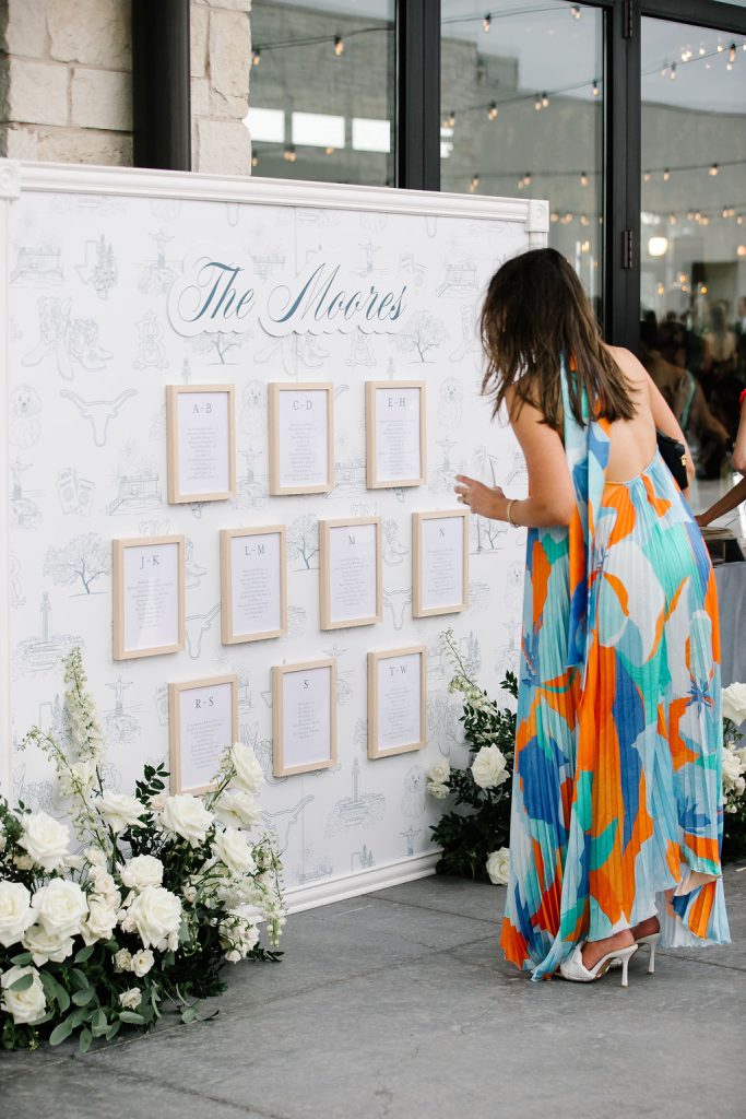 The show-stopping seating chart featured a custom toile-inspired backdrop with illustrations of cowboy boots, longhorns, trees, and other iconic Texas symbols—blending local flair with elegant design.