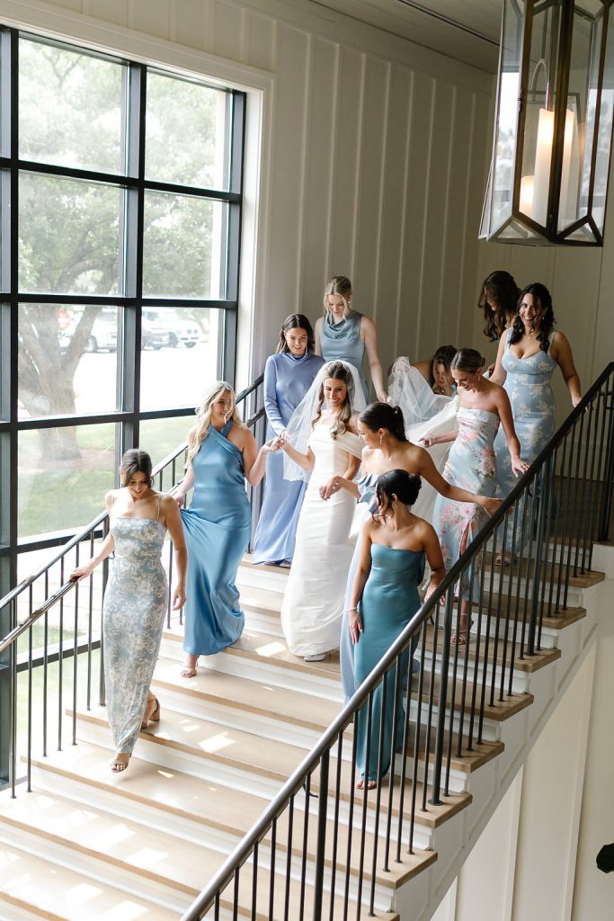 On the morning of the wedding, Ariana and her closest friends got ready in style. She wore feather-trimmed white pajamas while her bridesmaids coordinated in matching blue sets. Hair and makeup teams worked their magic as the anticipation built. Ariana stunned in a sophisticated, off-the-shoulder fitted gown with a bow detail in the back and a flowing veil, while her bridesmaids wore mismatched blue dresses that perfectly complemented the palette.