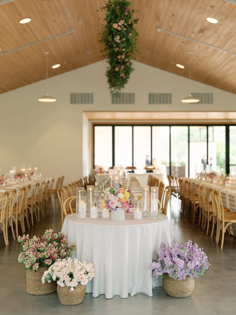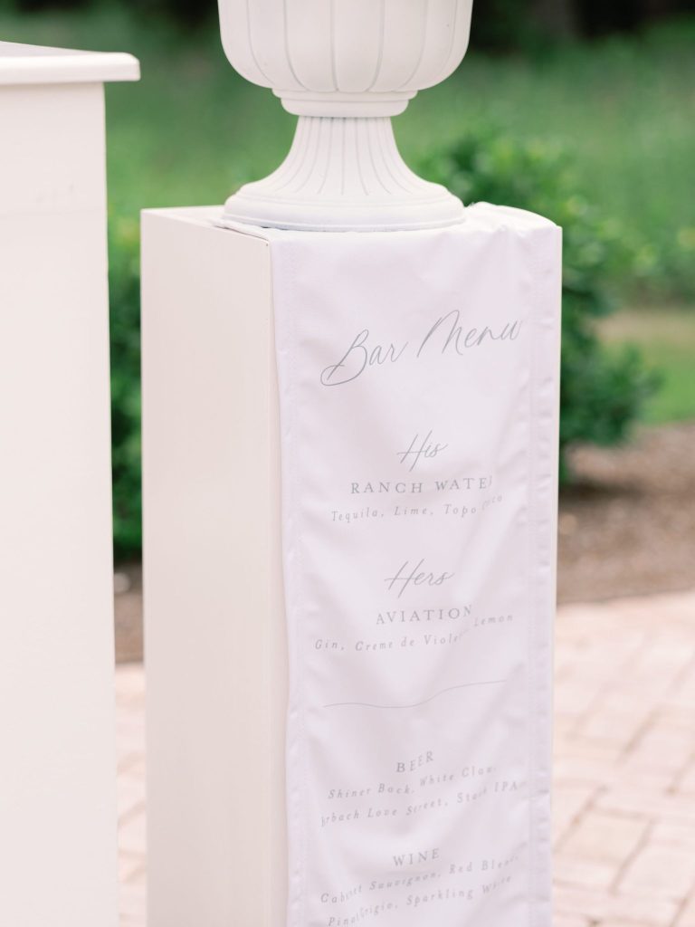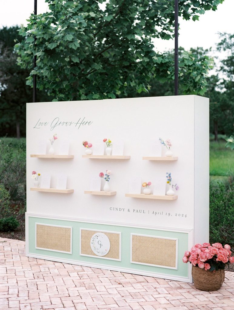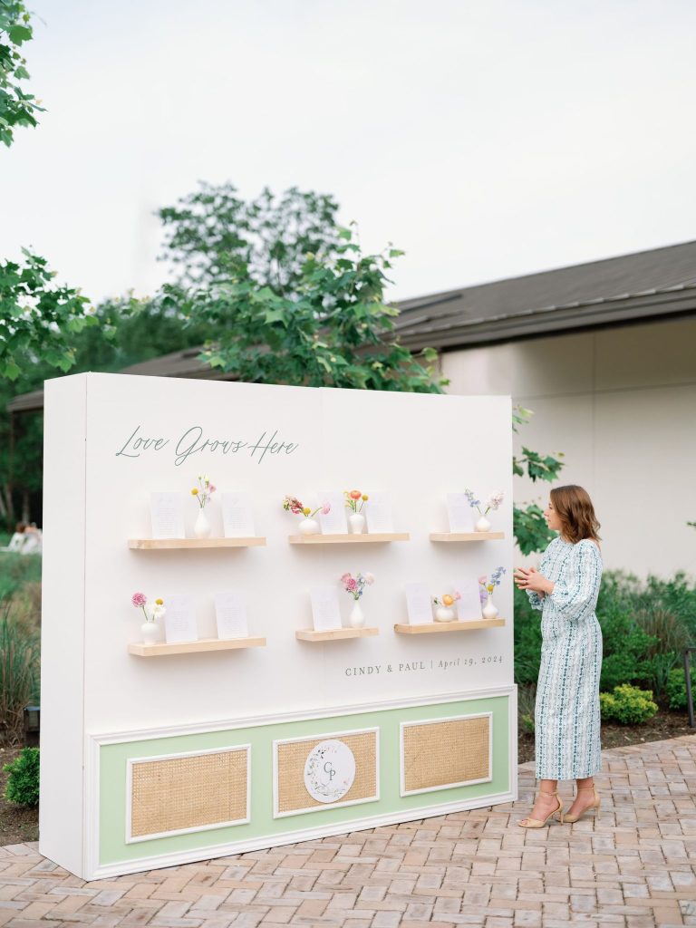 After Cindy and Paul shared their first look, it was time to head to the stunning gardens for the ceremony. Surrounded by beautiful blooms that towered above them, the couple’s garden ceremony was like a dream. Cocktail hour followed in the courtyard, where Soho Catering and Consulting served delicious small bites. The lawn featured garden tables with fringe umbrellas and cozy lounge chairs, inviting guests to relax and mingle. Before heading into the reception hall, guests could find their seats at the breathtaking seating chart created by Design To Flourish.
