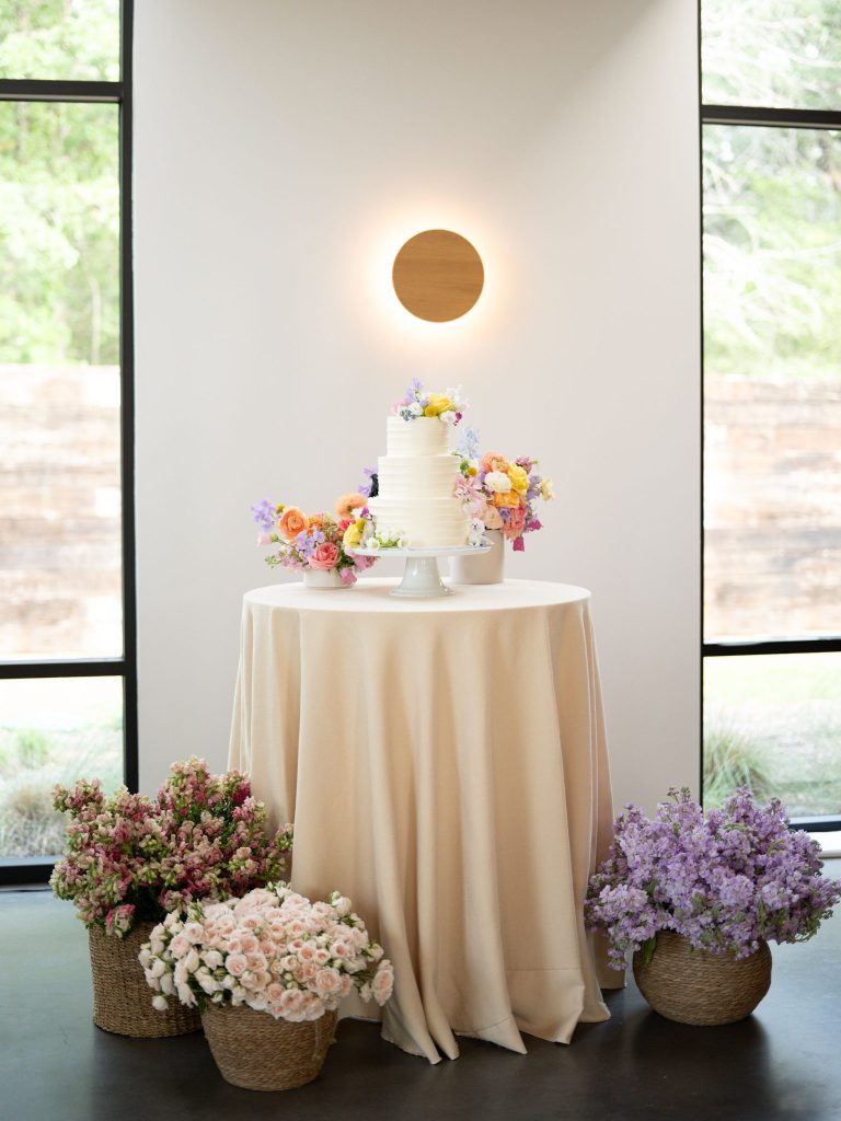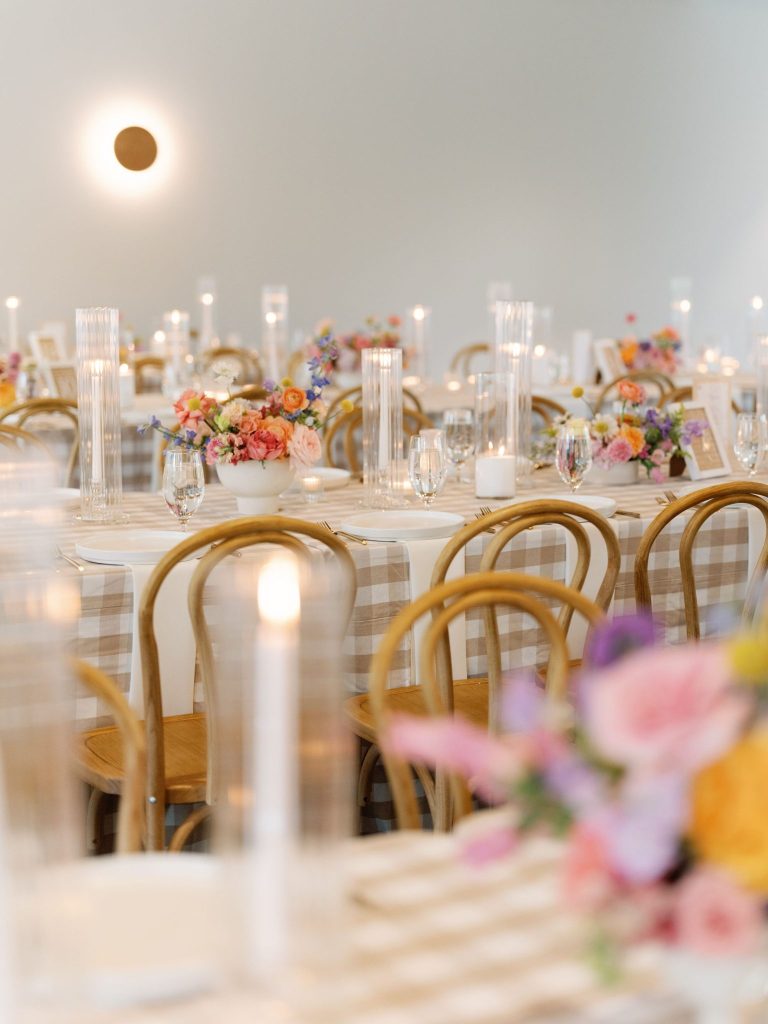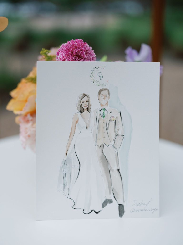 Bianca Nichole and Co., the wedding planner, transformed the reception hall into a magical indoor garden. Tables were dressed in Premiere Event’s gingham tablecloths, with candles and blooms beautifully adorning each one. Floral clouds suspended from the ceiling created an ethereal atmosphere that left guests in awe. The Rademachers had a custom dance floor, and wicker baskets overflowing with florals were scattered throughout the space. Guests were free to enjoy both the indoor and outdoor areas of The Grand Lady; some danced the night away, while others admired live fashion sketches by Vogue Vignette. The celebration wouldn’t have been complete without the classic three-tier wedding cake and a steak inspired groom’s cake by Michelle’s Patisserie.