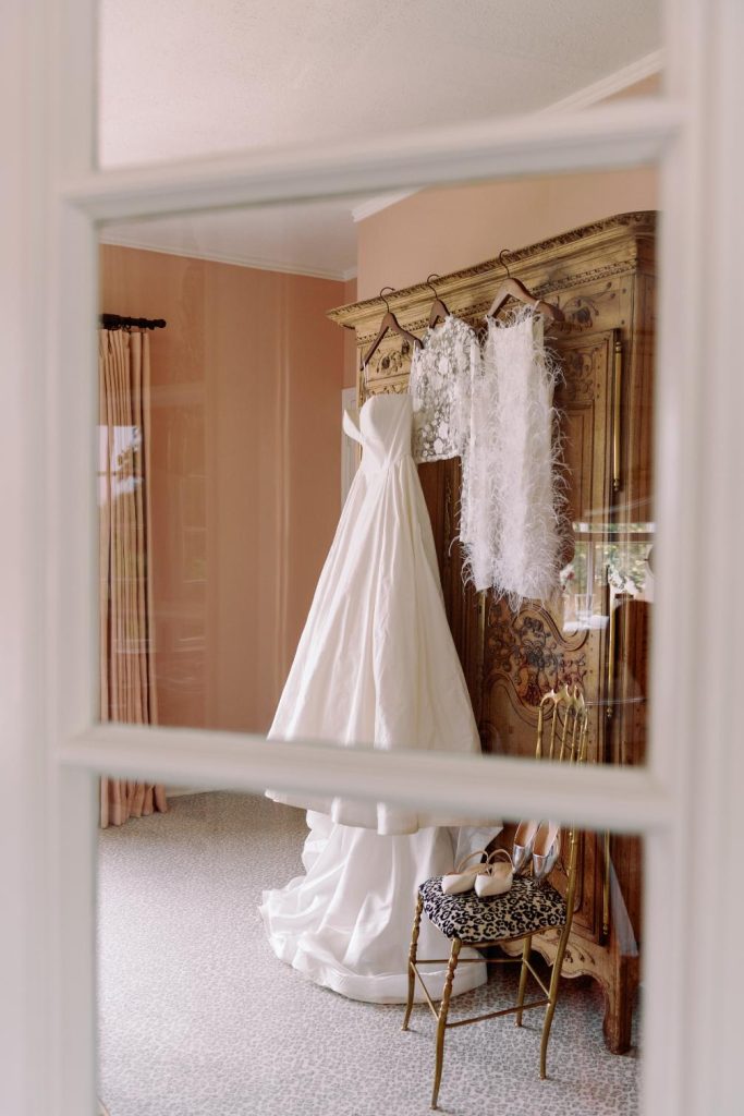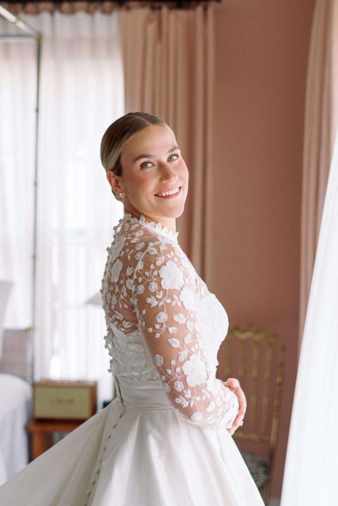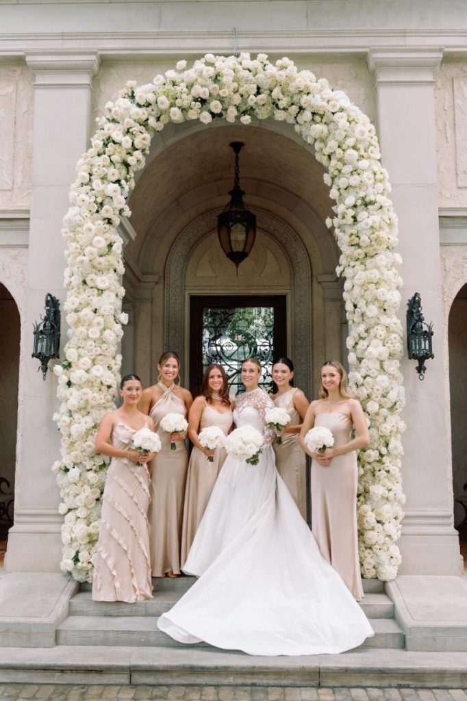 The day began with a quiet, intimate moment as Elena’s wedding gown hung gracefully beside her chic reception looks, each detail perfectly curated to match the sophisticated tone of the event. Her bridesmaids stunned in champagne-hued gowns, creating a cohesive and refined bridal party look that set the stage for the beauty to come.