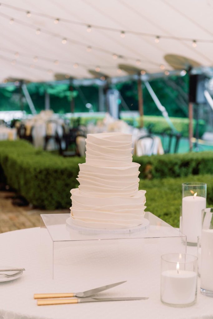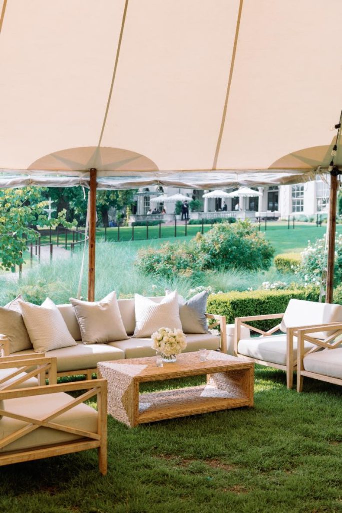 As the evening unfolded, the reception carried the same air of elegance and celebration. Underneath a dreamy tent filled with soft lighting and romantic white floral centerpieces, the space came alive thanks to BBJ La Tavola and Premiere Events, who elevated the design with luxe linens and modern décor. Lounge areas provided cozy spaces for guests to gather, while tablescapes featured chic details that complemented the garden-like setting.