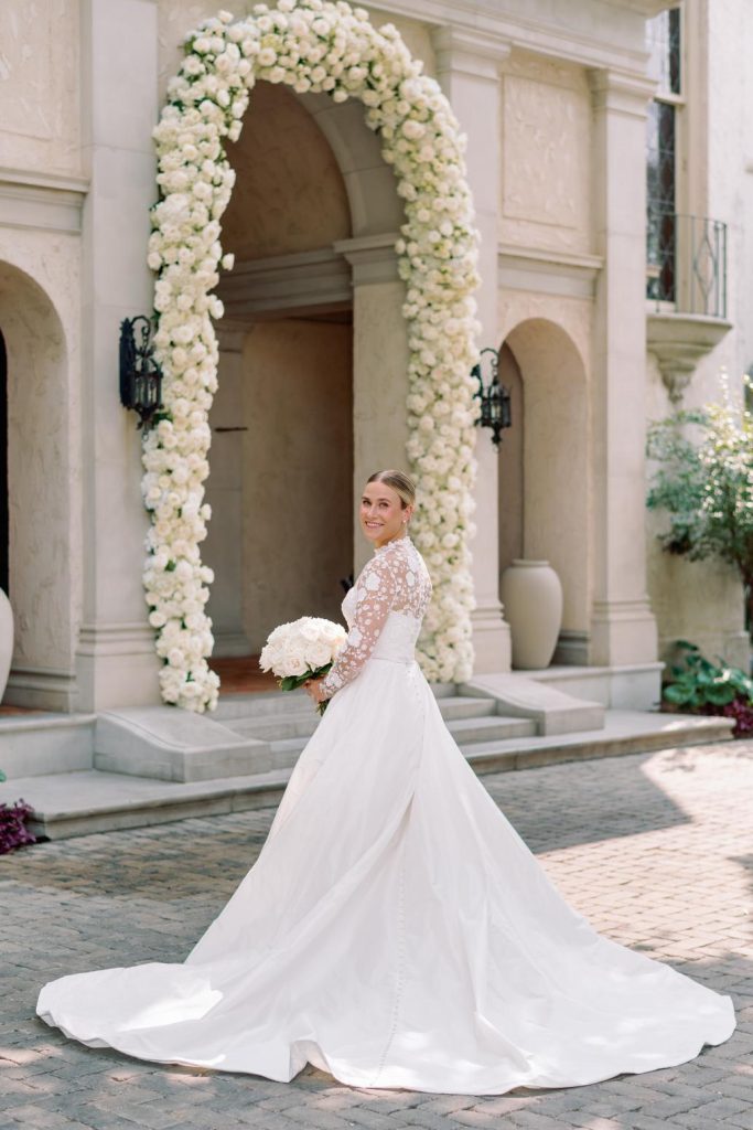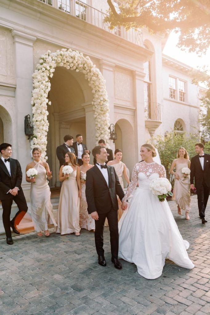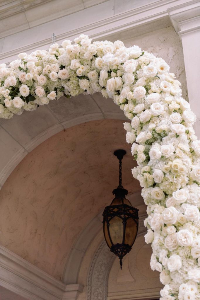 Guests were welcomed to a stunning ceremony framed by a dramatic floral arch of white roses, crafted by Bouquets of Austin. The grand entrance was as magical as it was memorable, with the couple saying “I do” surrounded by lush blooms, family, and friends.