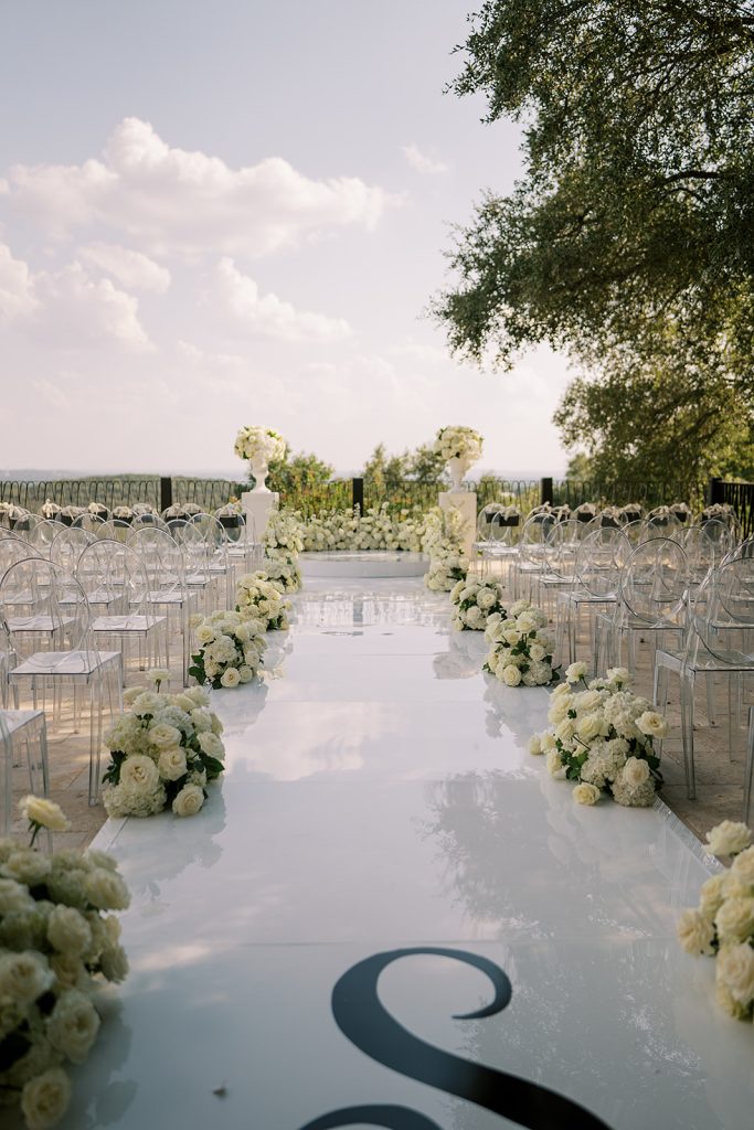 Clear ghost chairs adorned with delicate ribbon details kept the design light and modern, allowing the florals and the panoramic Hill Country views to take center stage. The result was a ceremony setting that felt effortlessly sophisticated.