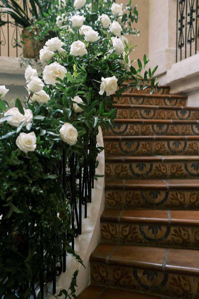 Guests gathered on Villa Antonia’s iconic terrace overlooking the rolling hills for a ceremony that felt both grand and intimate. A glossy white aisle runner lined with abundant white blooms created a striking focal point, leading to the altar framed by romantic arrangements from Bouquets of Austin.