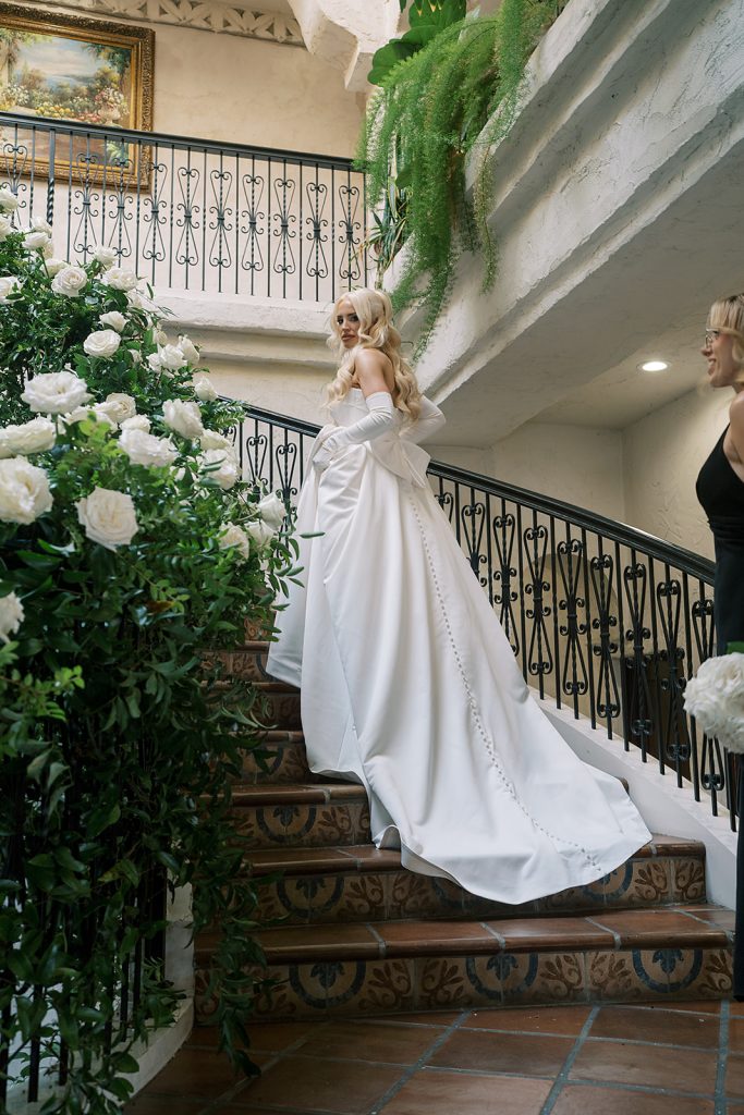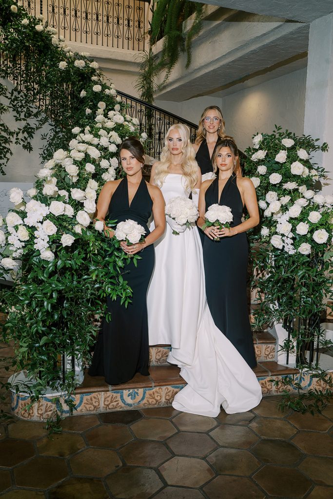 Hayley looked stunning in a structured bridal gown that paired beautifully with her bouquet of soft white roses, while Kobe and his groomsmen embraced timeless black tuxedos for a polished, classic look. The bridesmaids complemented the palette in elegant black dresses, creating a chic contrast to the all-white floral design woven throughout the celebration.
