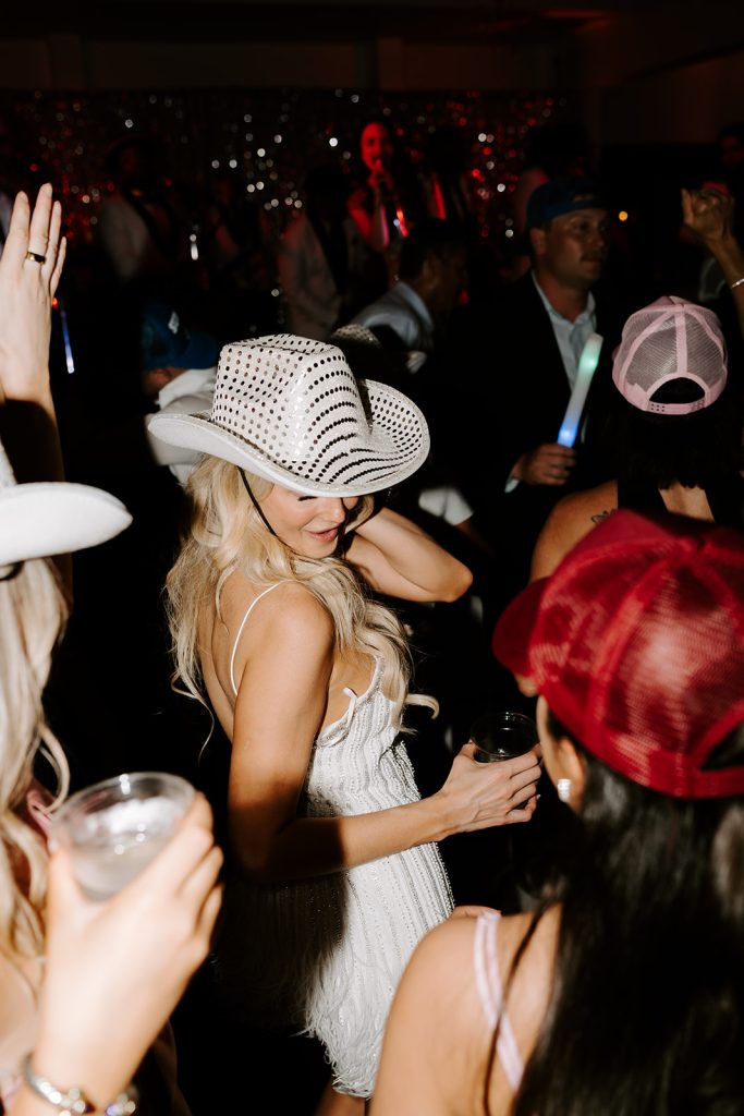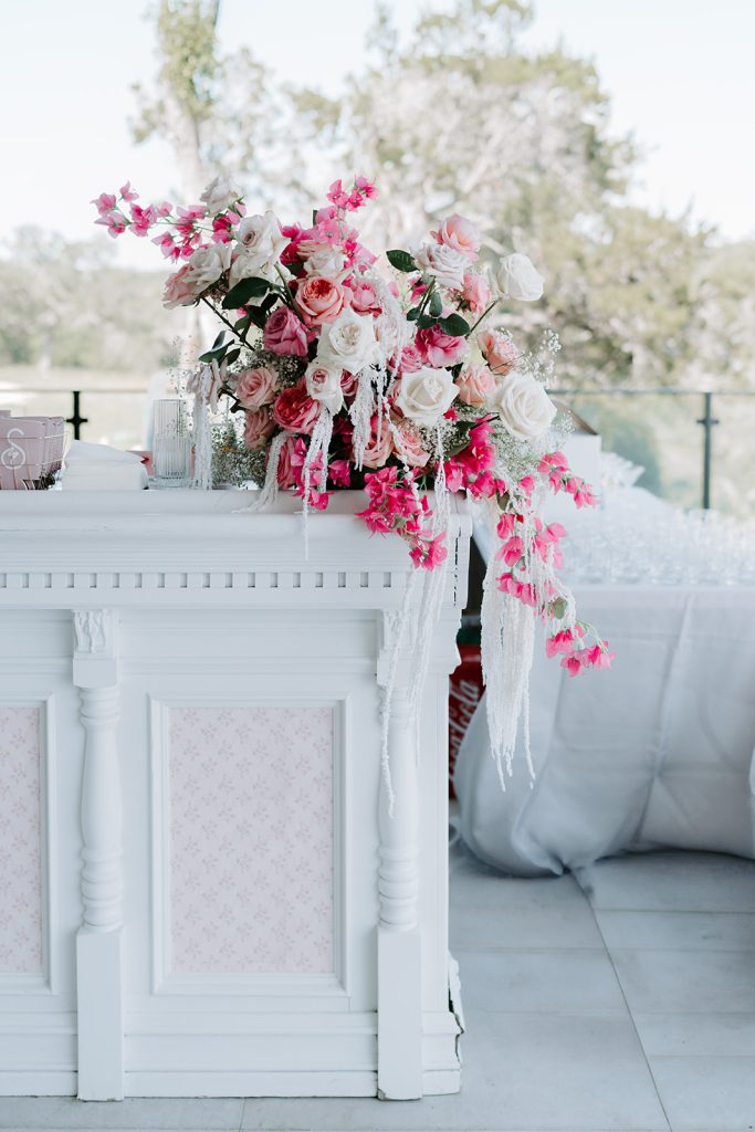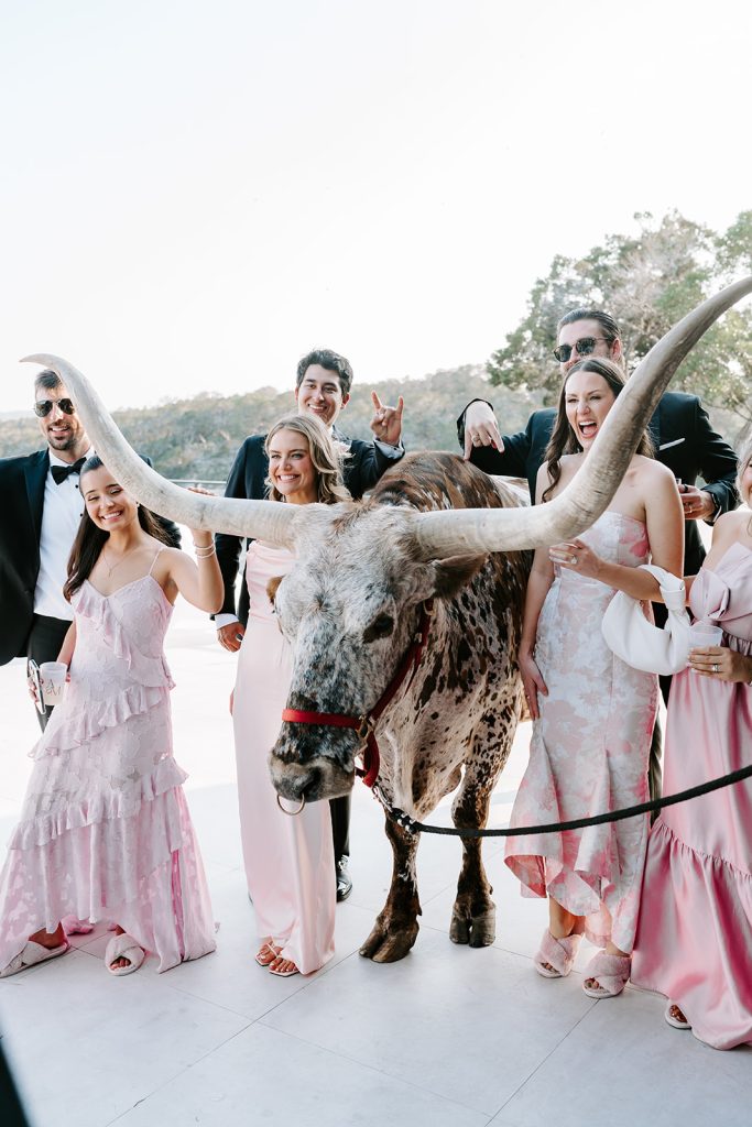 The Summerhills hosted a breathtaking outdoor ceremony on the terrace, offering panoramic views of the sprawling estate. The venue was elegantly decorated with lush pink and white floral arrangements alongside rentals from Premiere Events, creating a stunning backdrop. In a nod to their Texas roots, Bevo, the University of Texas’ beloved live mascot, made a special appearance, delighting guests. The day’s theme, “Hooked on You,” was a clever Texas pun that perfectly captured the spirit of their celebration.