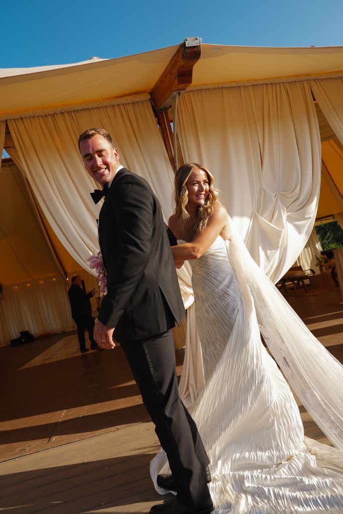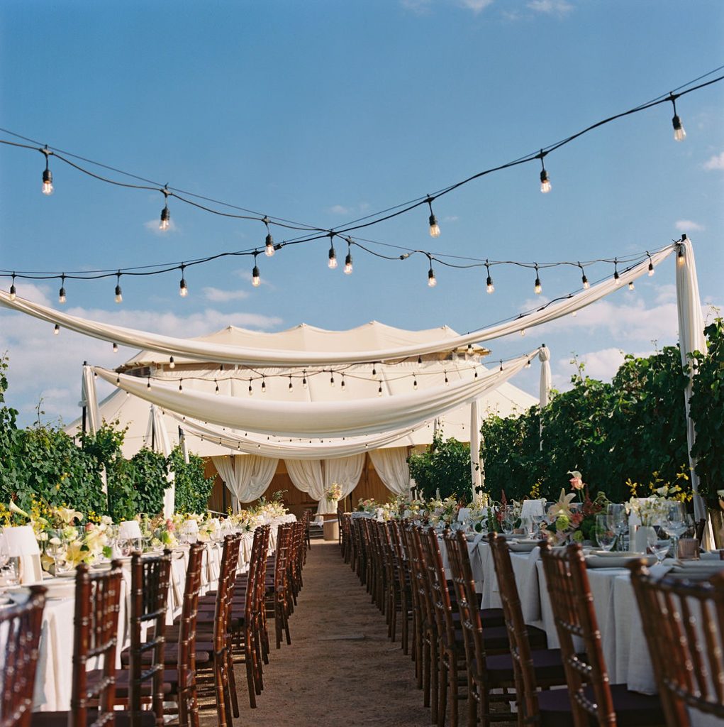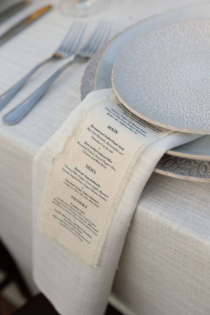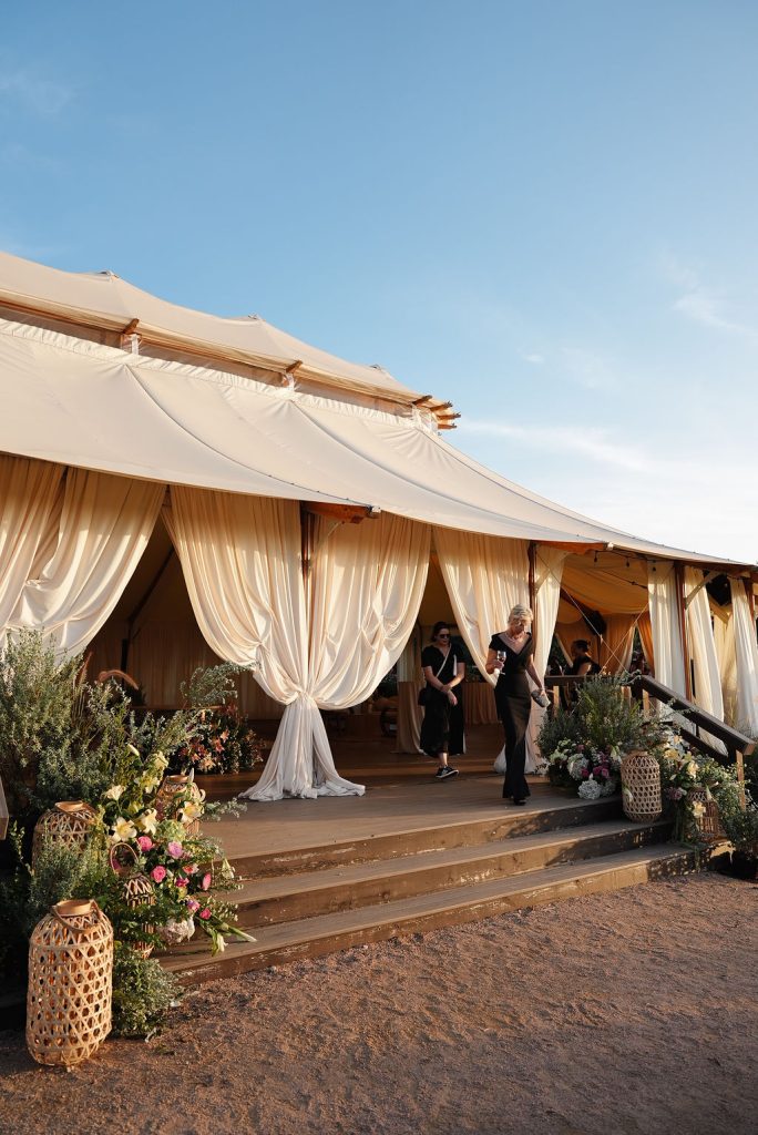 As golden hour arrived, guests enjoyed cocktail hour beside a serene seating display accented with sculptural floral arrangements and custom paper escort cards — a preview of the effortlessly elegant reception to follow. Beneath sweeping draped canopies and twinkling café lights, dinner was served along a vineyard-style table adorned with neutral linens, organic centerpieces, and glowing table lamps.