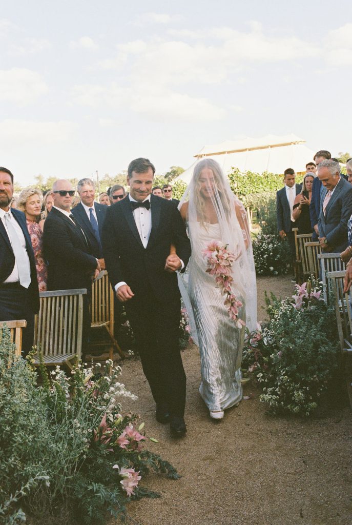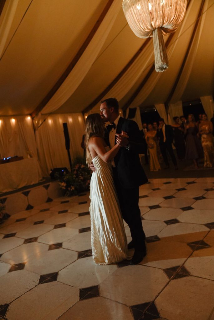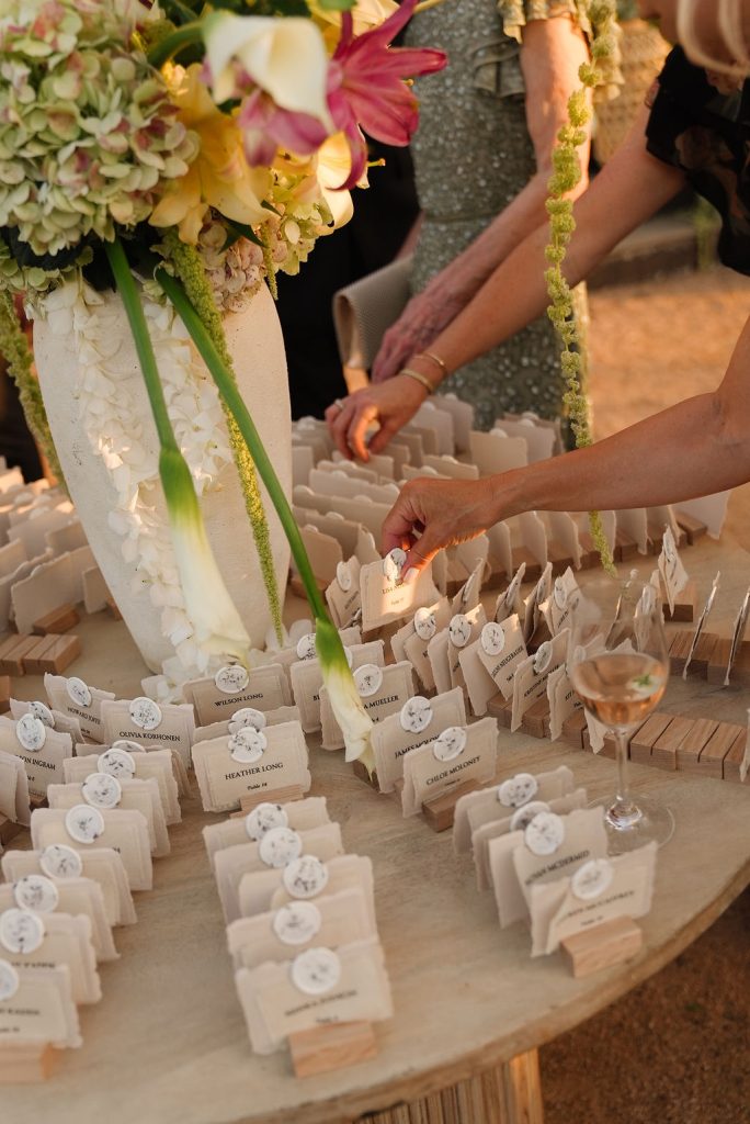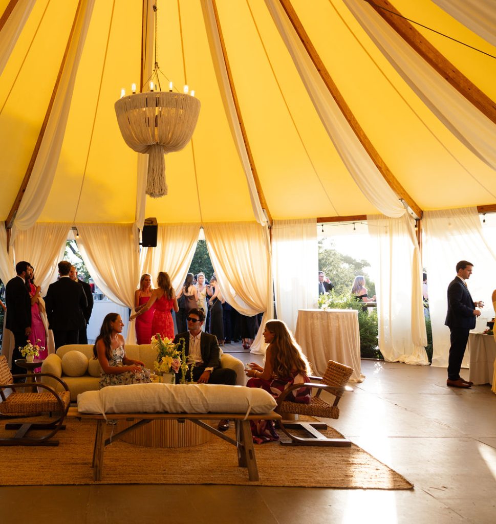 As golden hour arrived, guests enjoyed cocktail hour beside a serene seating display accented with sculptural floral arrangements and custom paper escort cards — a preview of the effortlessly elegant reception to follow. Beneath sweeping draped canopies and twinkling café lights, dinner was served along a vineyard-style table adorned with neutral linens, organic centerpieces, and glowing table lamps.